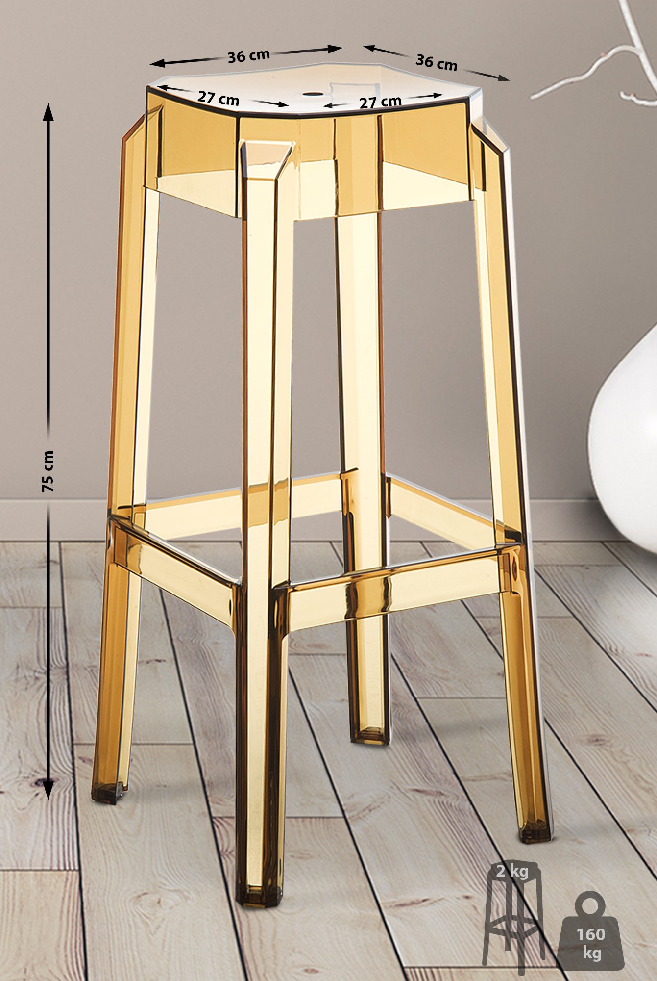 Mit einer Sitzhöhe von 75 cm und einer umlaufenden Fußstütze bieten sie besonderen Komfort. Die Tresenhocker sind stapelbar, sodass sie sich platzsparend verstauen lassen. Die Hocker bestehen entweder aus hochwertigem, glänzendem Nylon oder aus klarem, transparentem Polycarbonat.