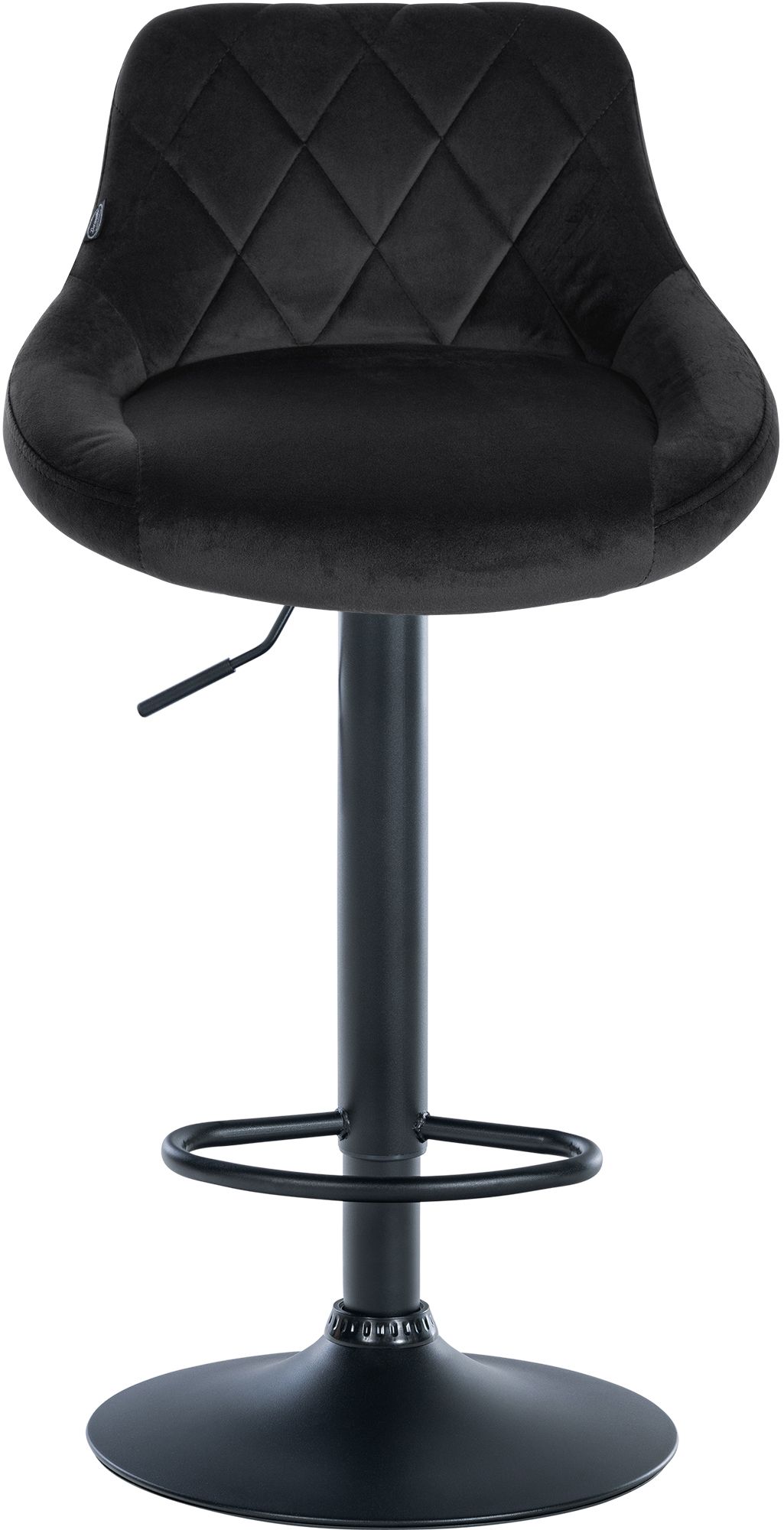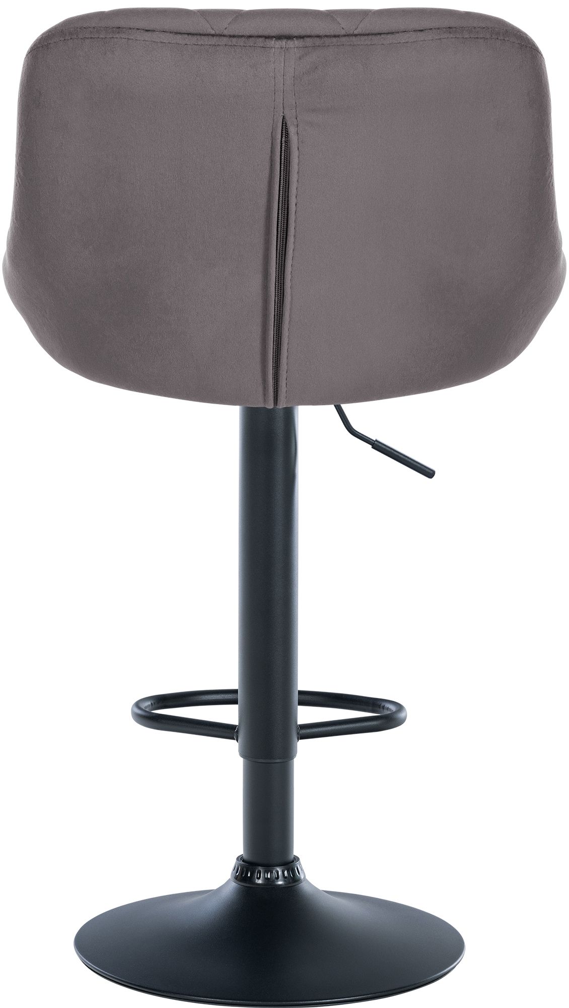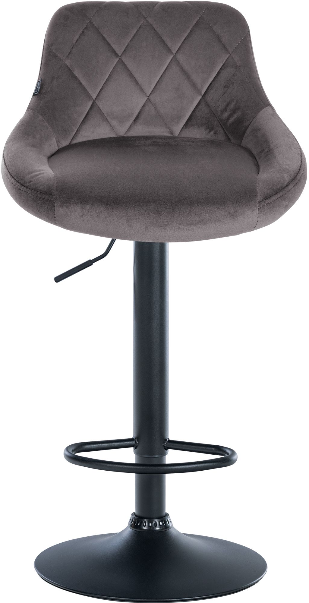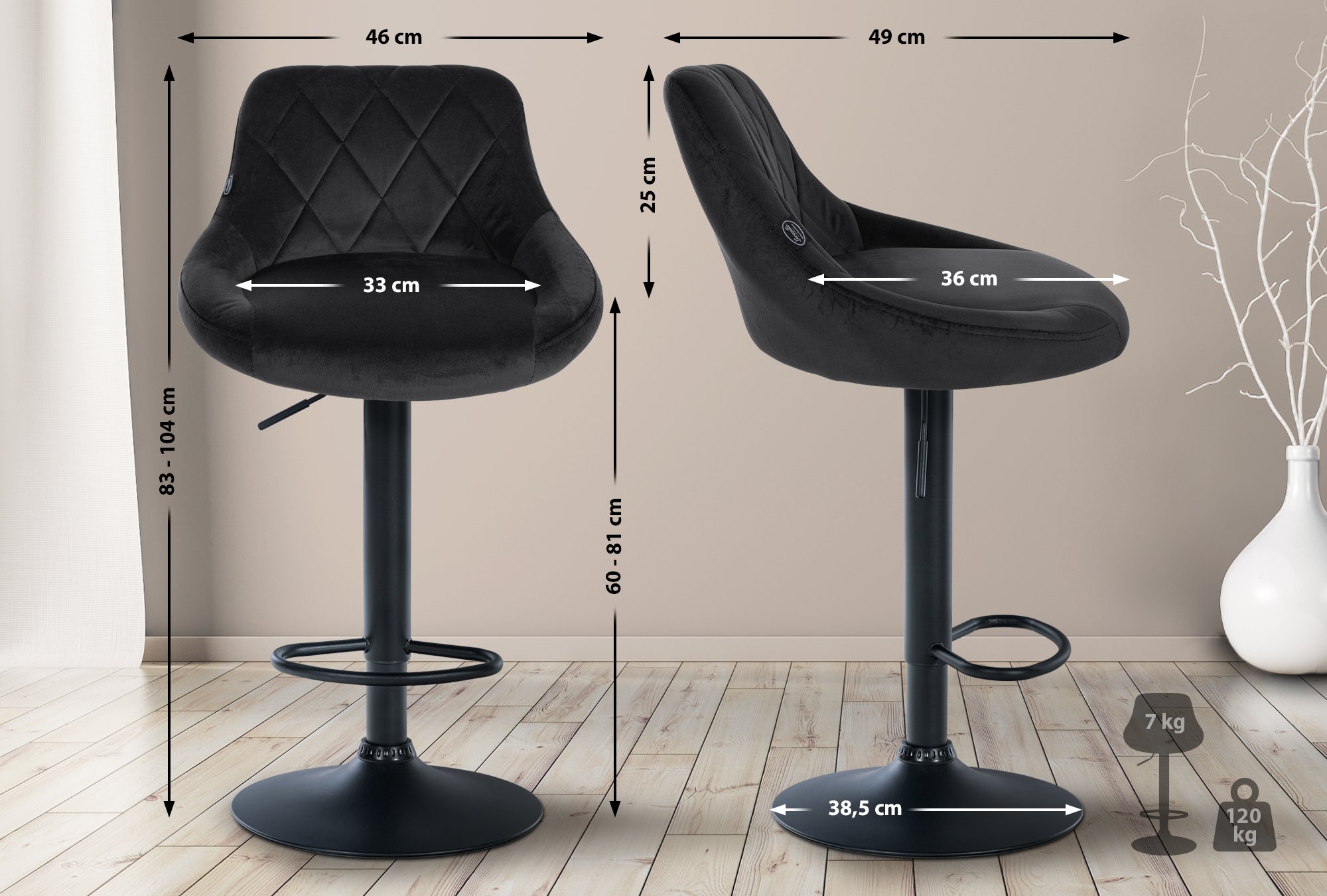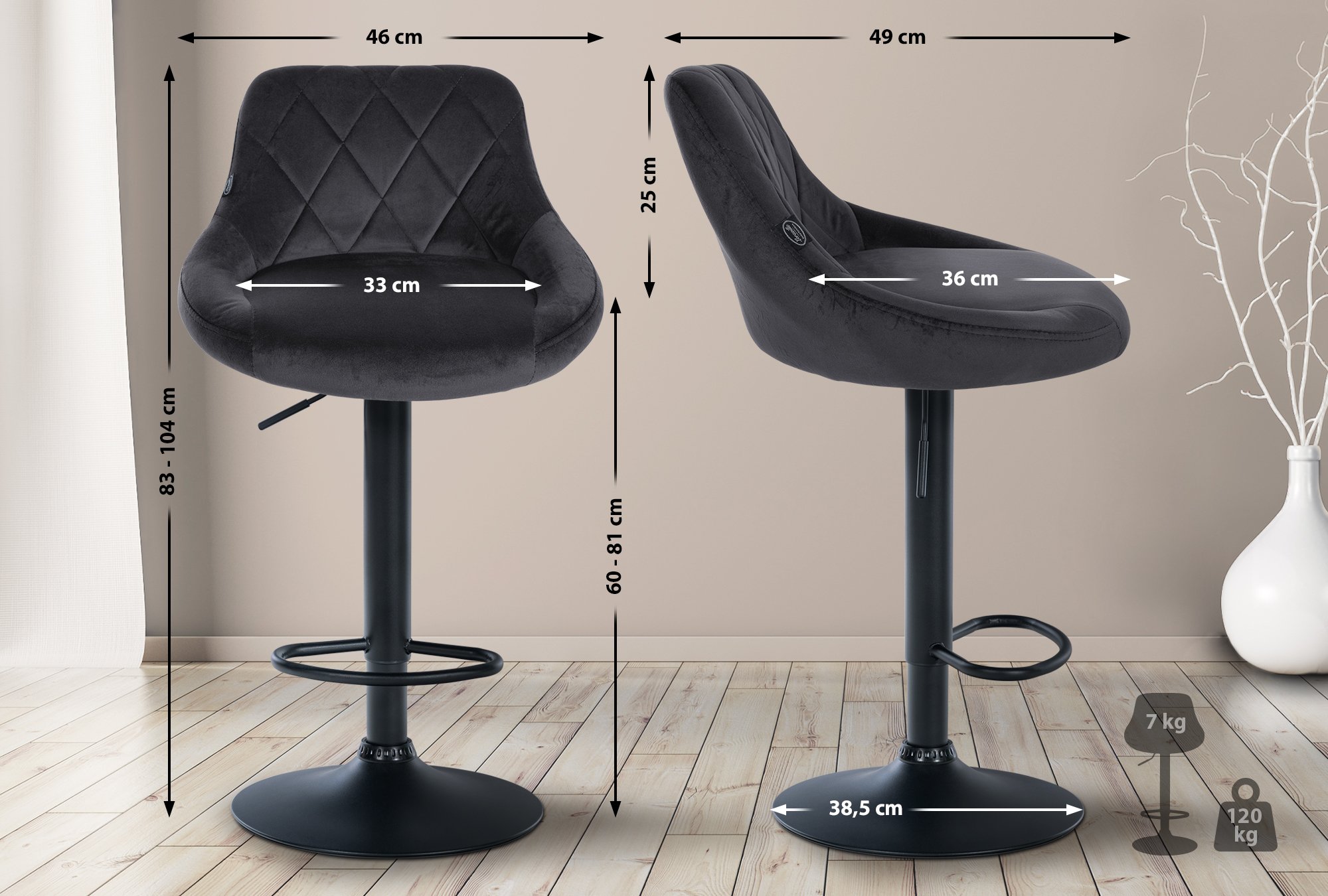 Diese Hocker bestechen durch ihr stilvolles Design. Der Sitz ist mit Samtstoff bezogen und mit aufwendigen Ziernähten verarbeitet. Mithilfe des Gaslifts lässt sich dieses Modell in der Wunschhöhe stufenlos einstellen, sodass er für jede Thekenhöhe bestens geeignet ist. Die Fußstütze, die einen hervorragenden Sitzkomfort gewährleistet, ist synchron mit der Höhe des Sitzes verstellbar. Die Sitzfläche ist mit der Fußablage um 360° drehbar. Das Gestell besteht aus Metall, unter dem Trompetenfuß befinden sich Bodenschoner, die ein Verkratzen des Bodens verhindern.