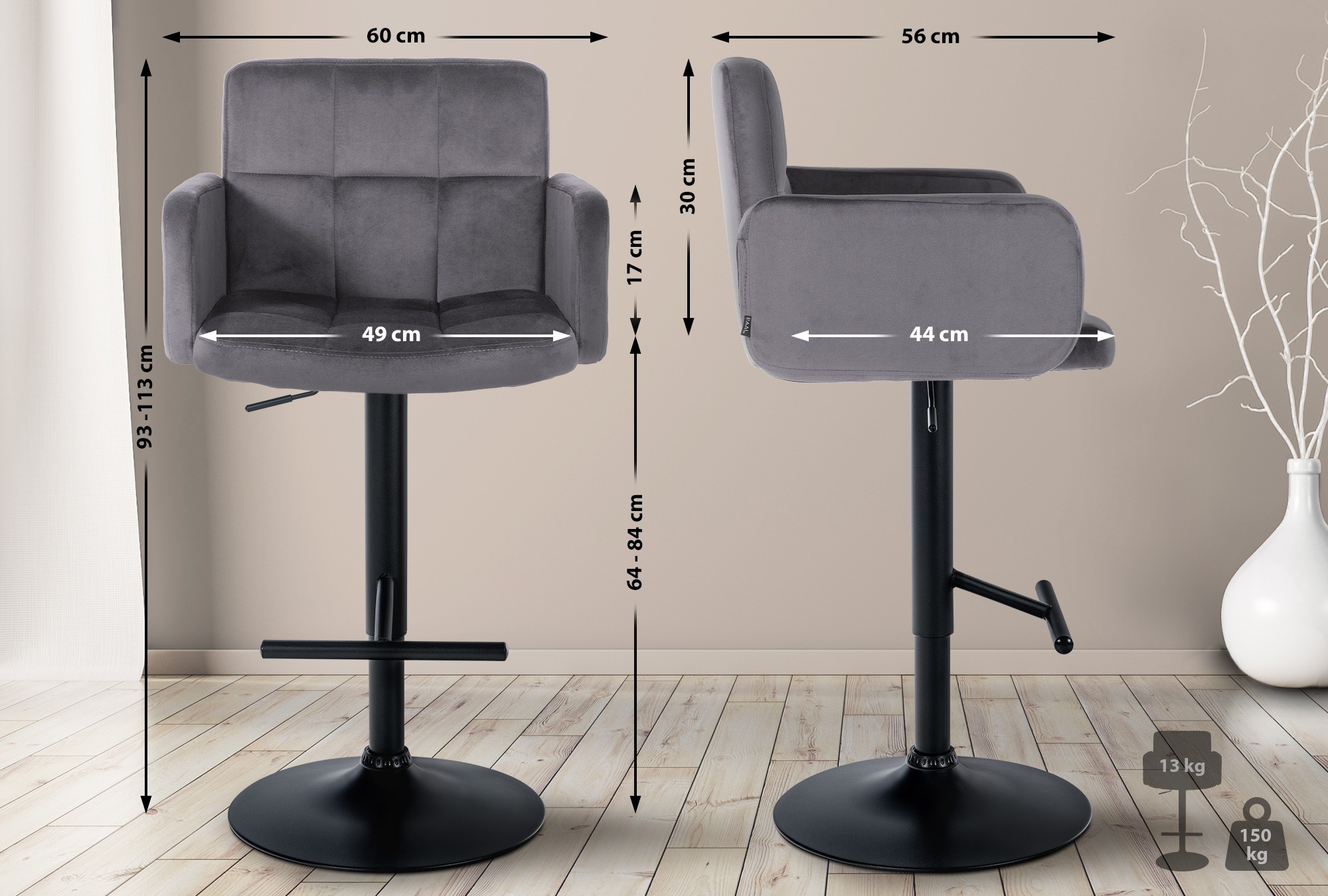 Die weich gepolsterten Sitzschalen und die Rückenlehnen sorgen für angenehmes Sitzen und entlasten den unteren Rücken. Integrierte Fußstützen bieten zusätzlichen Komfort, indem sie den Füßen entspannte Ablageflächen bieten. Neben der verstellbaren Sitzhöhe sind die Barhocker um 360° drehbar.