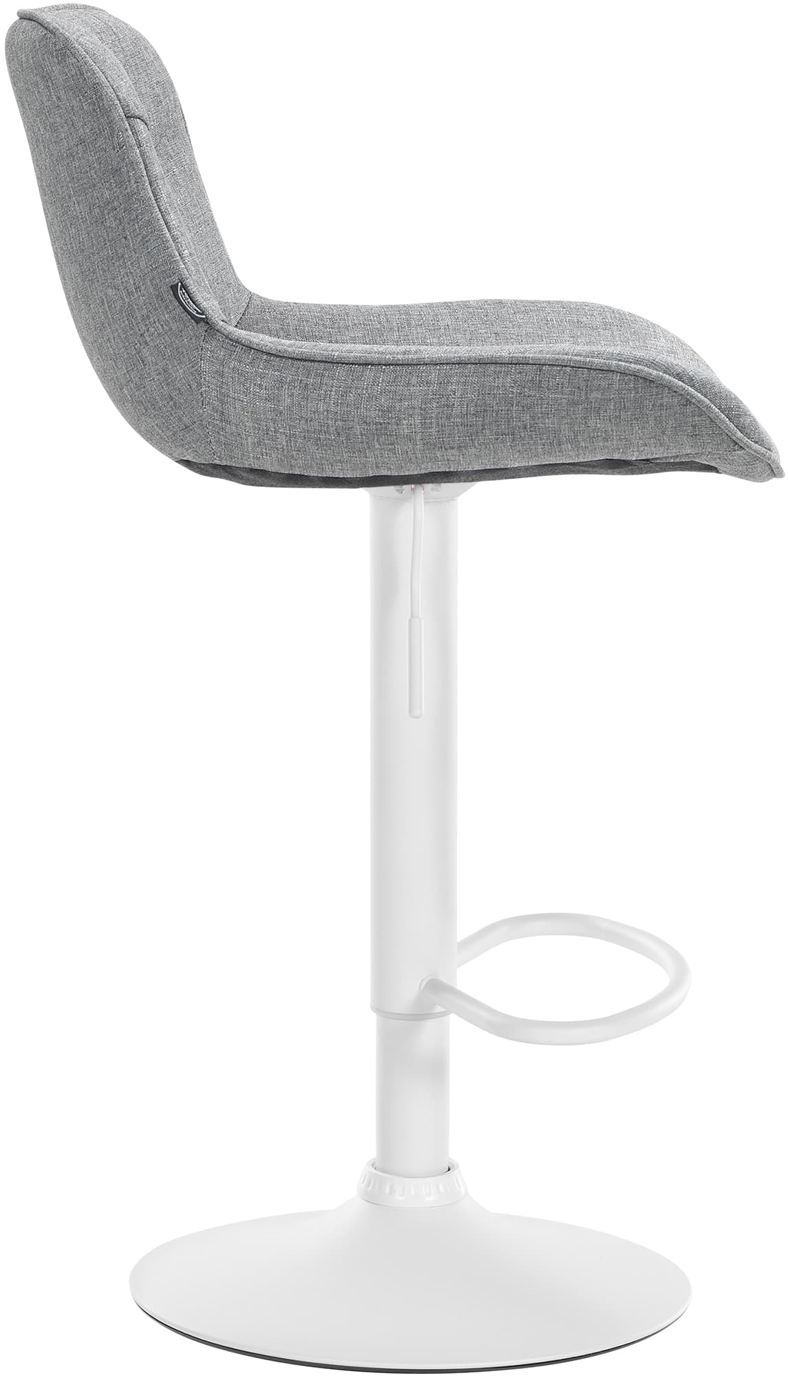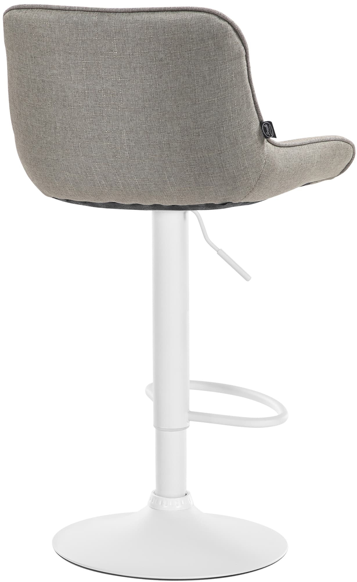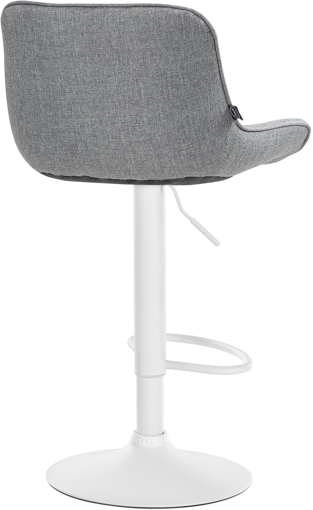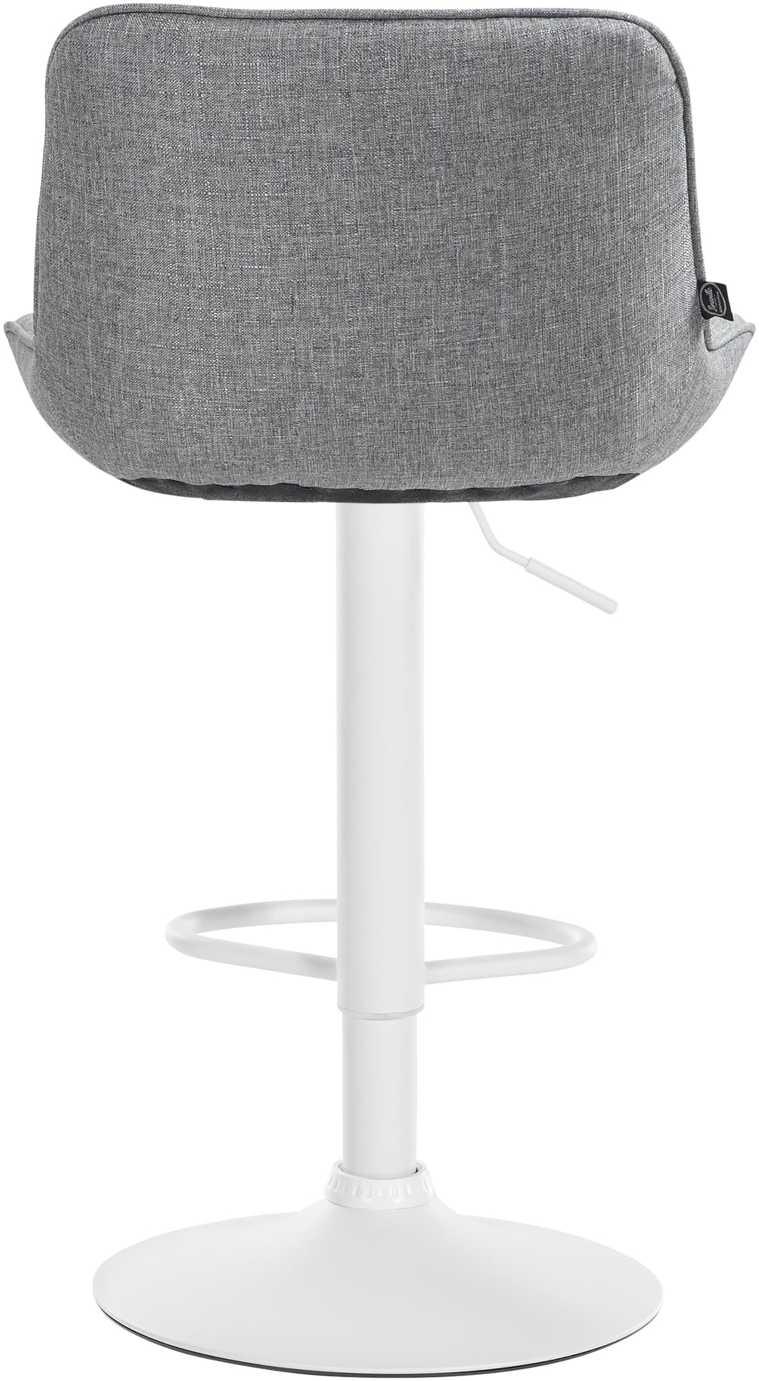 Das Metallgestell und der Trompetenfuß sorgen für Stabilität und Langlebigkeit. Die integrierte Fußstütze passt sich der Sitzhöhe an und bietet zusätzliche Unterstützung. Der Stoffbezug ist langlebig und bietet ein angenehmes Sitzgefühl. Bodenschoner schützen vor Kratzern.