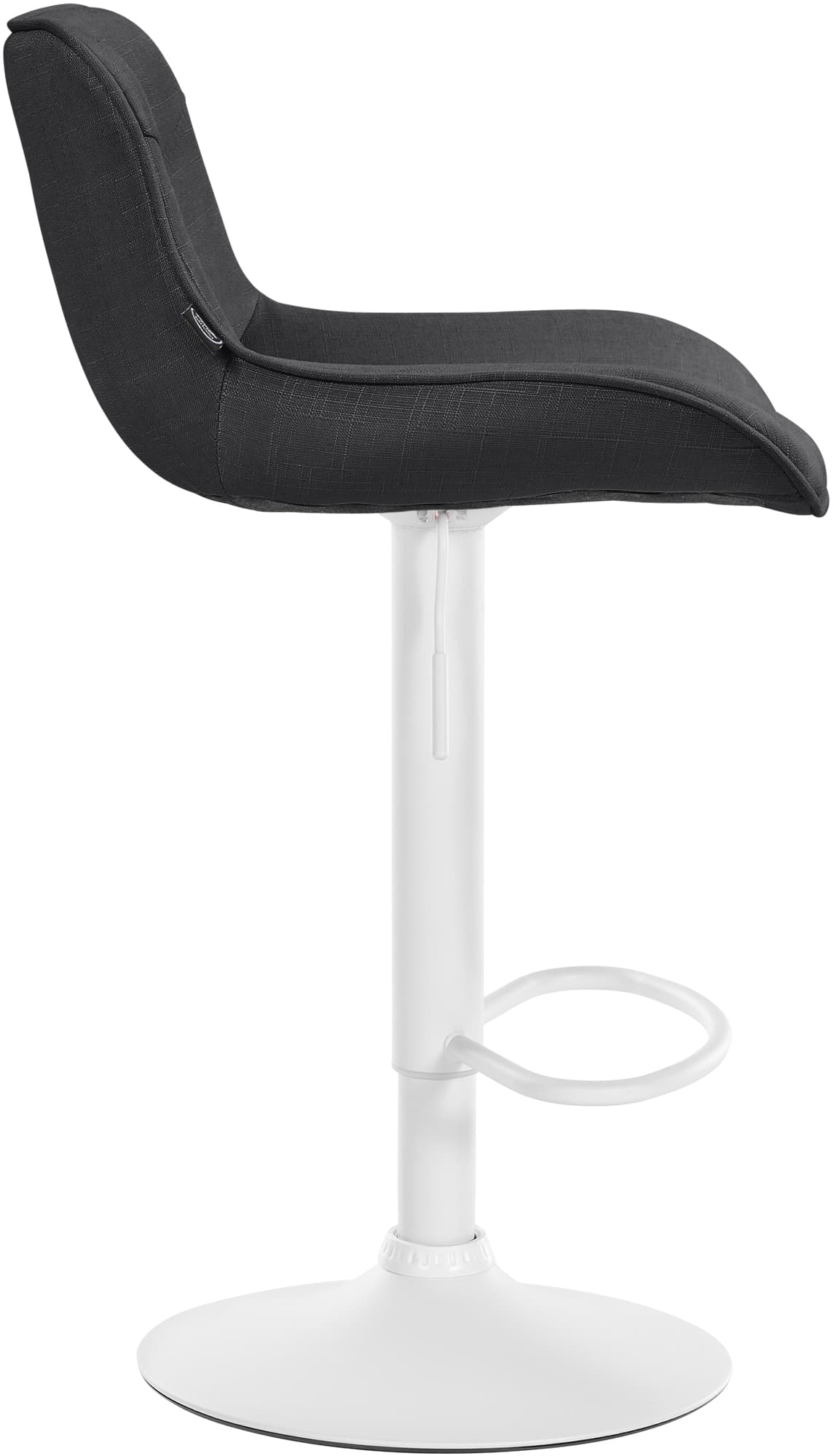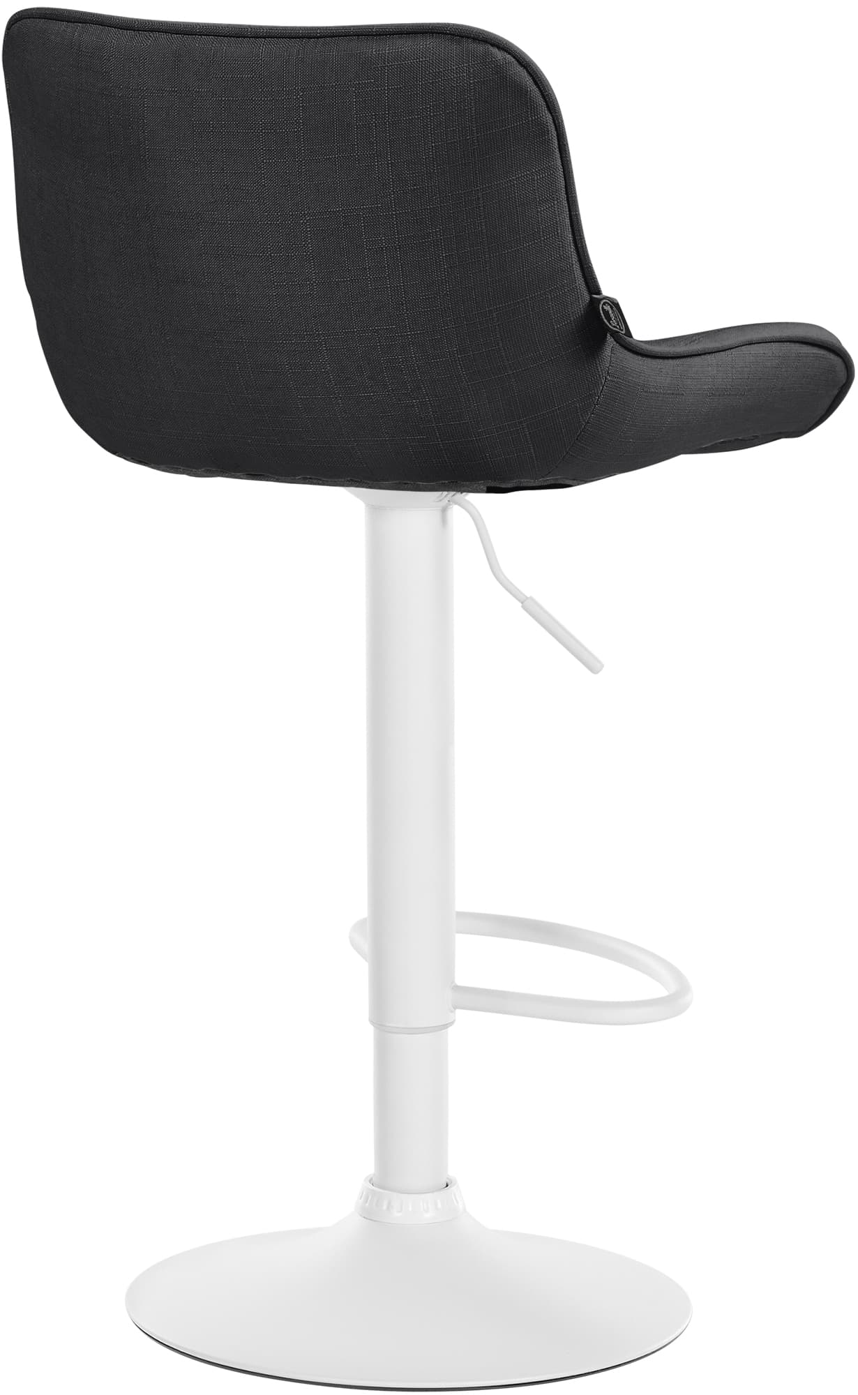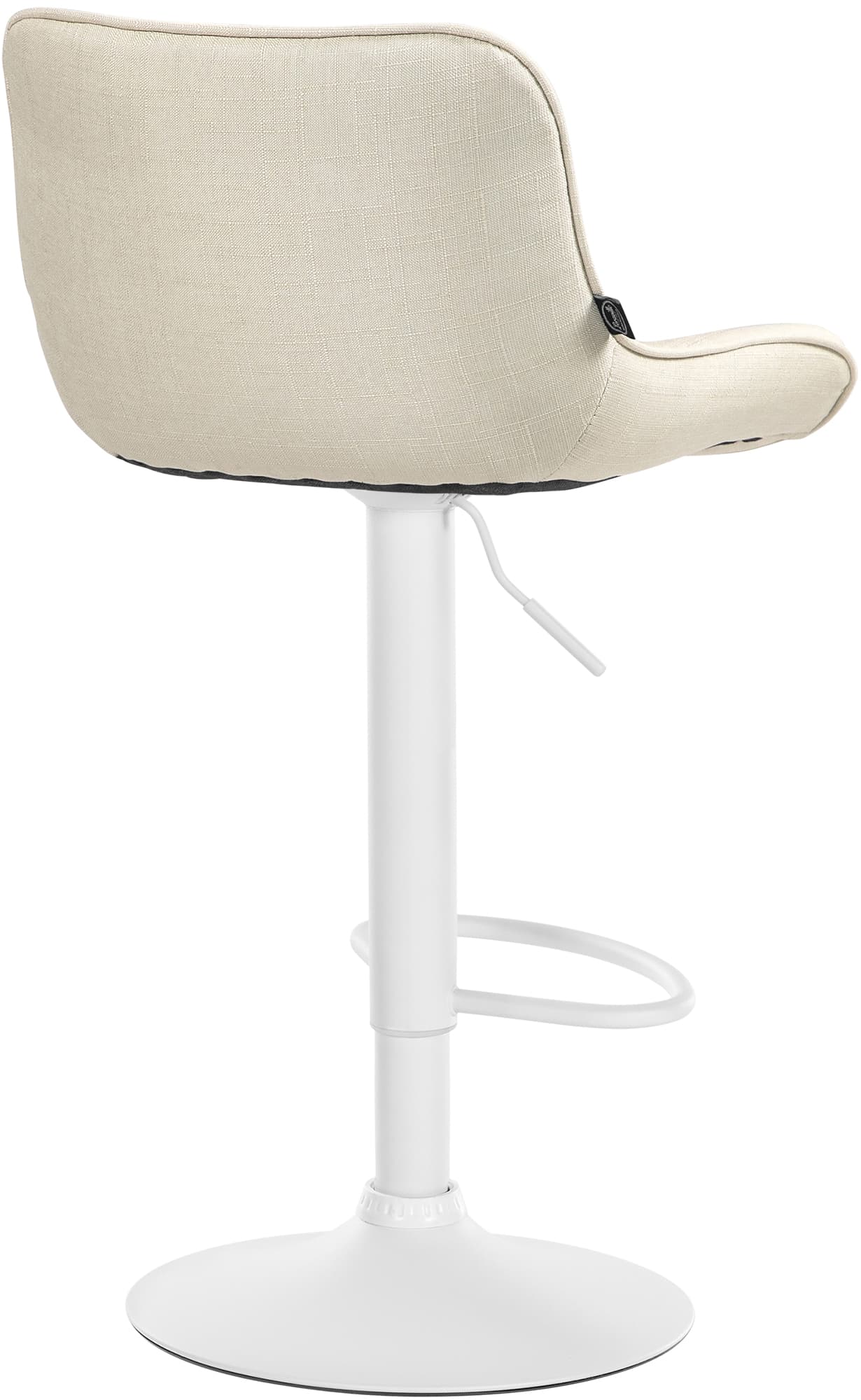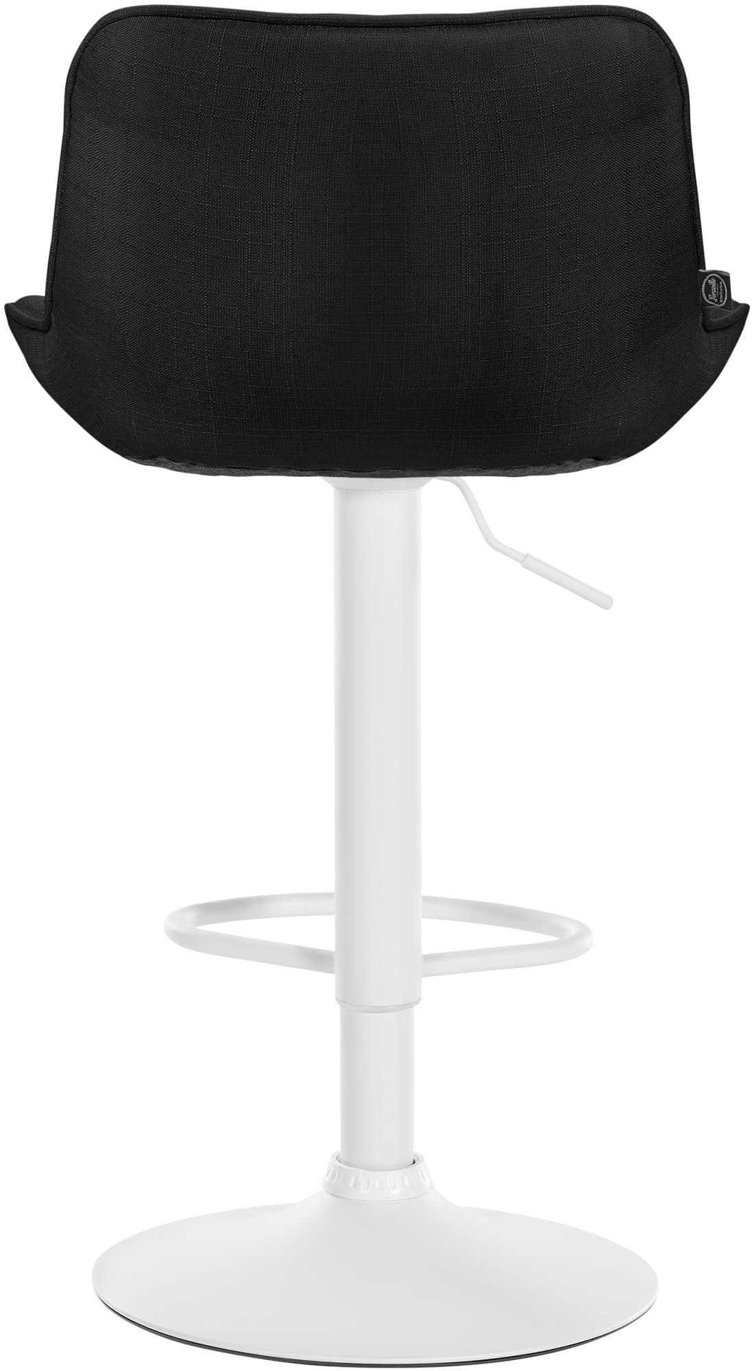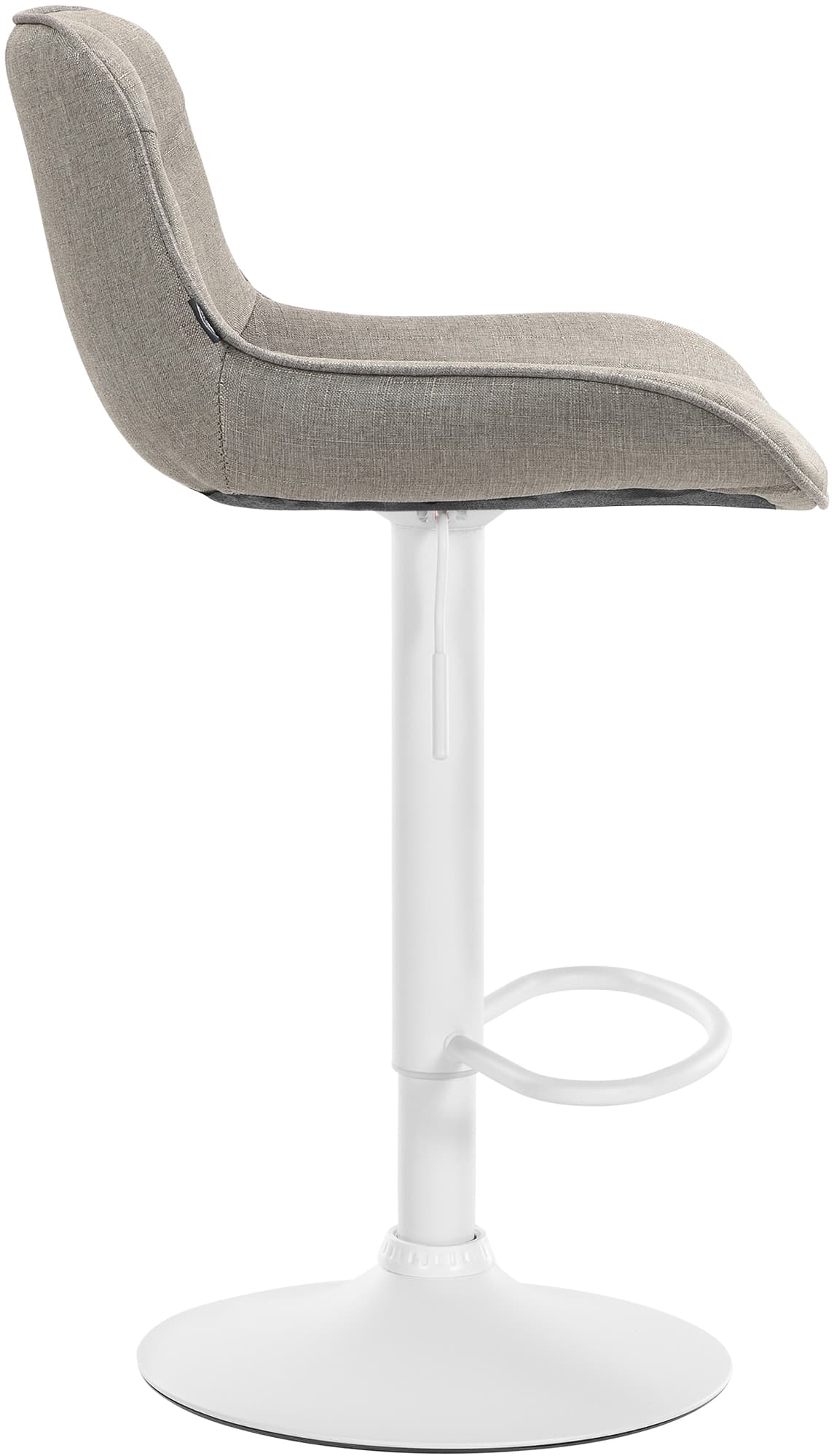 Das Metallgestell und der Trompetenfuß sorgen für Stabilität und Langlebigkeit. Die integrierte Fußstütze passt sich der Sitzhöhe an und bietet zusätzliche Unterstützung. Der Stoffbezug ist langlebig und bietet ein angenehmes Sitzgefühl. Bodenschoner schützen vor Kratzern.