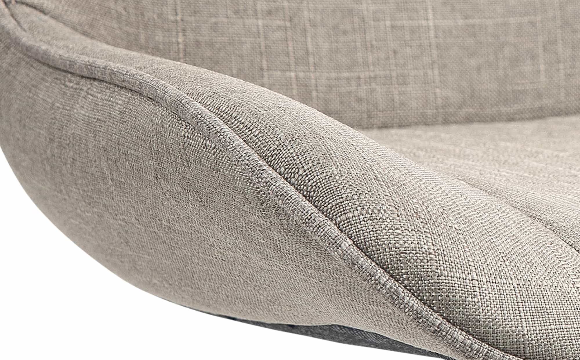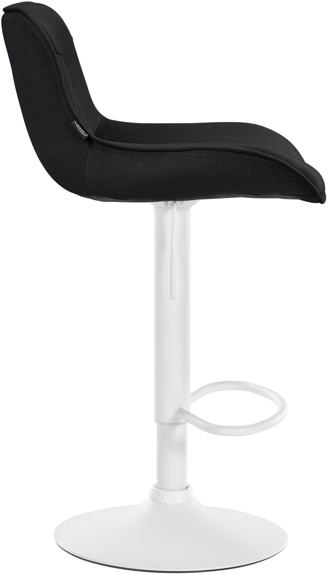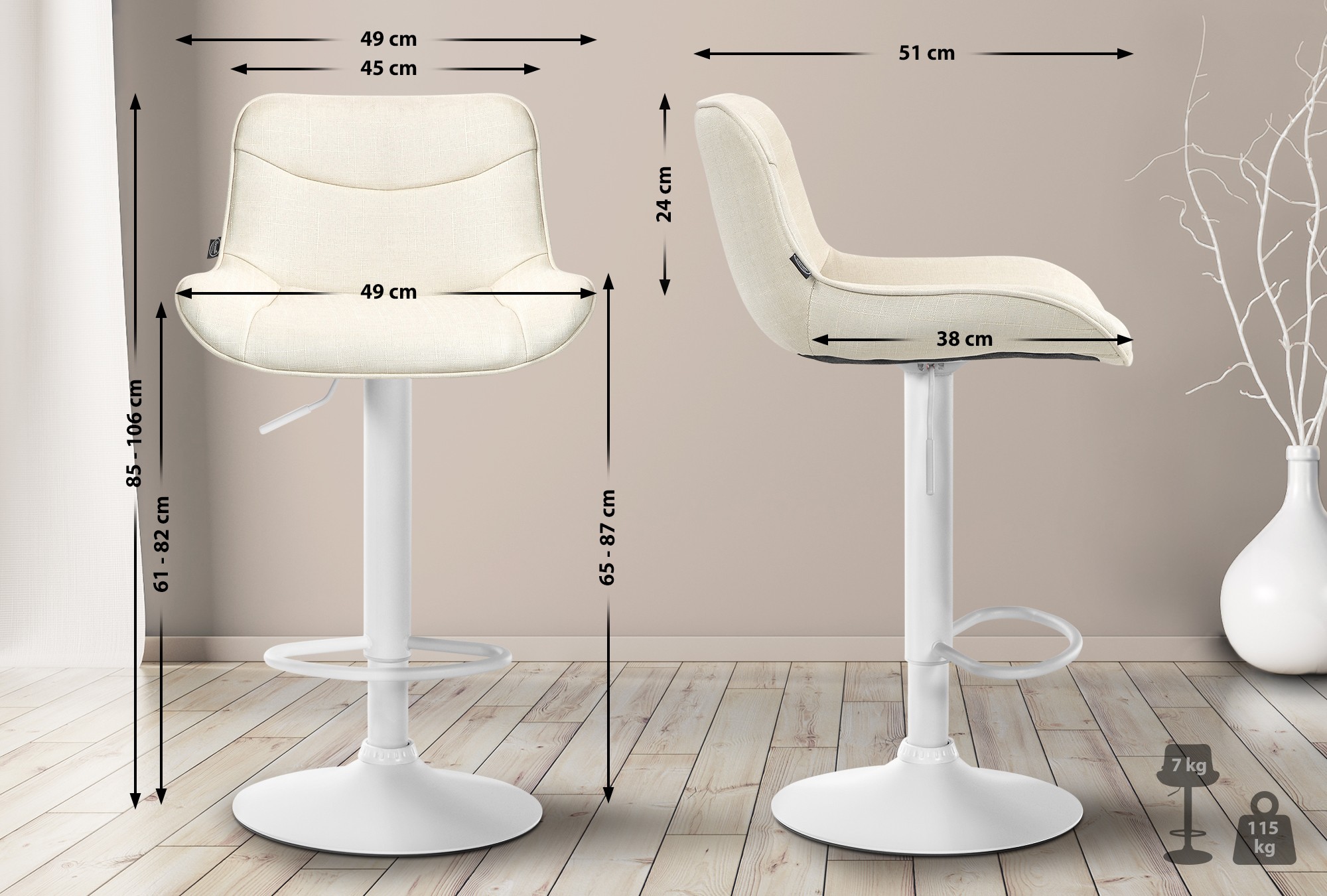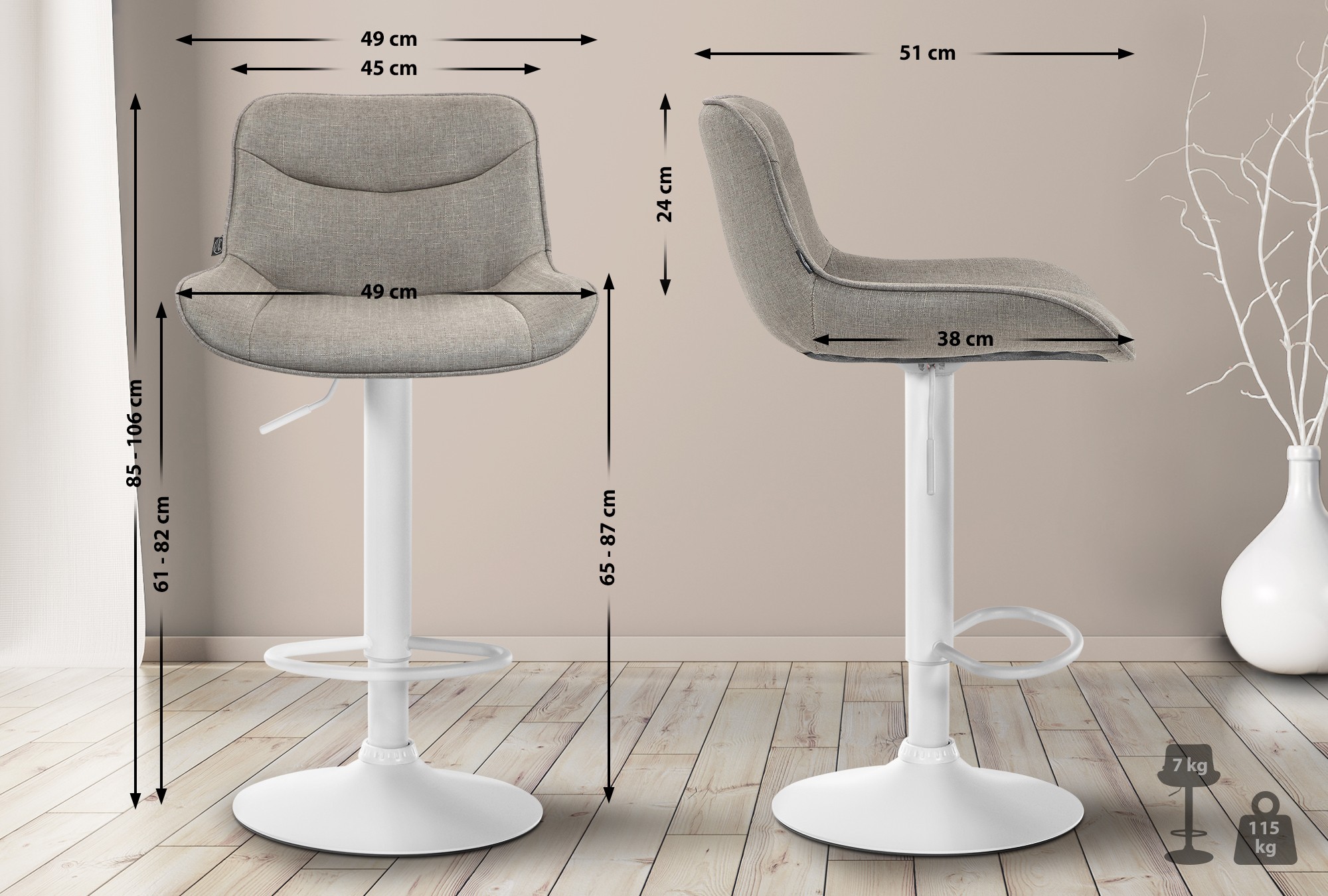 Das Metallgestell und der Trompetenfuß sorgen für Stabilität und Langlebigkeit. Die integrierte Fußstütze passt sich der Sitzhöhe an und bietet zusätzliche Unterstützung. Der Stoffbezug ist langlebig und bietet ein angenehmes Sitzgefühl. Bodenschoner schützen vor Kratzern.