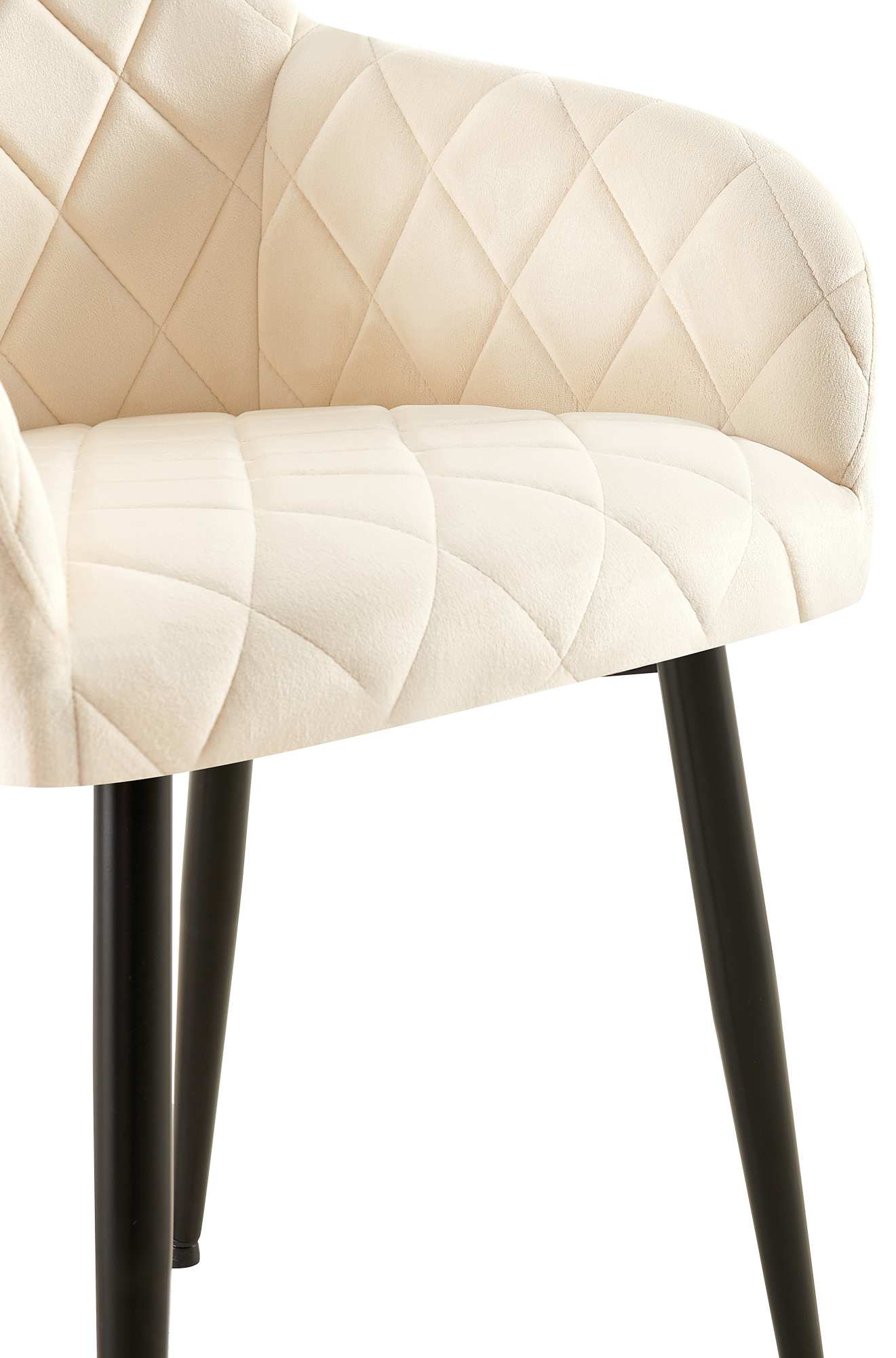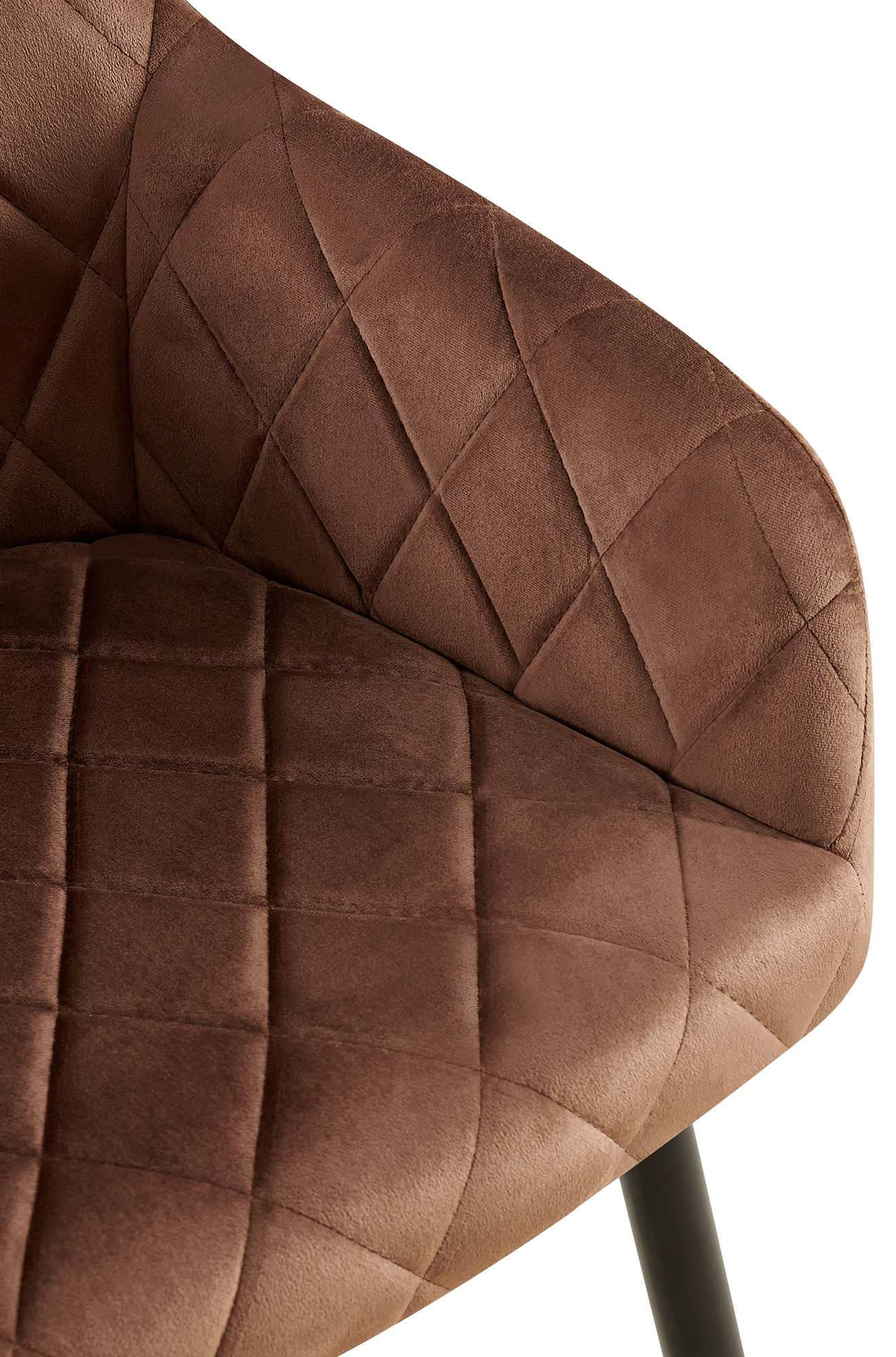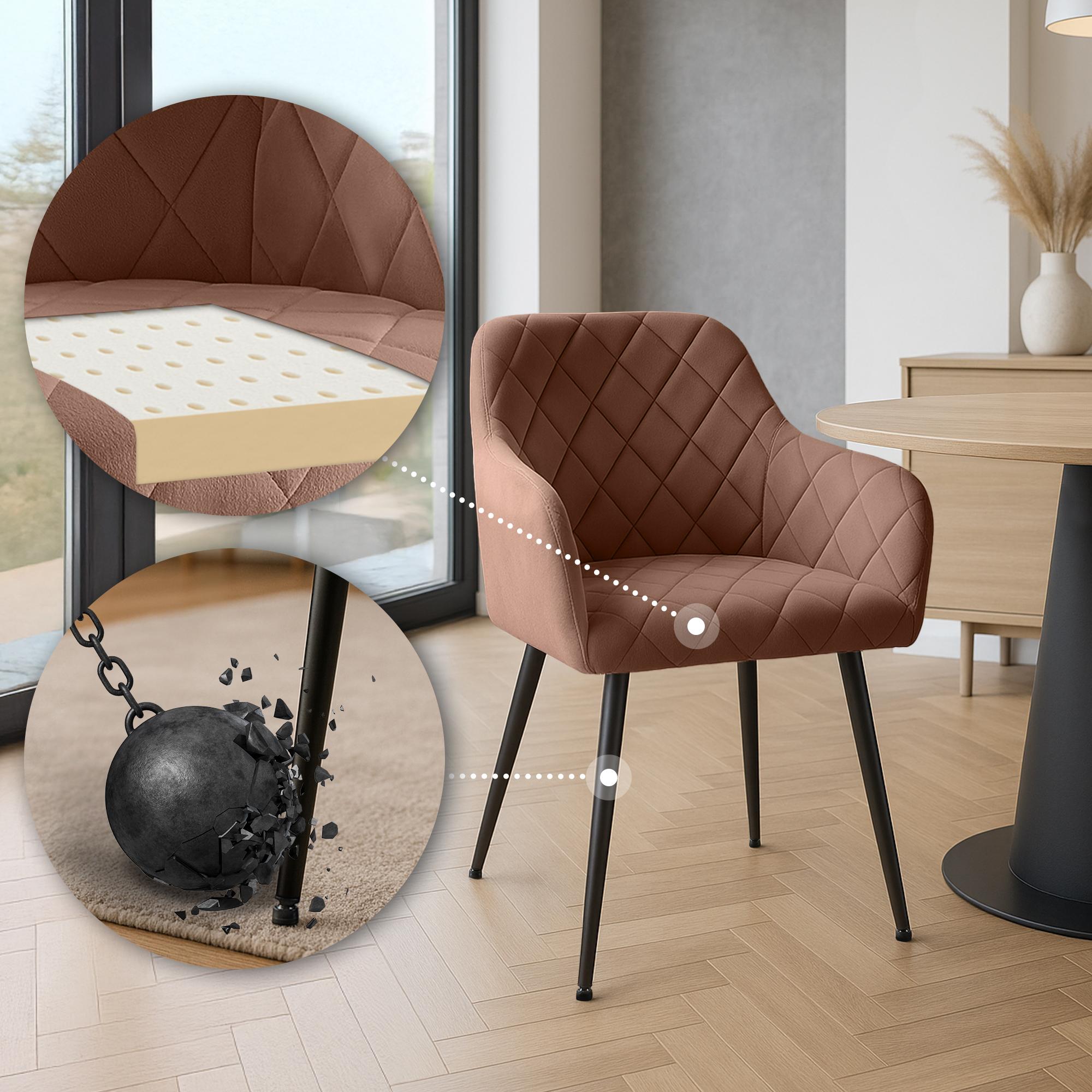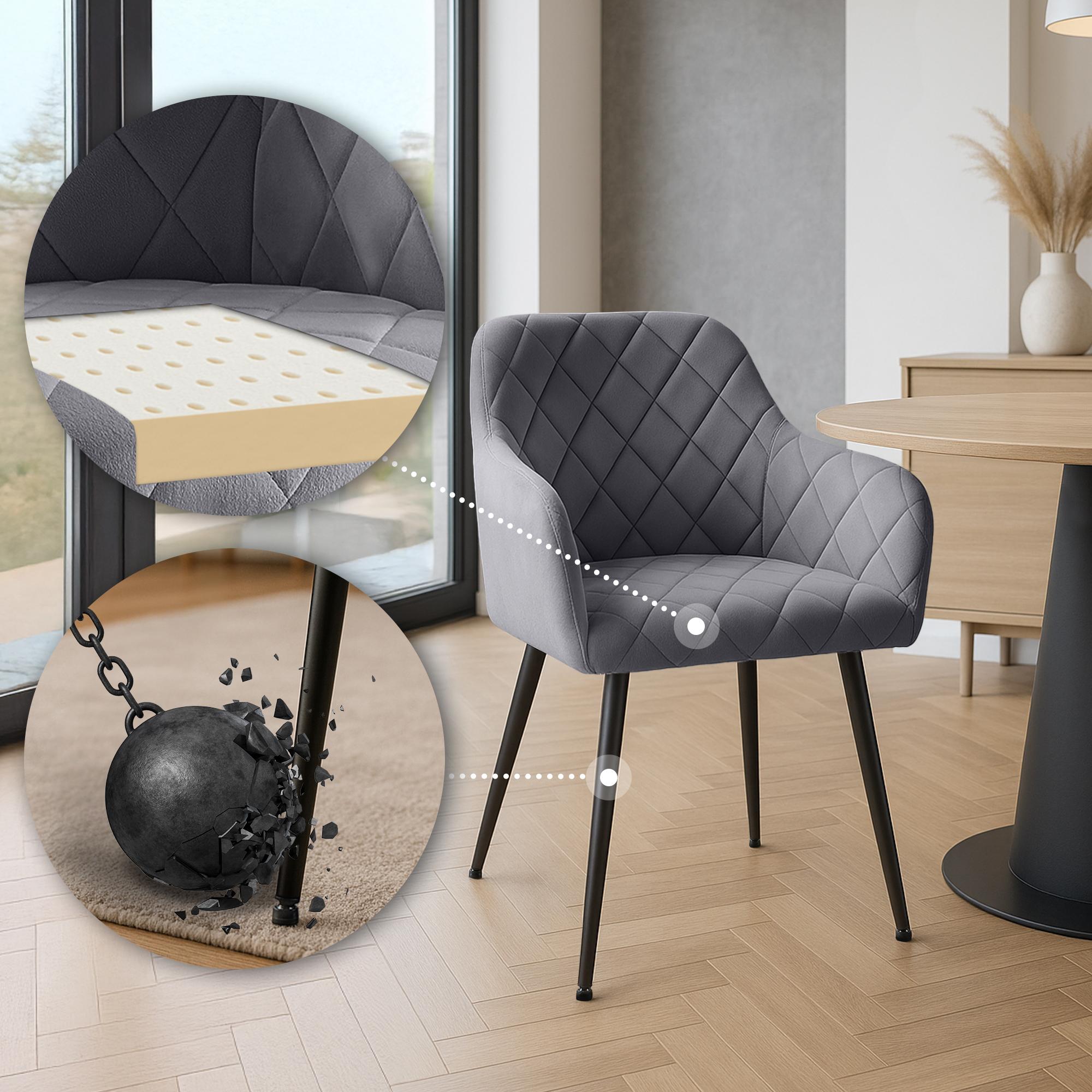 Die Stühle verfügen über großzügig gepolsterte Sitzflächen mit rautenförmigem Steppmuster. Das Polster ermöglicht komfortables Sitzen auch über einen längeren Zeitraum hinaus. Ergänzt wird der Sitzkomfort durch die Rücken- und die Armlehnen.