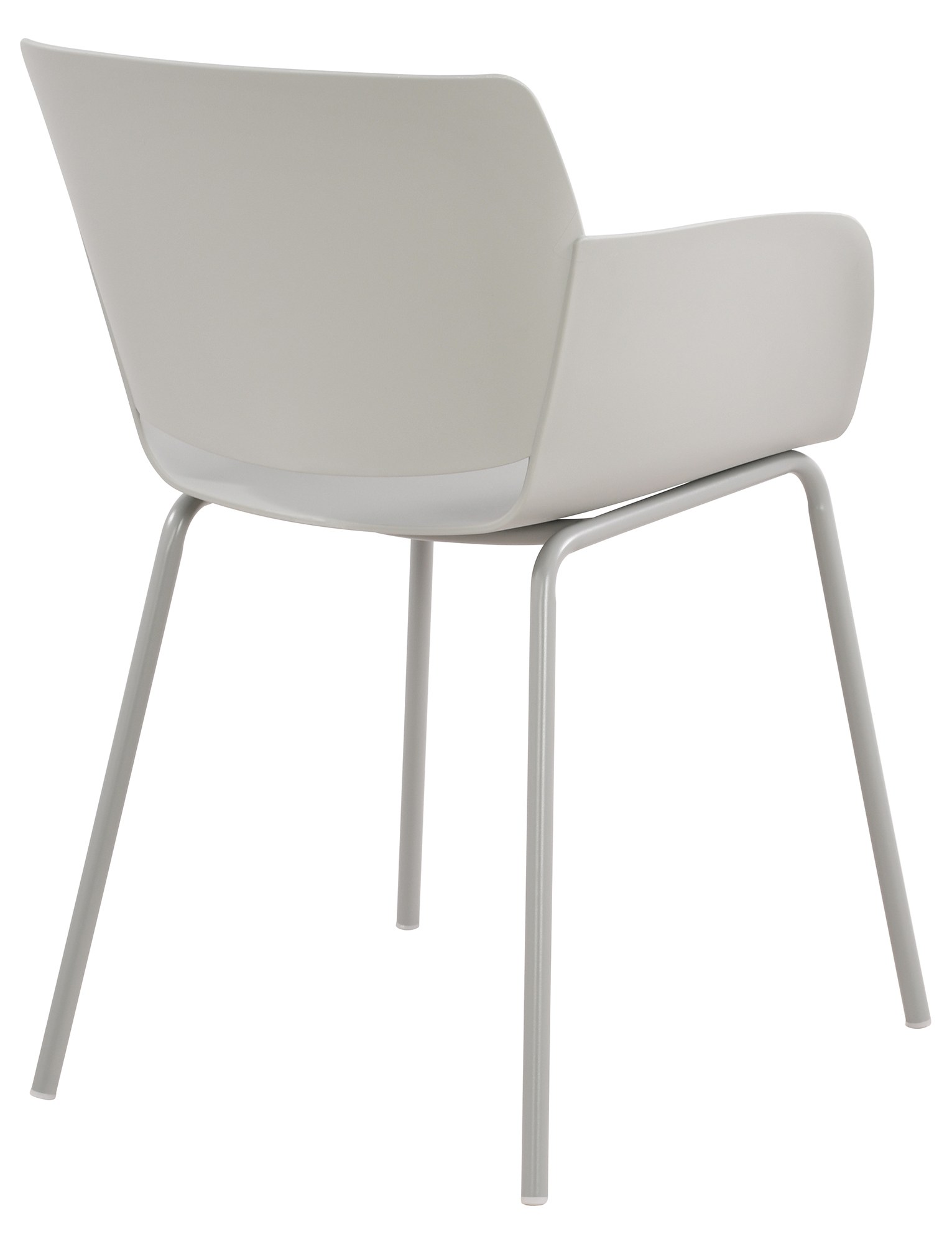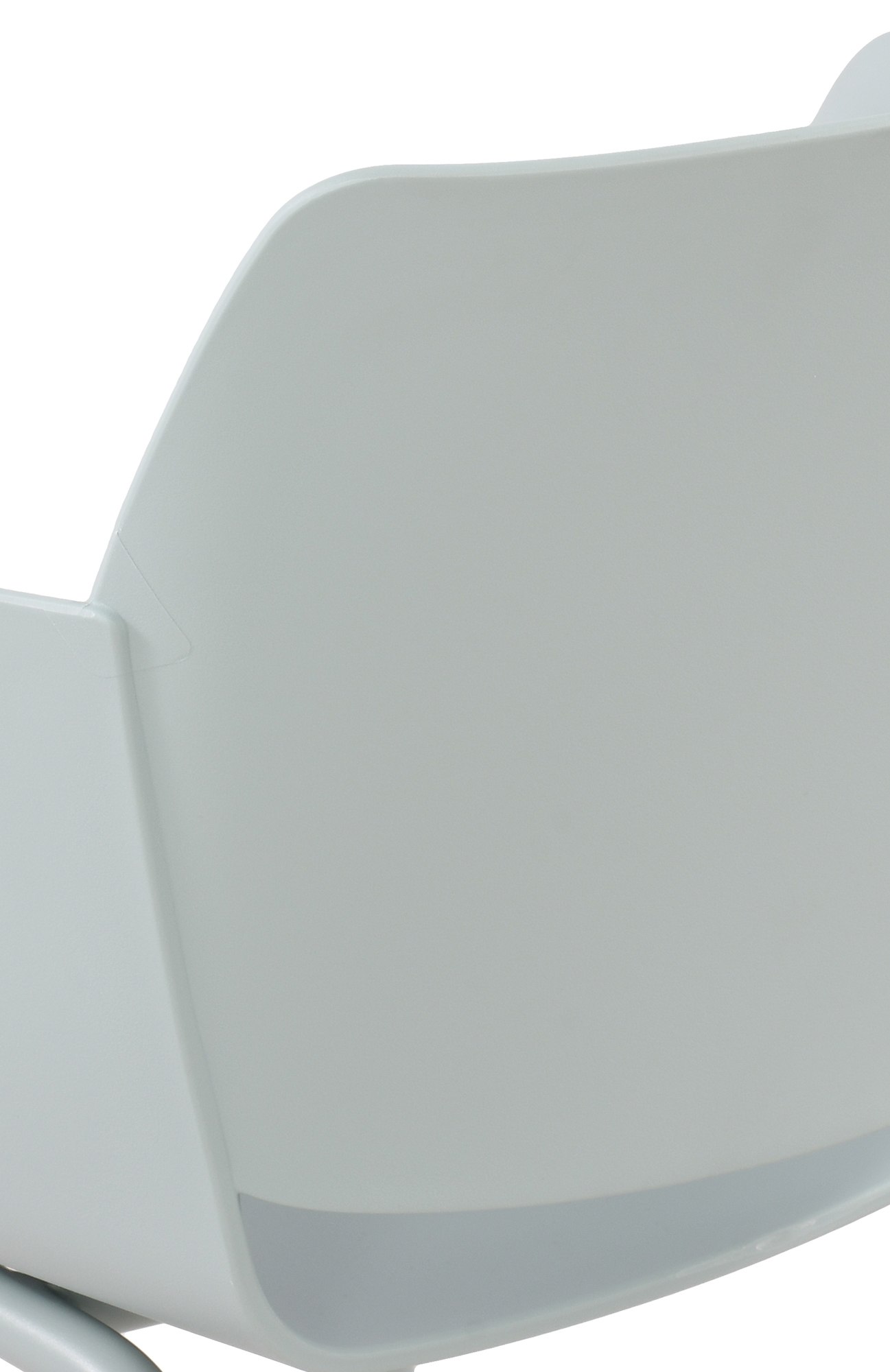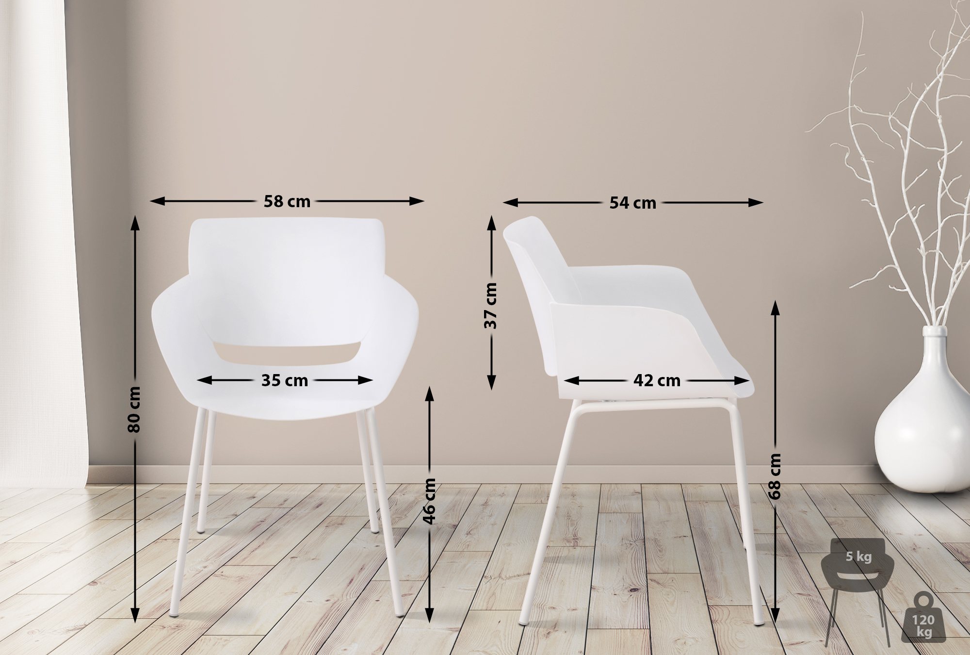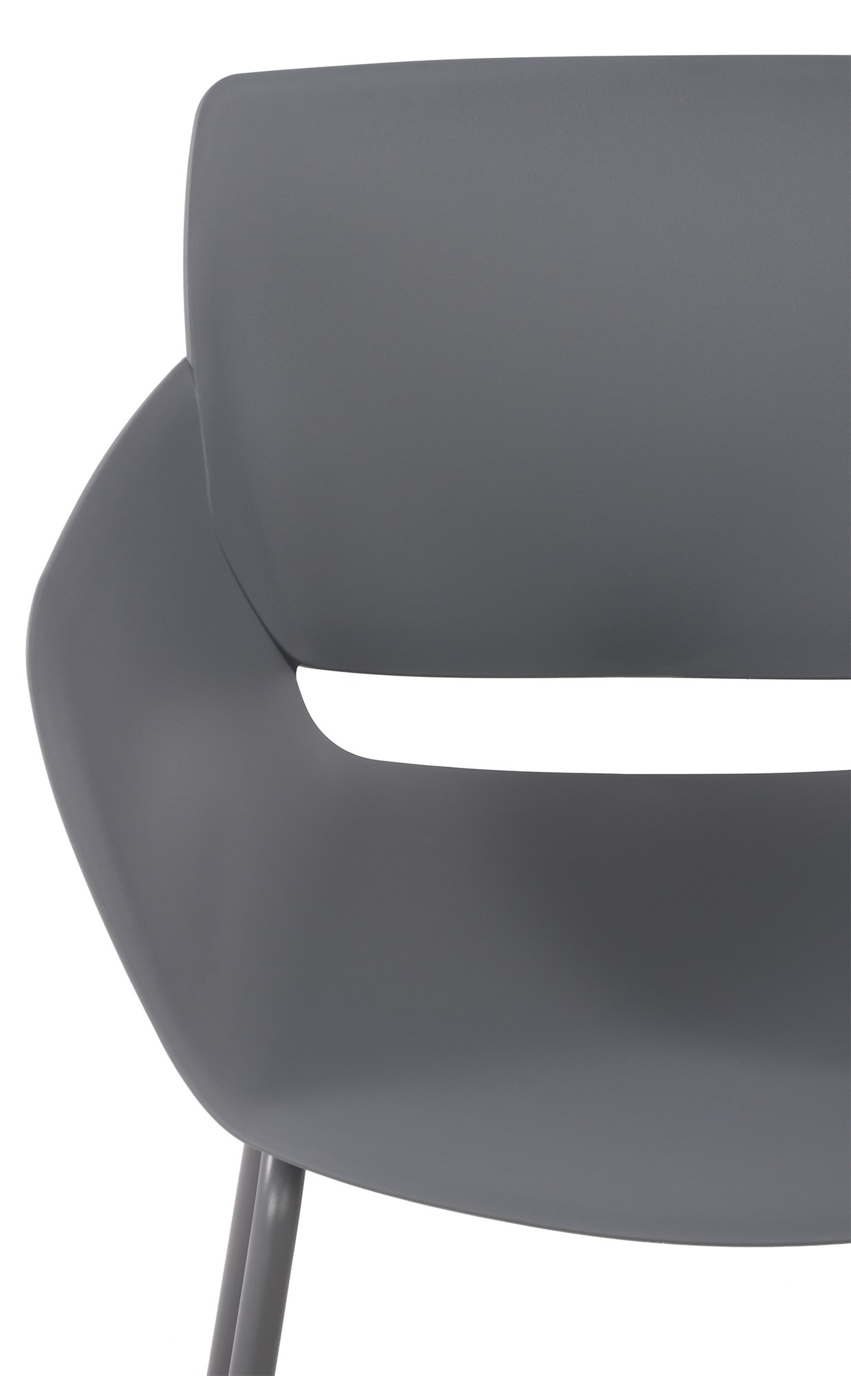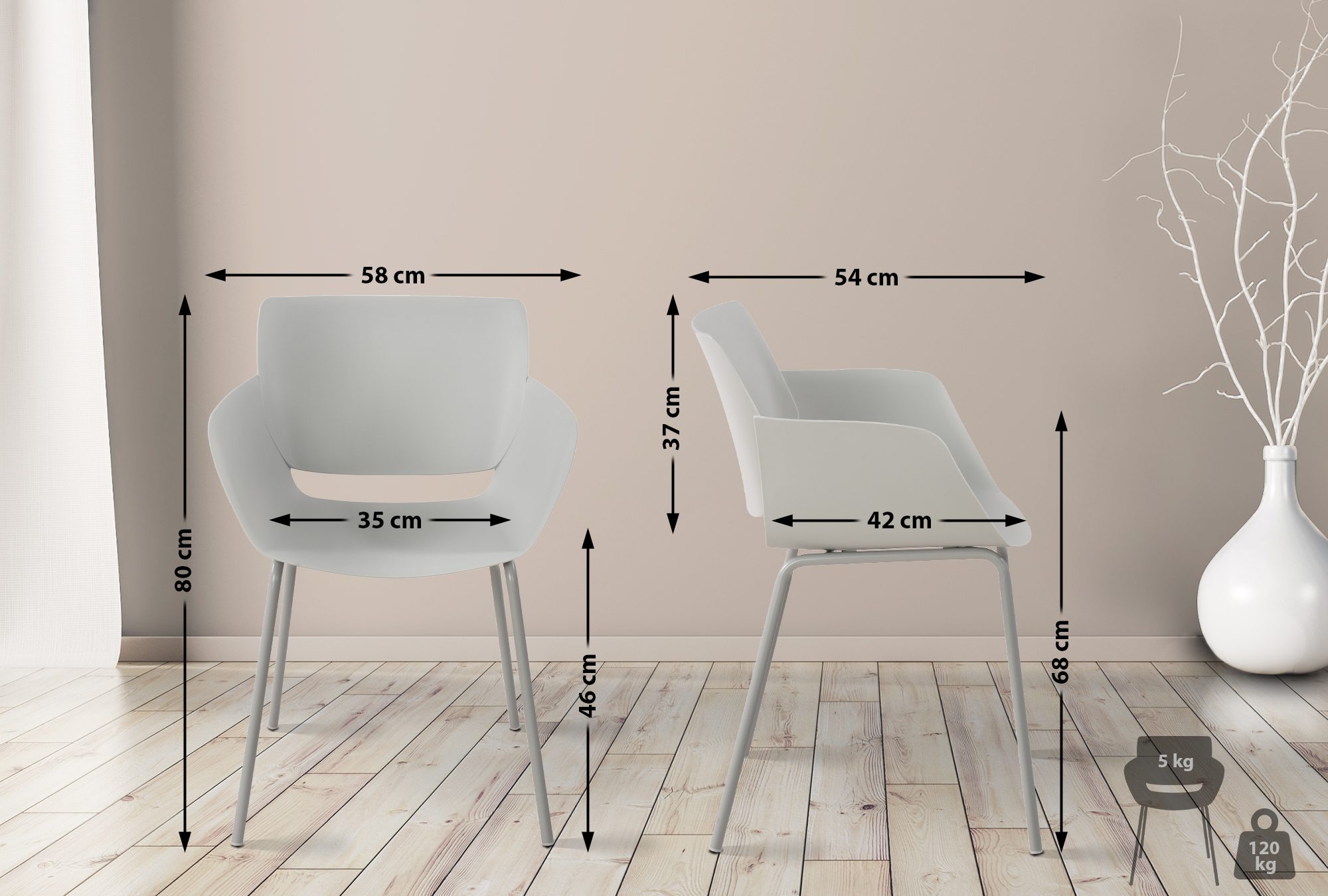 Das Stuhlgestell ist aus pulverbeschichtetem Stahl gefertigt, sodass es korrosionsbeständig ist und nicht rostet. Die Farben von Sitzschale und Stuhlgestellen sind aufeinander abgestimmt.