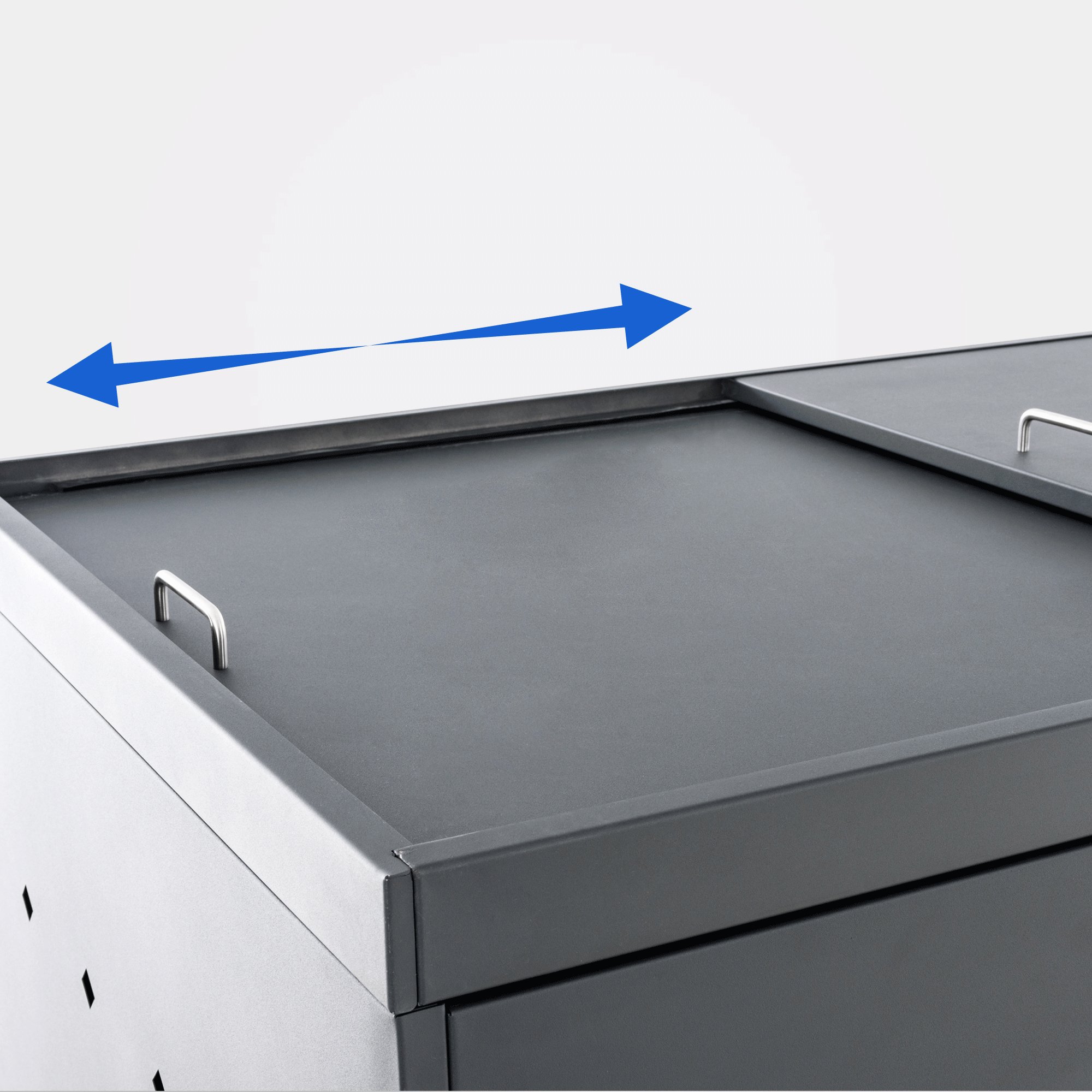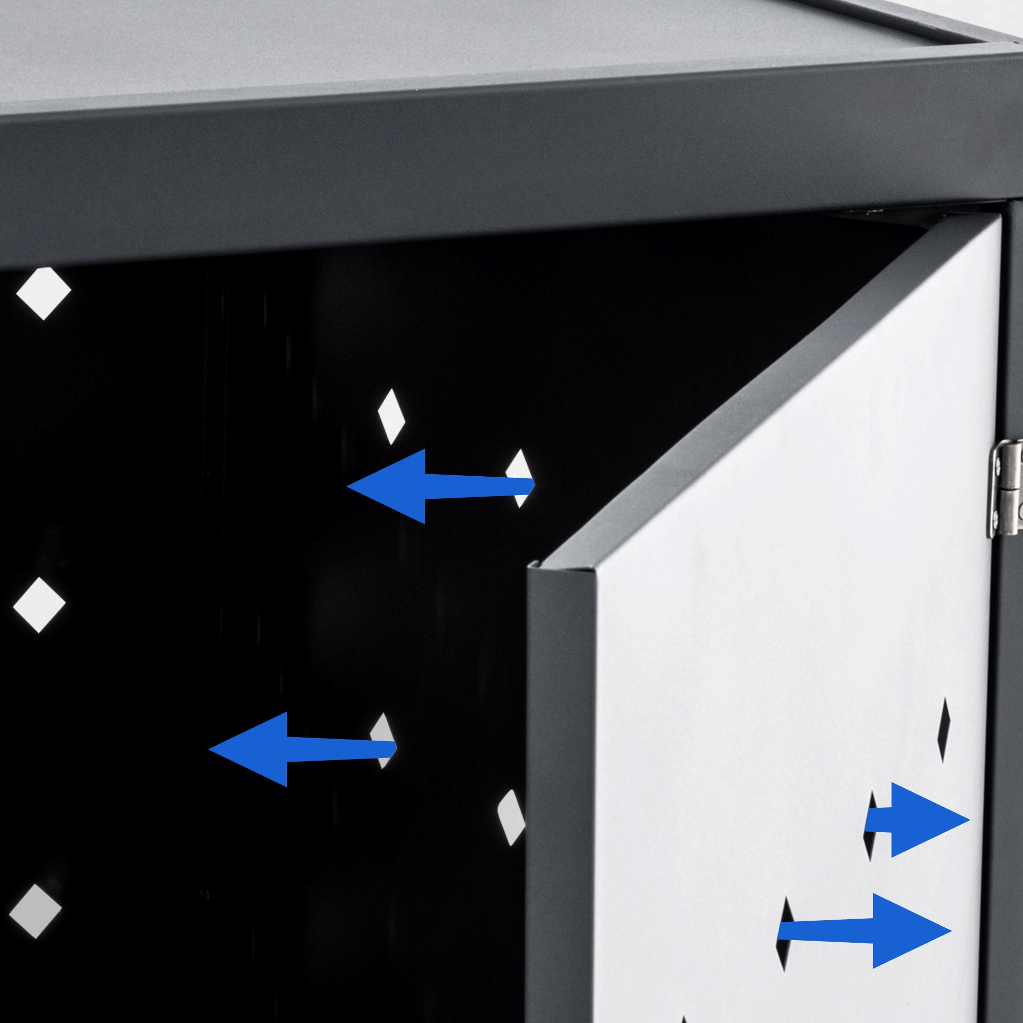 Ebenfalls von Vorteil sind die Belüftungsschlitze. Diese ermöglichen eine stetige Luftzirkulation im Inneren der Box. Dabei ist die Tonnenverkleidung absolut wetterfest. Sie besteht aus Edelstahl, einem Material, das besonders korrosionsbeständig ist und dadurch nicht rostet. Das Gewicht der Box macht diese wenig windanfällig.