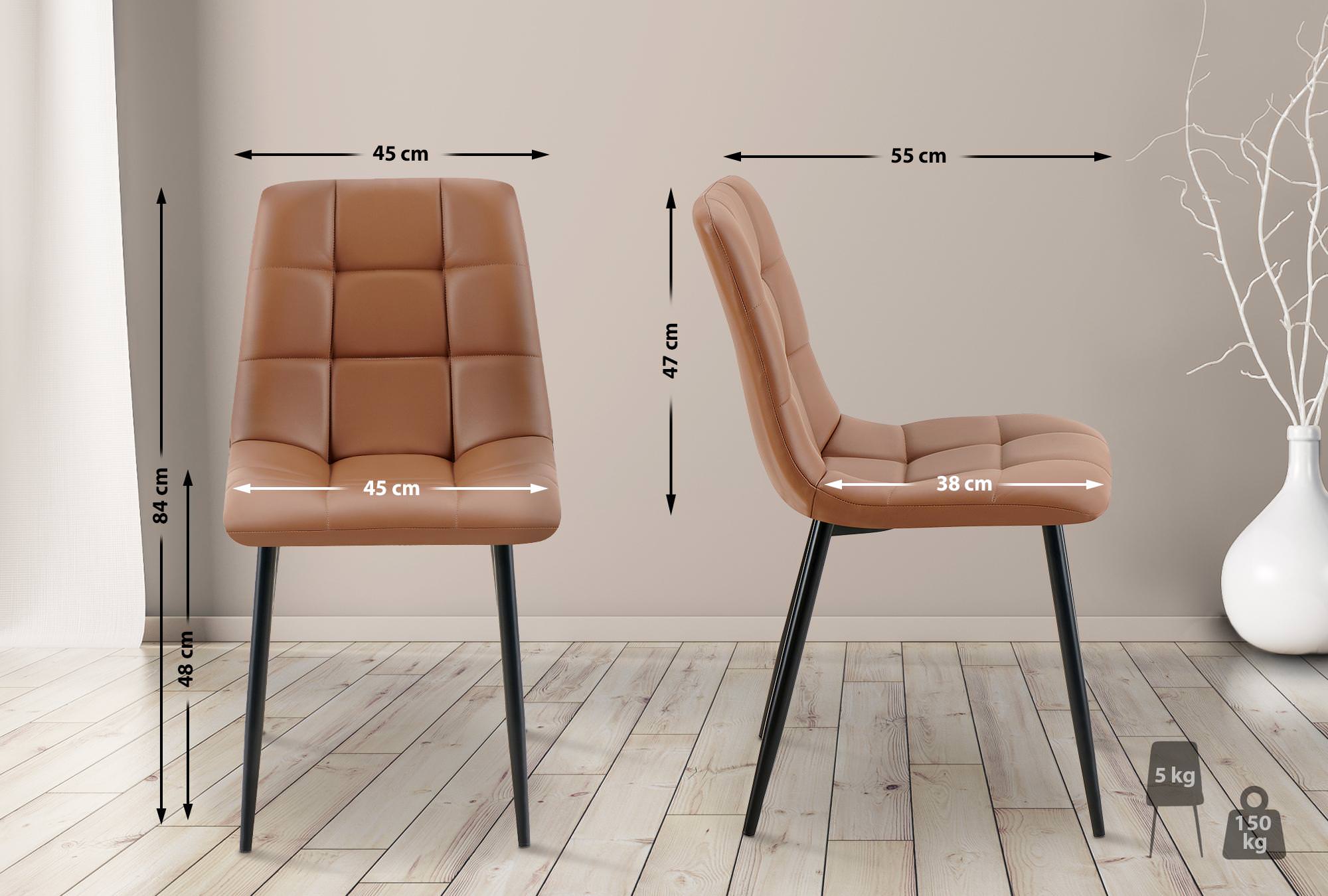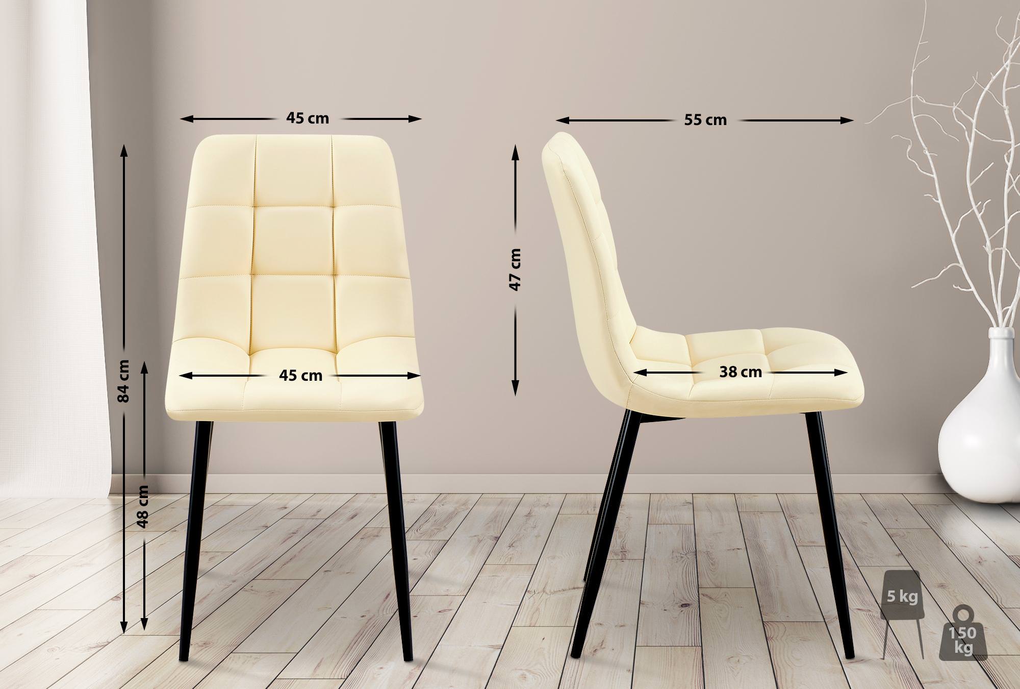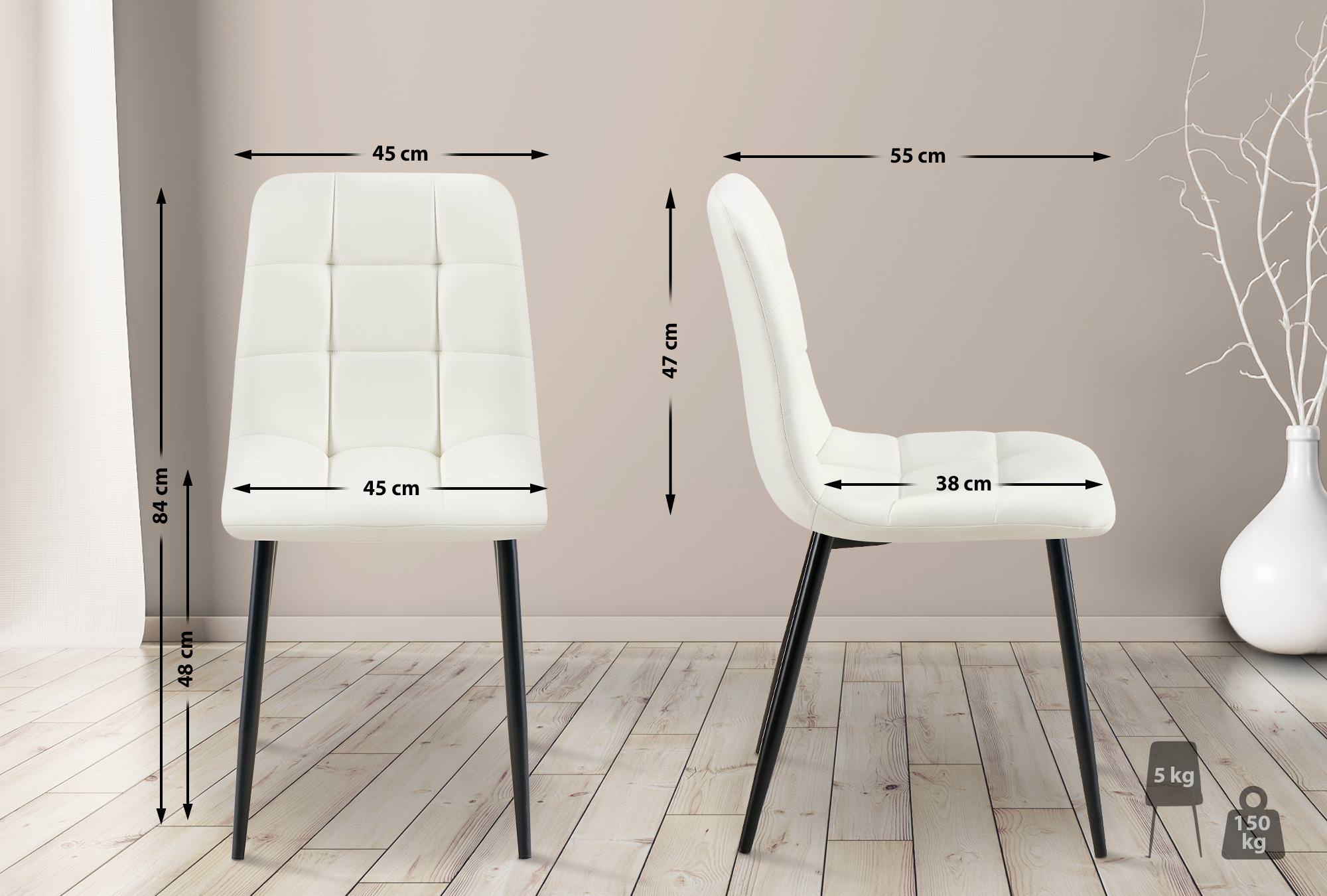 Der Esszimmerstuhl Antibes kombiniert hohen Sitzkomfort mit einer modernen zeitgemäßen Optik. Entscheidend für einen bequemen Sitz ist die angenehme Polsterung über Sitz und Rückenlehne. Dabei sind sowohl Sitzschale als auch Rückenlehne durchgängig mit einem pflegeleichten und robusten Kunstleder-Bezug mit modischem Stepp-Muster versehen. Die Stuhlbeine bestehen aus einem matt-schwarzen Metallgestell. Die maximale Belastbarkeit beträgt bis zu 150 Kilogramm. Bodenschoner beugen dabei Beschädigungen empfindlicher Böden vor.