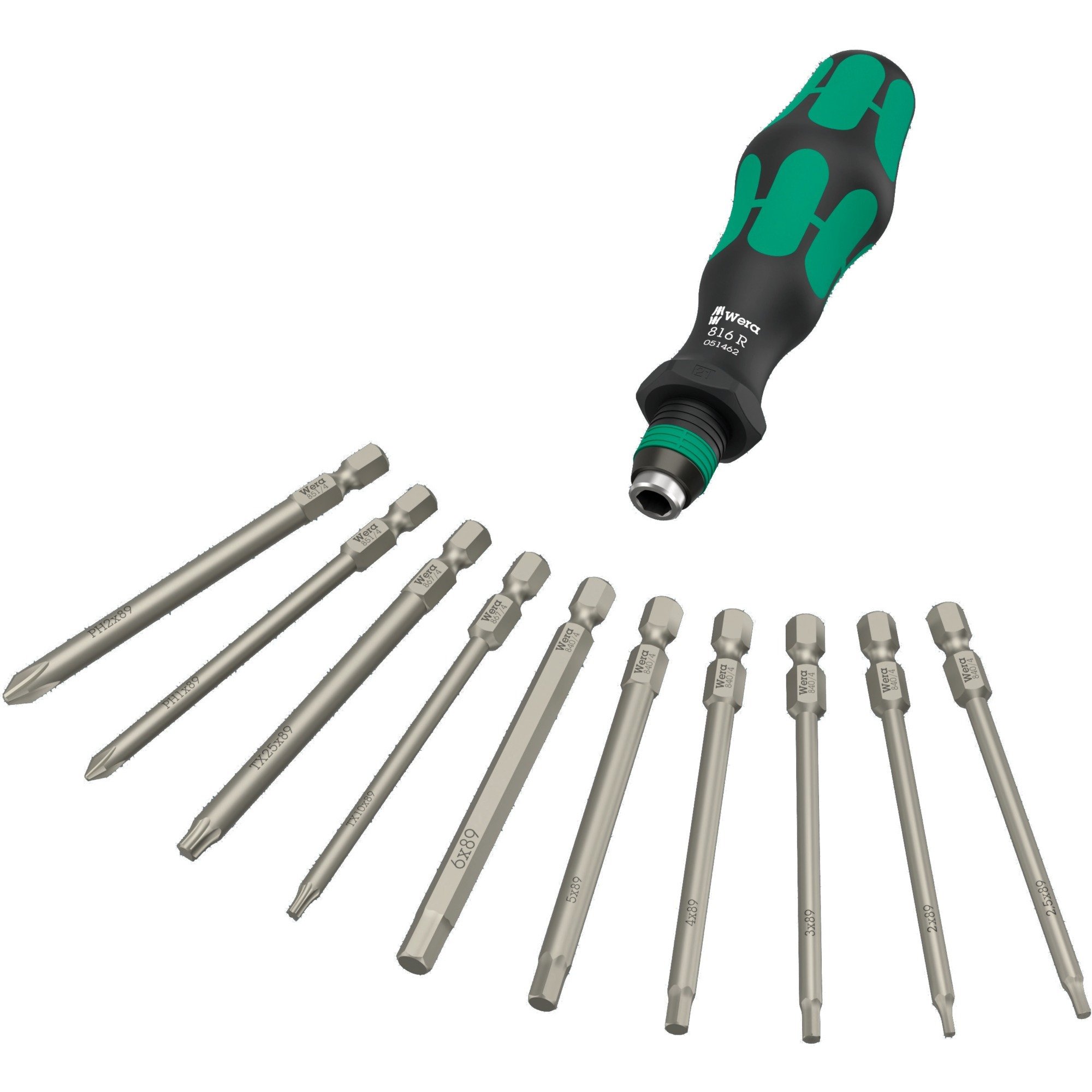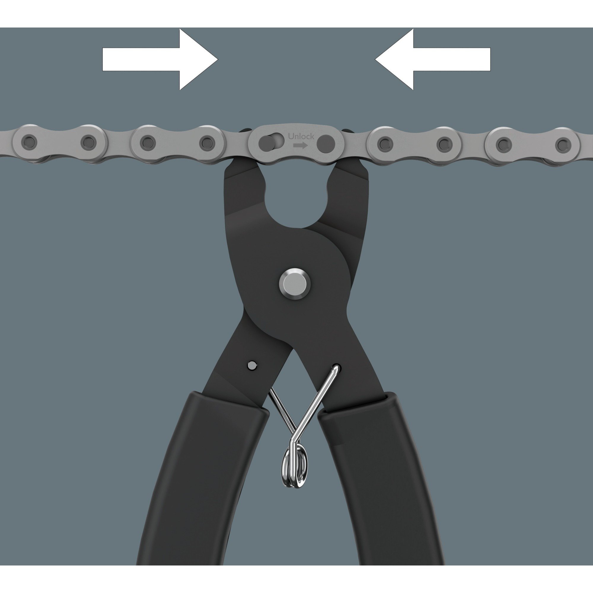 ProduktbeschreibungDas 20-teilige Kettennieter Werkstatt-Set von Wera enthält eine Kettenverschlussgliedzange (167,5mm), einen Kettennieter, einen Kettenfixierhaken, drei Ersatz-Nietstifte für Kettennieter 9513 (15mm), 12 zähharte Bits und eine 1/4″-Umschaltknarre für Bits. Der Kettennieter und -halter mit auswechselbarem Nietstift dient zum Öffnen und Schließen von Fahrradketten, auch für SingleSpeed Ketten, bis 12-fach. Die Kettenschlosszange erleichtert das Öffnen von arretierbaren Kettenverschlüssen für die Reinigung oder zum Austausch von Kettengliedern. Die Innensechskant-Bits verfügen über das Wera Hex-Plus Profil. Es bietet größere Anlageflächen im Schraubenkopf, die Kerbwirkung wird dadurch auf ein Minimum reduziert und die Zerstörung des Profils verhindert. Gleichzeitig können bis zu 20% höhere Drehmomente übertragen werden. Die Wera Zyklop Mini 1 Bit-Ratsche kombiniert filigranes Design mit einer unglaublichen Robustheit. Zum besonders schnellen Schrauben auch in engen Arbeitssituationen, und immer wenn das Verschrauben per Maschine oder herkömmlichem Handwerkzeug aus Platzgründen nicht möglich ist, kommt die Zyklop Mini Bit-Ratsche zum Einsatz. Sie eignet sich für die Aufnahme von Bits mit 1/4″-Außensechskantantrieb und Wera Anschluss-Reihen 1 und 4. Über einen optionalen Adapter ist auch der Einsatz von 1/4″ Steckschlüssel-Einsätzen möglich. Der Kraftform-Steckgriff mit Rapidaptor Schnellwechselfutter und bewährter Kraftform-Geometrie bietet perfekt geformte Anlageflächen für die Finger. Das Kettennieter Werkstatt-Set 9532 wird in einer robusten Falttasche geliefert.