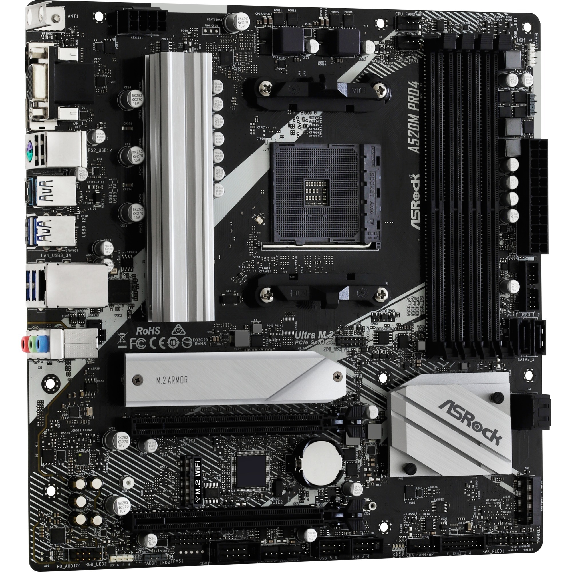 ProduktbeschreibungDas ASRock A520M PRO4 basiert auf dem AMD-A520-Chipsatz und unterstützt AMD-Prozessoren für den Sockel AM4. Es verfügt über zwei DDR4-Slots für bis zu 64 GB Arbeitsspeicher. Zur weiteren Ausstattung des ASRock A520M PRO4 gehören zwei PCIe-3.0-x16-Slots und ein PCIe-3.0-x1-Slot. Außerdem verfügt das ASRock A520M PRO4 über 8-Kanal-Sound, eine Gigabit-LAN-Schnittstelle, vier SATA3-Anschlüsse, zwei M.2-Anschlüsse und eine Reihe an USB Schnittstellen.