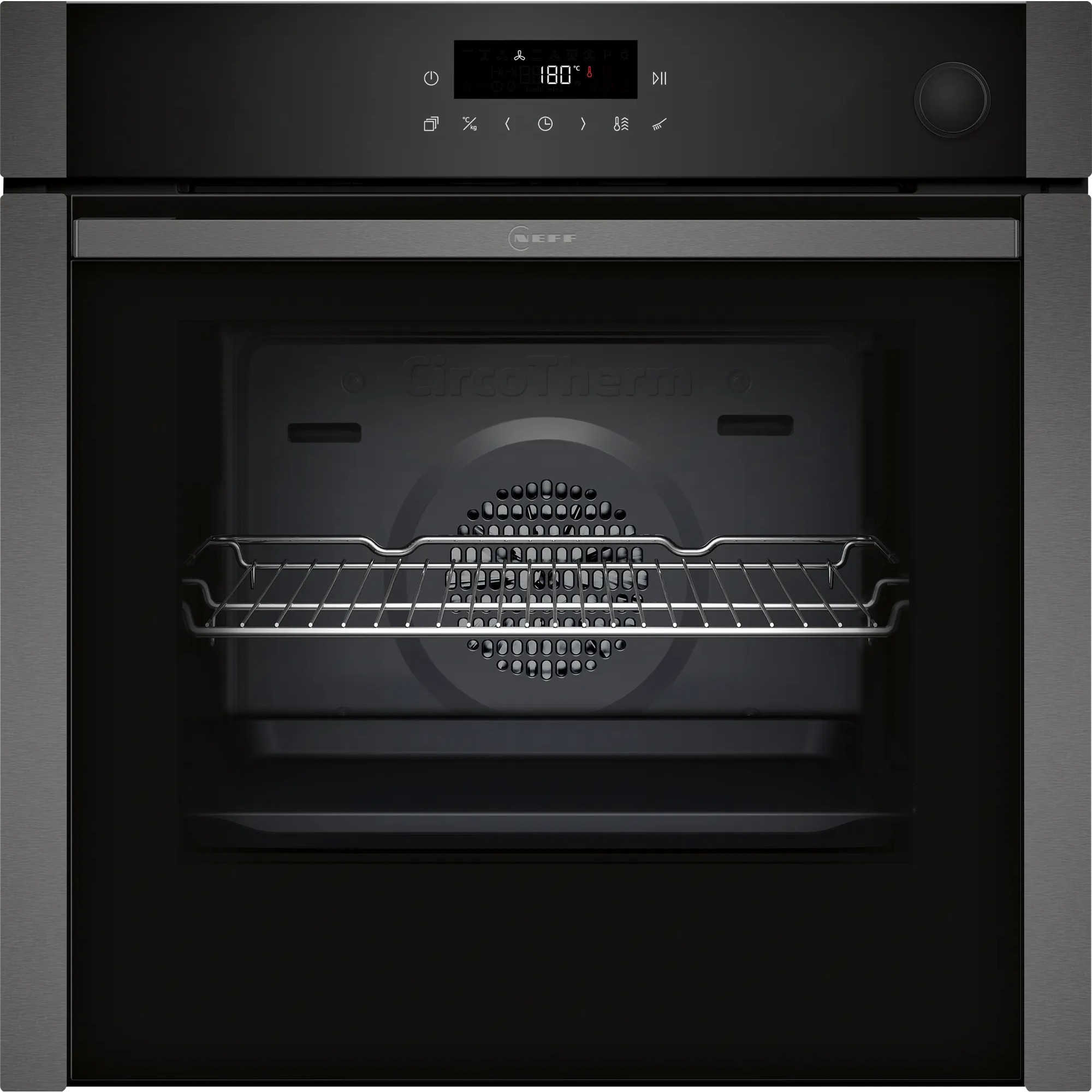 ProduktbeschreibungDer Einbau-Backofen B6AVJ7AG3 mit Dampfunterstützung von Neff stellt auf einem Nutzinhalt von 71 Litern 20 Beheizungsarten zum vielfältigen und kreativen Zubereiten unterschiedlichster Gerichte zur Verfügung. Das einzigartige Heißluftsystem CircoTherm führt mit hoher Geschwindigkeit die Hitze im Backofen gezielt um die Speisen auf den verschiedenen Einschubebenen herum. Auf bis zu vier Ebenen können so unterschiedliche Gerichte gleichzeitig backen, braten und garen – und das ohne Aromenvermischung! Die LED-Touchsteuerung des B6AVJ7AG3 bietet ein benutzerfreundliches und intuitives Menü für mehr Freude am Backen und Braten. Die Hide-Backofentür verschwindet beim Öffnen vollständig unter dem Backofen und macht Platz zum unkomplizierten würzen, bepinseln und Gerichte hineinstellen oder wieder herausnehmen. Das integrierte Reinigungssystem ist hydrolytisch und pyrolytisch, für eine schnelle und gründliche Reinigung des Innenraums. In puncto Sicherheit bleiben zudem beim B6AVJ7AG3 mit Kindersicherung, Türverriegelung und automatischer Sicherheitsabschaltung keine Wünsche offen.