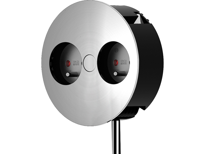 Die Bachmann Twist 2S 2 x Schutzkontaktsteckdosen mit Kinderschutz (931.000) in Edelstahl-Optik verfügt über eine metallische Abdeckscheibe im Edelstahl-Look mit einer 2 m Leitung und beigelegtem Schutzkontakt-Montagestecker in schwarz.