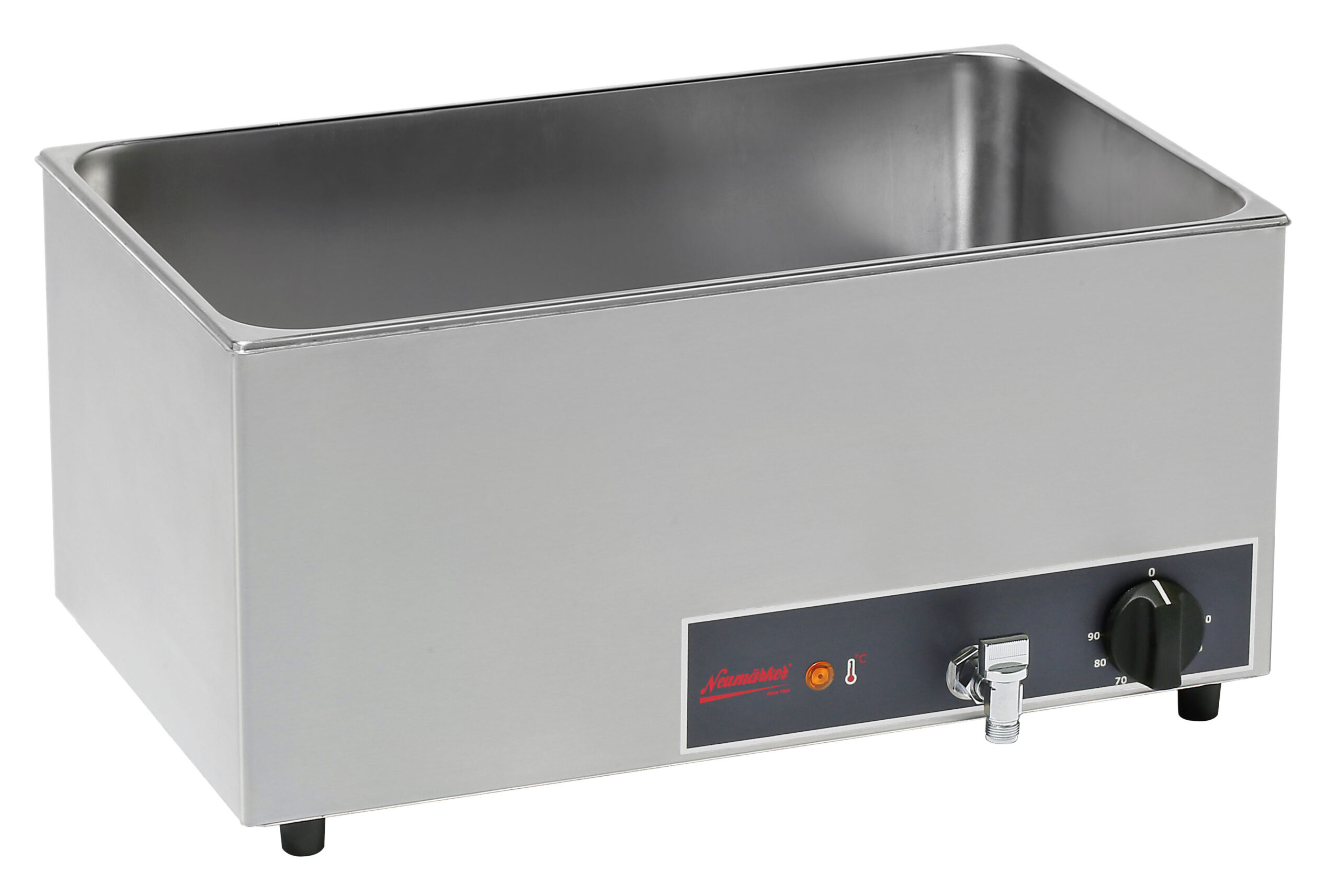 Perfekt geeignet für warme Soßen am Crêpesstand (Schokosoße, Vanillesoße, Rote Grütze etc.) n- Wasserbad für eine gleichmäßige Wärmeverteilung verhindert das Anbrennen der Speisen n- Gehäuse Edelstahl n- Thermostat 0 bis 90°C n- Beckengröße 1/1 GN x 160 mm Tiefe n- Geeignet z.B. für 6x 1/6 oder 3x 1/3 GN-Behälter mit 150 mm Tiefe n- Mit Wasserablaufhahn aus Edelstahl n- GN-Behälter, Deckel und Zwischenstege nicht im Lieferumfang enthalten