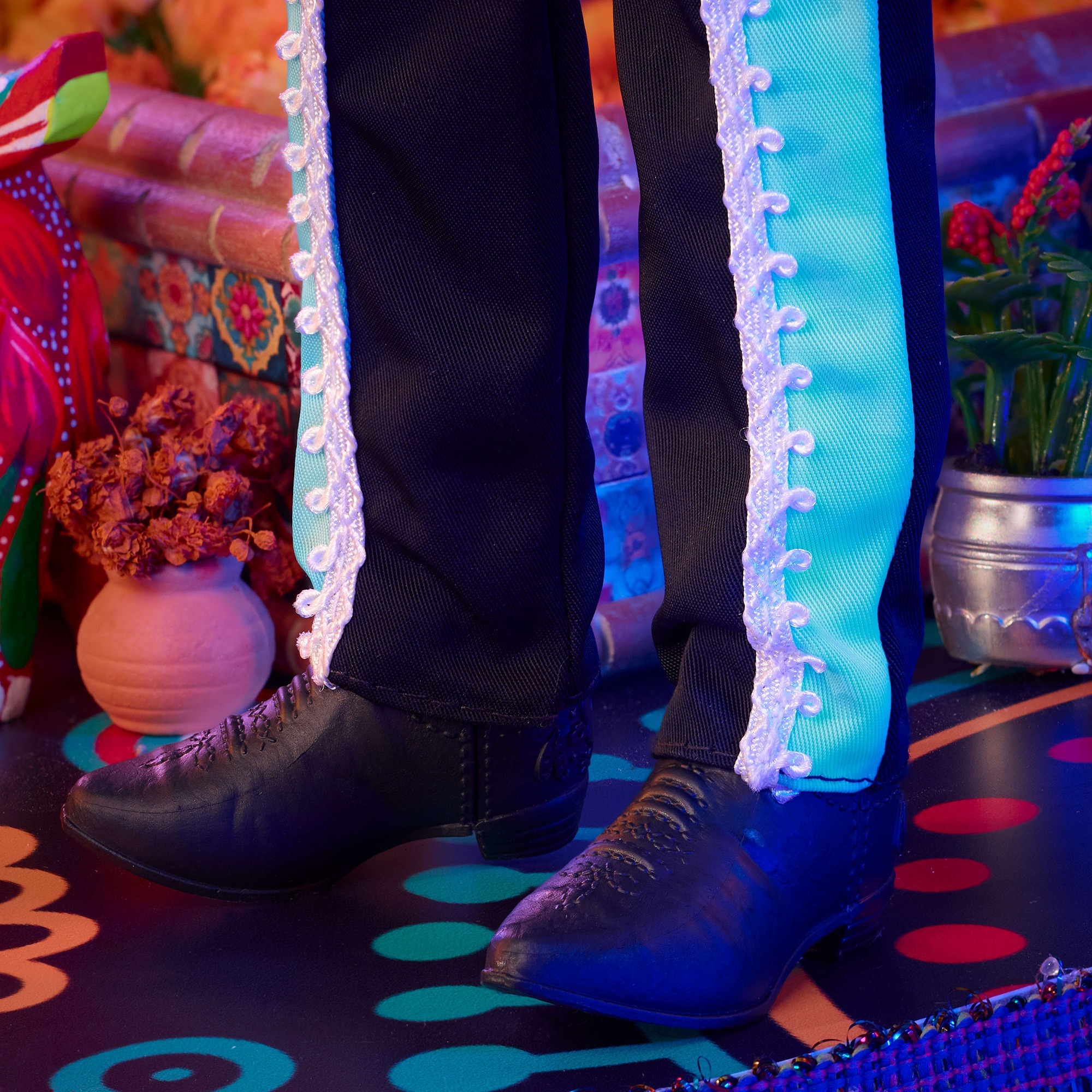 ProduktbeschreibungDie Barbie Día De Muertos-Serie ehrt die Bräuche, Symbole und Rituale dieser festlichen Zeit. Diese Ken-Puppe trägt einen luxuriösen Anzug, der mit Verweisen auf die Traditionen, Symbole und Rituale dieses altehrwürdigen Feiertags versehen ist. Der seidige schwarze Look wird mit himmelblauen Akzenten am Kragen, an den Manschetten und an der Hose aufgelockert. Ein weißes Band entlang der Hose imitiert elegant einen Knochen. Farbenfrohe Verzierungen mit Blumen, Knochen und Totenköpfen verleihen seinem maßgeschneiderten Button-Down zusätzliche Farbtupfer. Ein glänzender schwarzer Sombrero unterstreicht sein blau gefärbtes Calavera-Gesicht, ein Gürtel aus Zuckerschädeln und passende Schuhe runden seinen festlichen Look ab. Diese Sammlerpuppe wird in einer einzigartig illustrierten Verpackung geliefert – perfekt zum Verschenken und Sammeln!