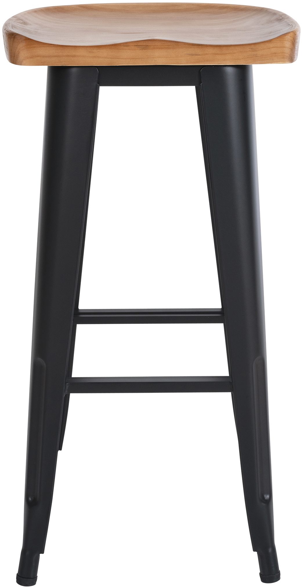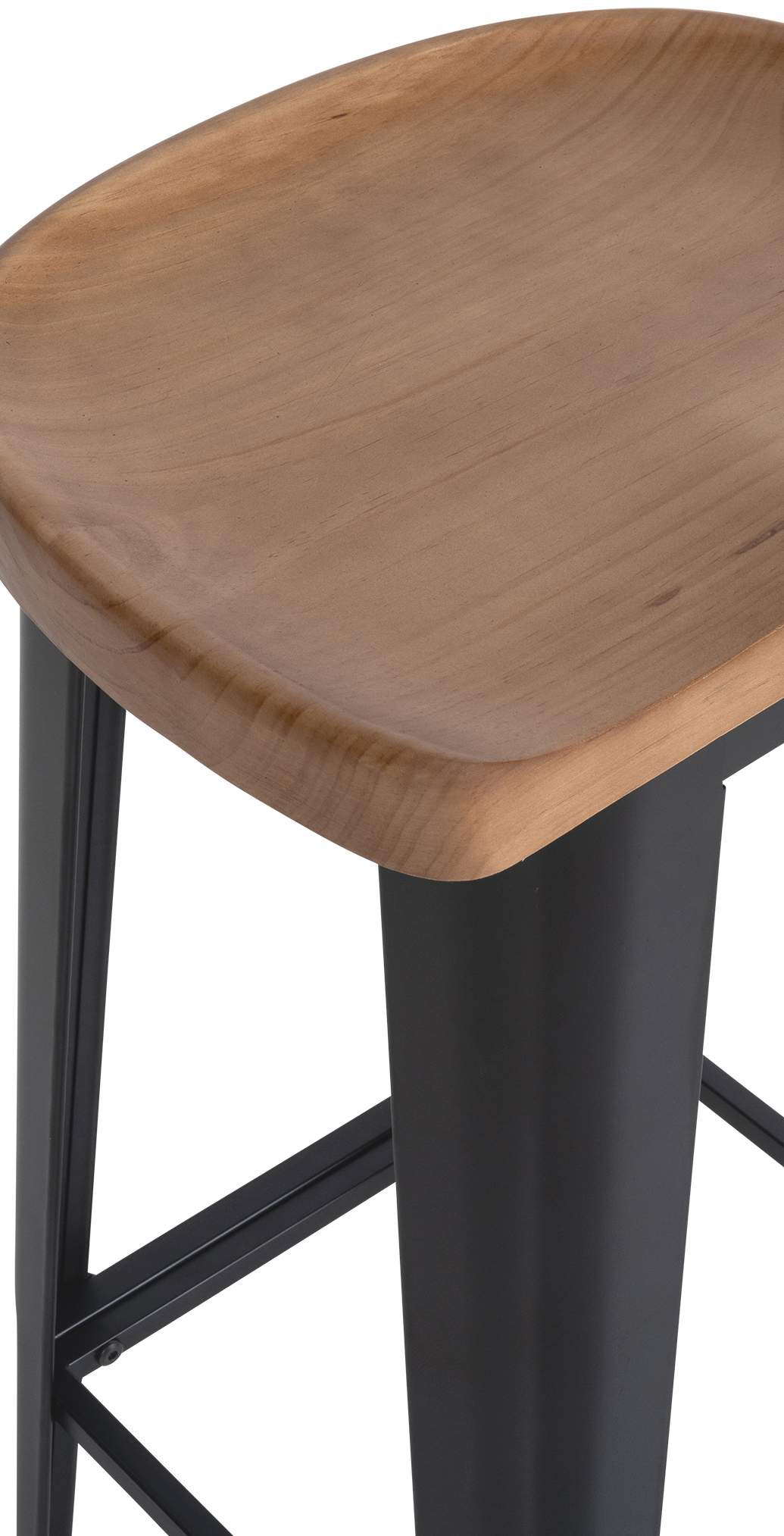 Der Sitzbereich des Tresenstuhls besteht aus massivem Holz mit guten Festigkeitseigenschaften und ist damit ideal geeignet für die Fertigung hochwertiger Möbel. Die Oberfläche ist präzise geschliffen, sodass der Barhocker eine besonders angenehme Haptik hat. Der Hocker steht auf einem Vierfußgestell aus matt-schwarzem Metall.
