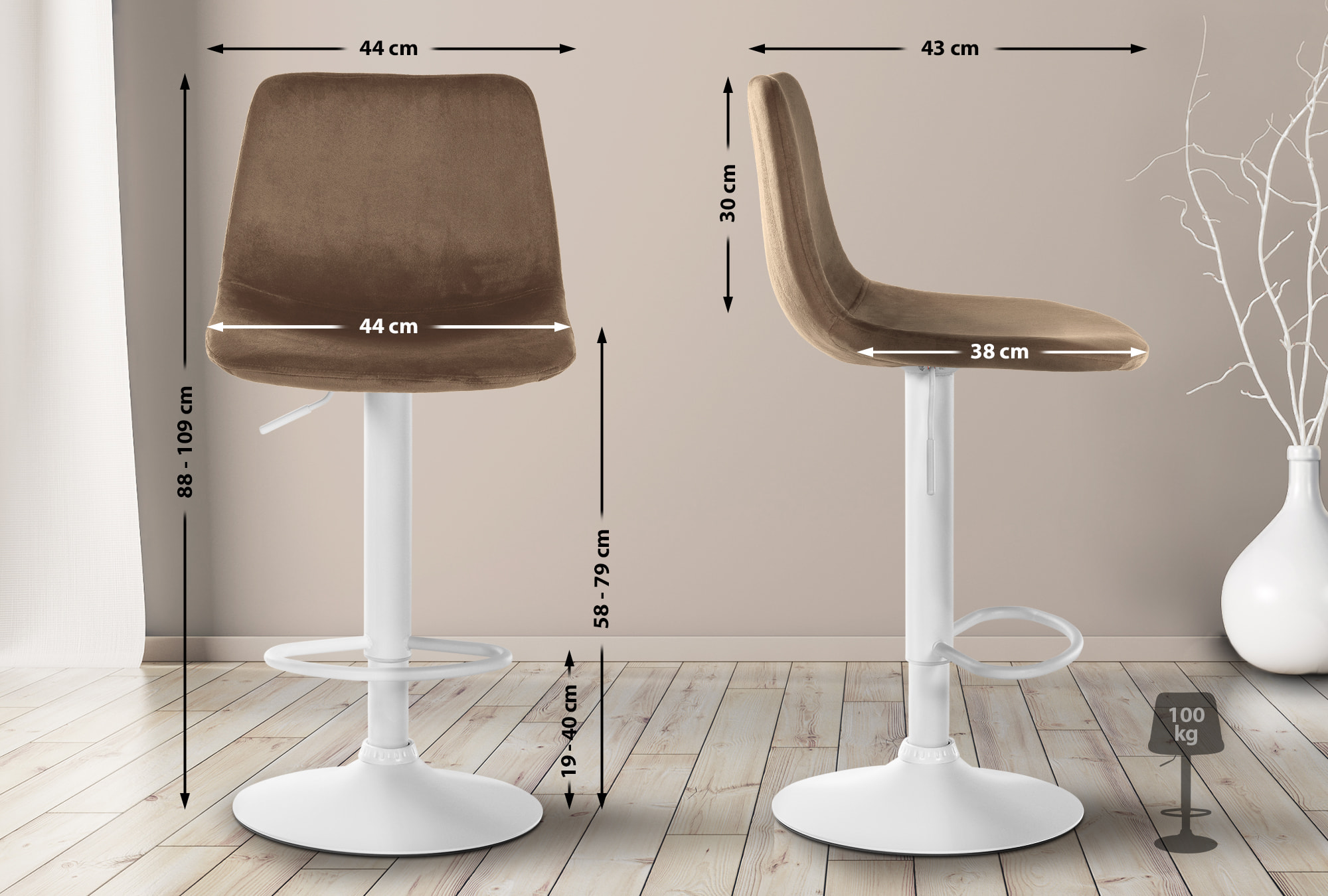 Dieser moderne Barstuhl zeichnet sich durch sein zeitlos schickes Design aus. Der formschöne Sitz verspricht ein fantastisches Sitzgefühl, denn die gepolsterte Rückenlehne gibt Ihrem Rücken den nötigen Halt um stundenlang bequem und komfortabel sitzen zu können. Der Sitz ist mit pflegeleichtem Samt bezogen und das Metallgestell bietet mit seinem Trompetenfuß eine sehr hohe Stabilität. Durch die frei wählbaren Farbkombinationen findet sich für jedes Wohnambiente der passende Barhocker. Die geschwungene Fußstütze lässt Ihre Füße nicht hängen. Der Thekenhocker ist mittels eines Gaslifts stufenlos in der Höhe verstellbar und die Sitzfläche um 360° drehbar, daher ist er bestens für jede Theke geeignet.
