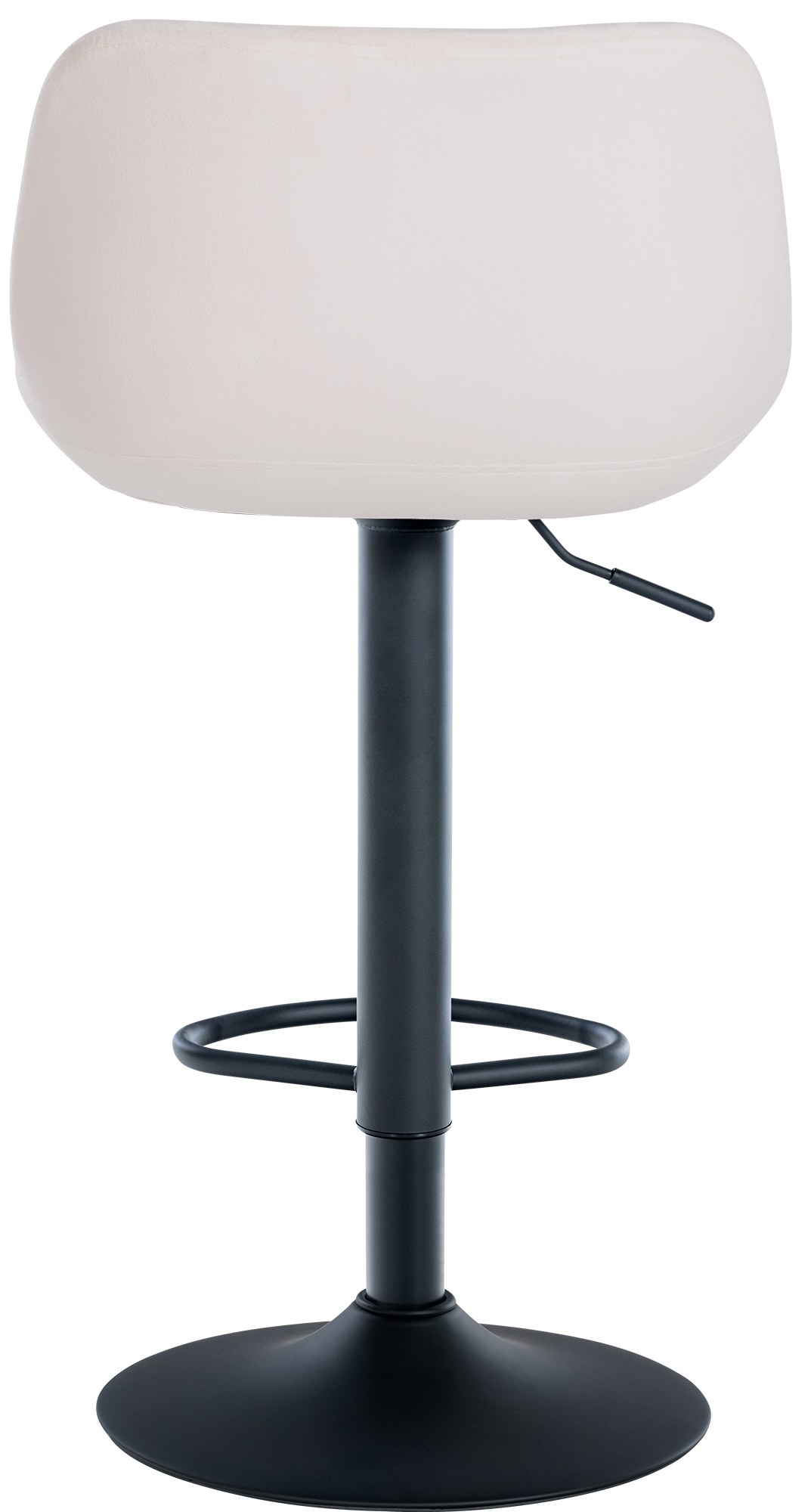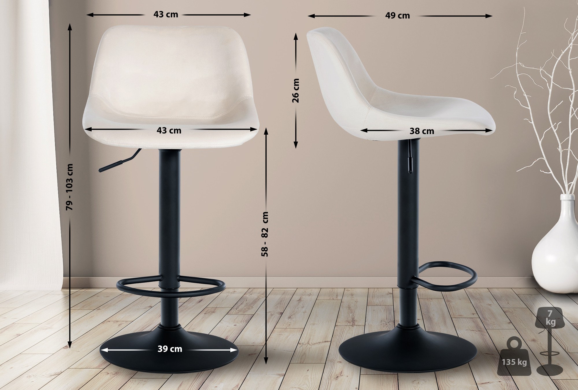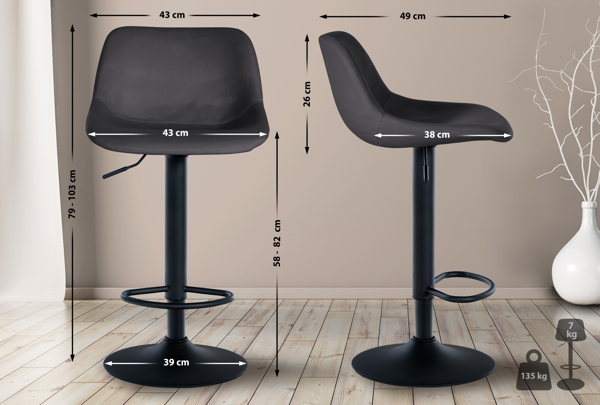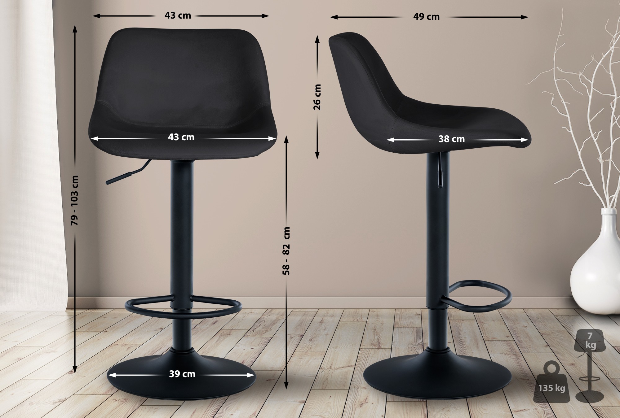 Der Trompetenfuß des Tresenstuhls ist um 360° drehbar und besitzt eine Fußstütze, wodurch ein angenehmes Sitzen über eine längere Zeit gewährleistet ist. Das Metall-Gestell in Schwarz ist höhenverstellbar und bietet einen sicheren Stand. Außerdem ist das Gestell mit Bodenschonern ausgestattet, um ein Zerkratzen des Bodens zu vermeiden.