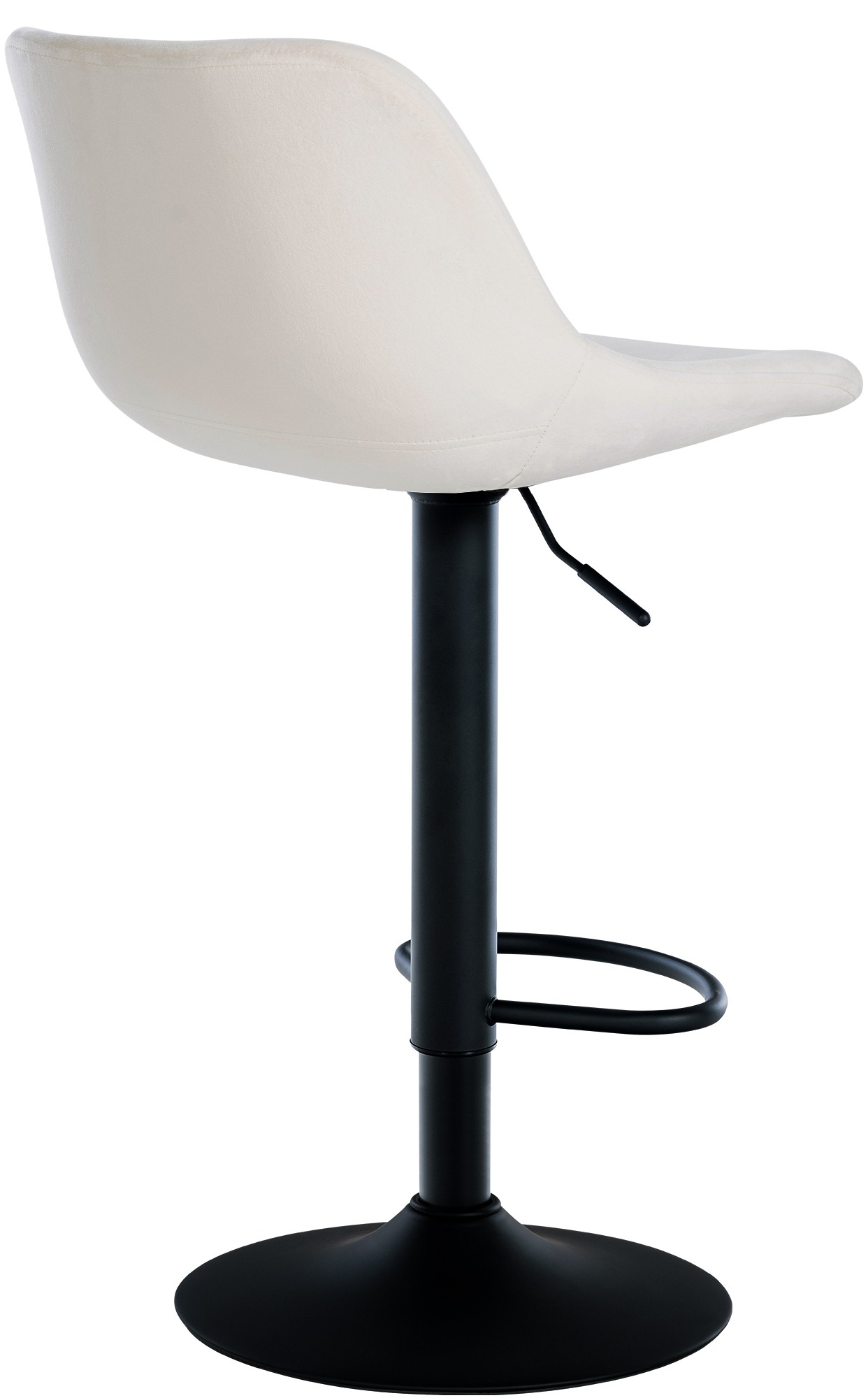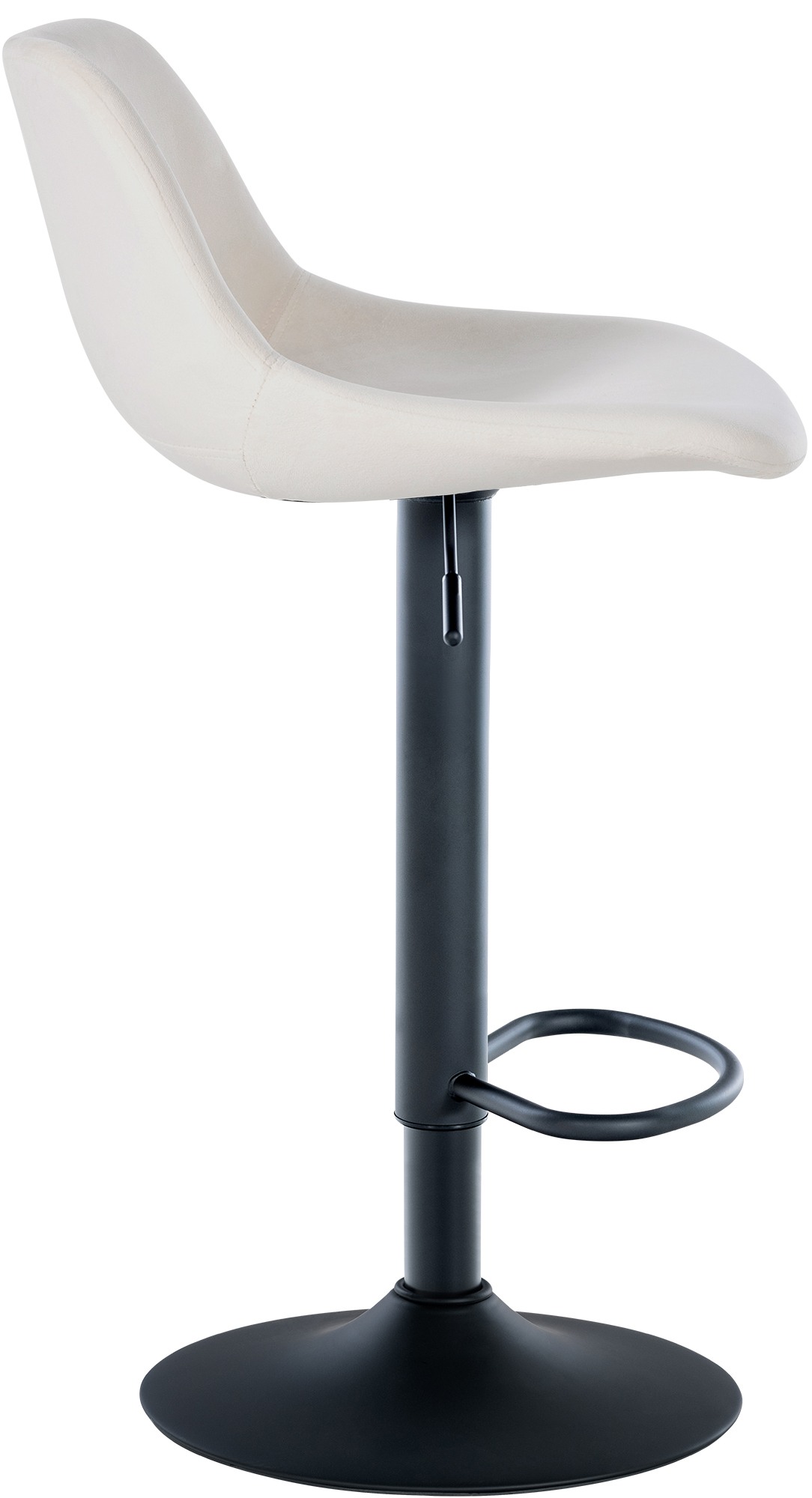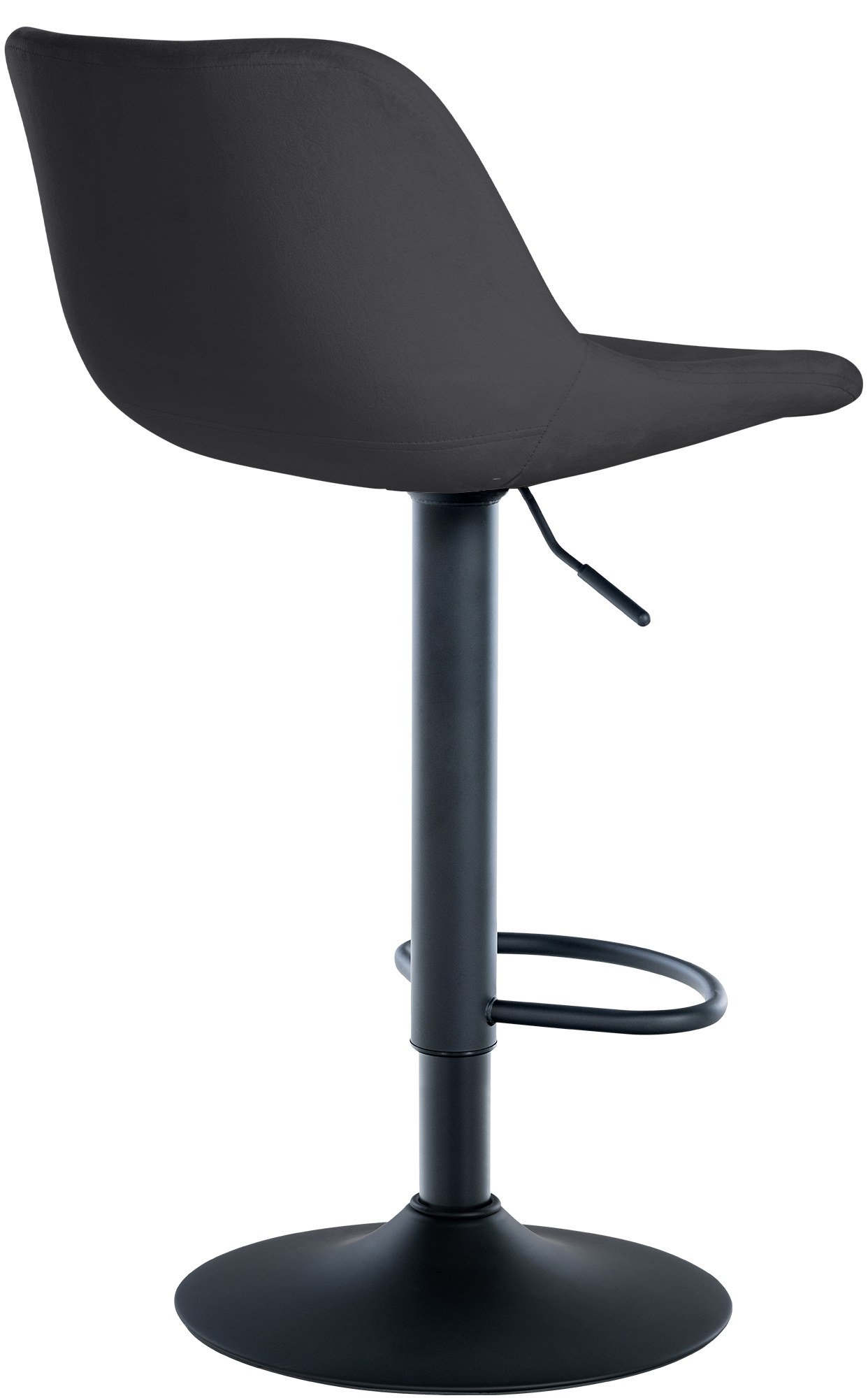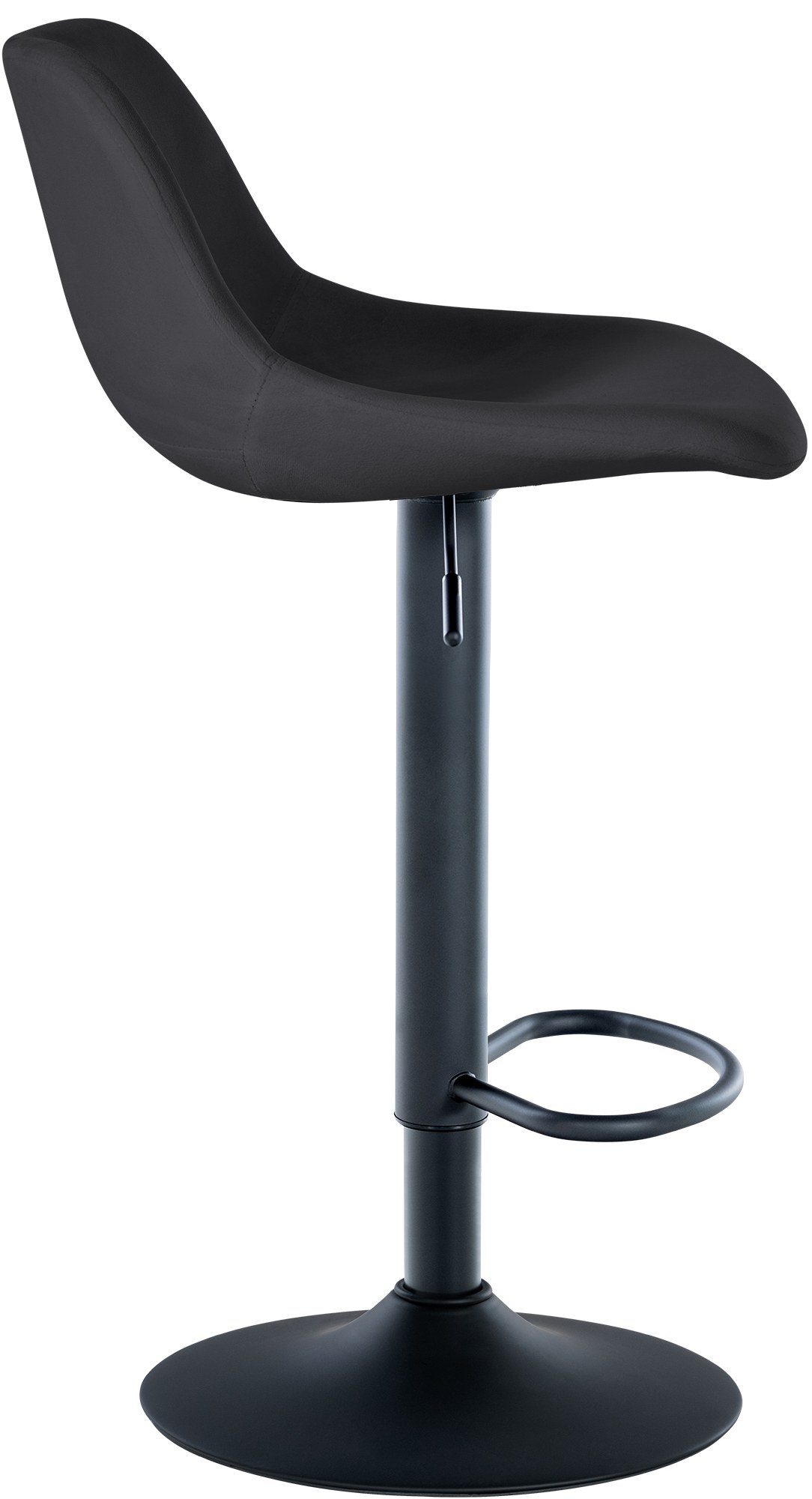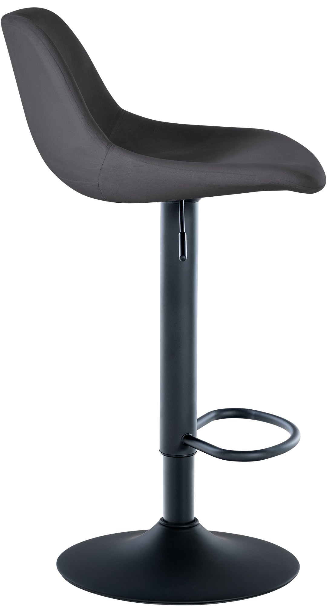 Der Trompetenfuß des Tresenstuhls ist um 360° drehbar und besitzt eine Fußstütze, wodurch ein angenehmes Sitzen über eine längere Zeit gewährleistet ist. Das Metall-Gestell in Schwarz ist höhenverstellbar und bietet einen sicheren Stand. Außerdem ist das Gestell mit Bodenschonern ausgestattet, um ein Zerkratzen des Bodens zu vermeiden.