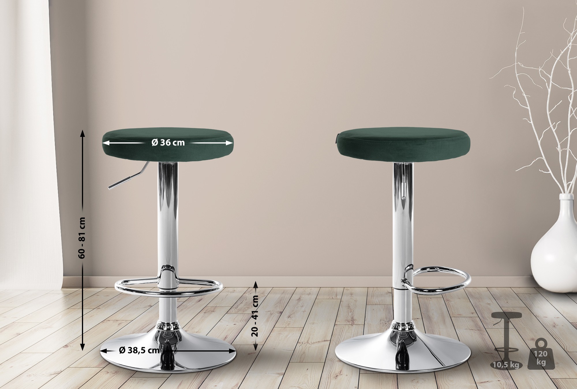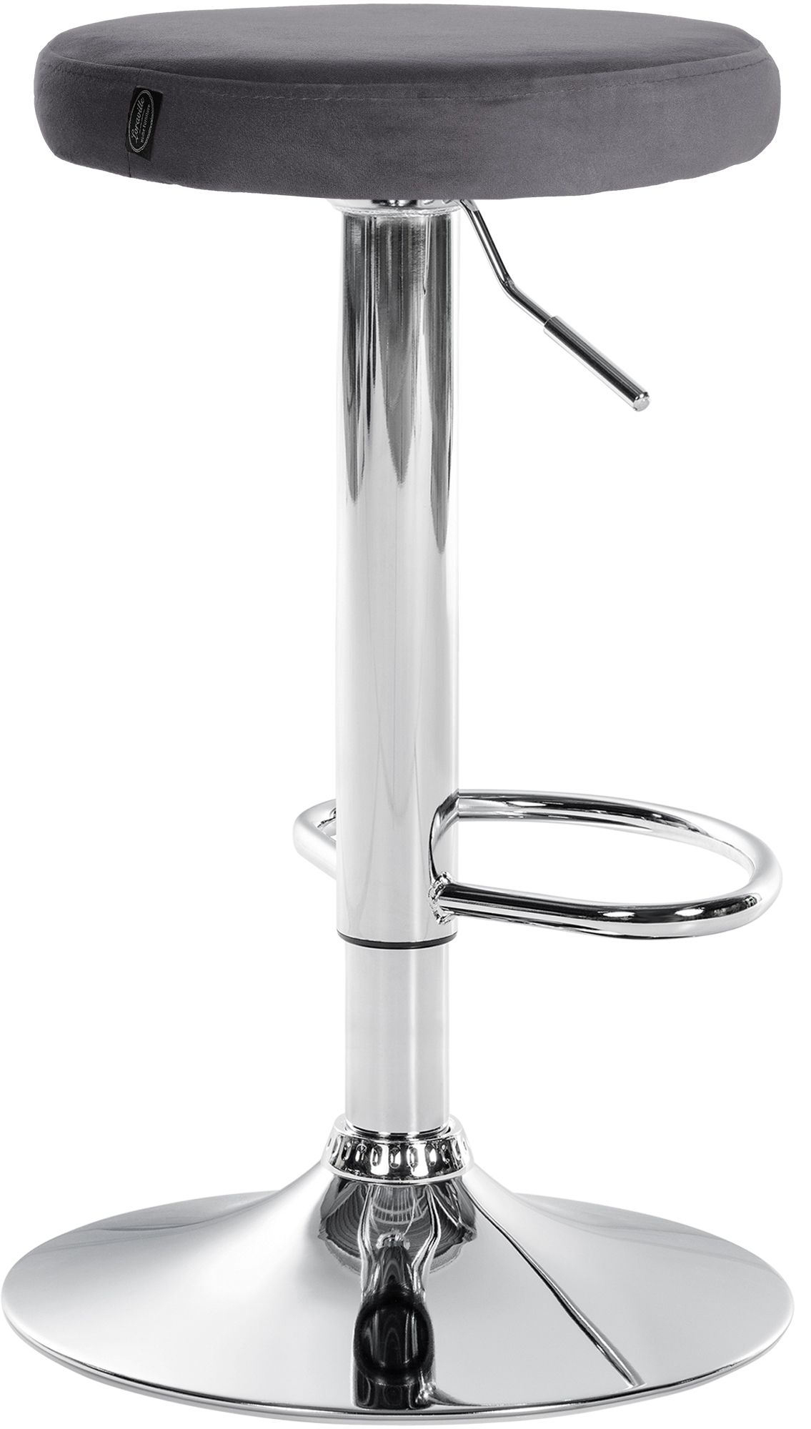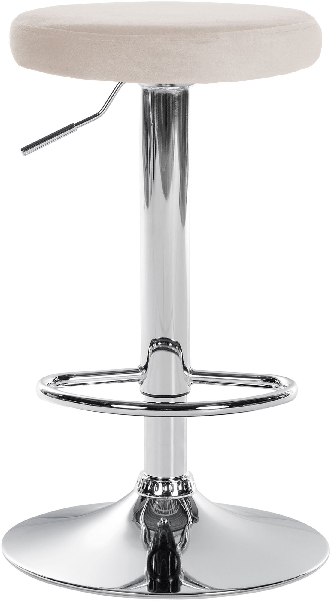 Der Samtbezug der runden, gepolsterten Sitzfläche ist in acht ansprechenden Farben erhältlich, sodass Sie den perfekten Look für Ihr Zuhause auswählen können. Das robuste Metallgestell ist in drei attraktiven Ausführungen erhältlich: matt-weiß, matt-schwarz oder in Chrom-Optik. Eine integrierte Fußablage sorgt für zusätzlichen Komfort.