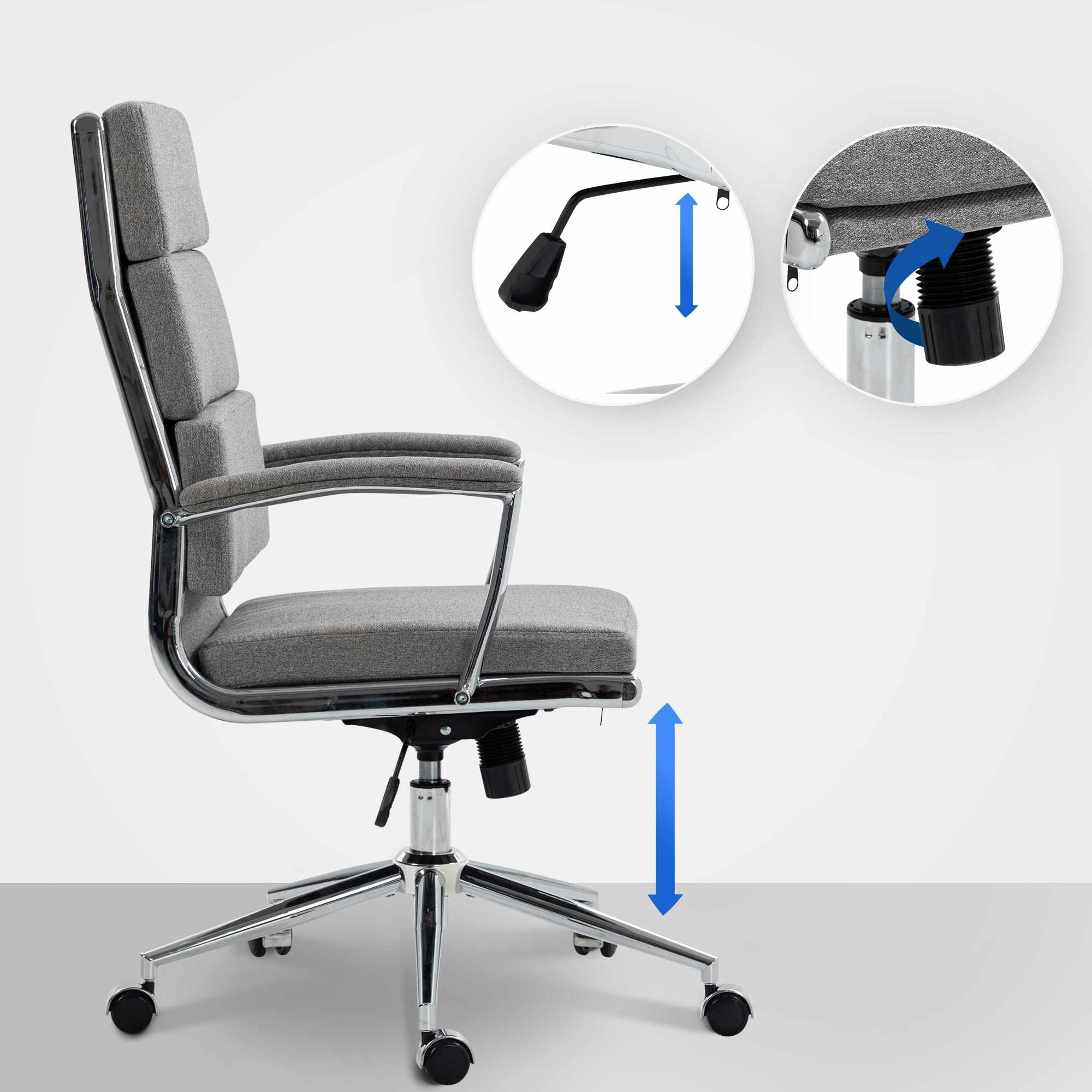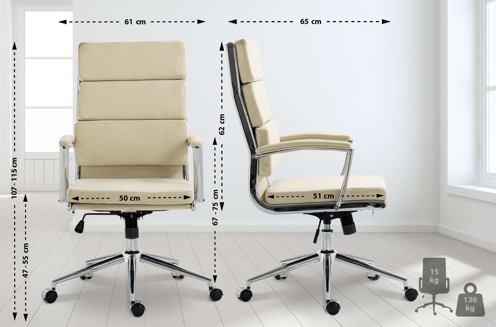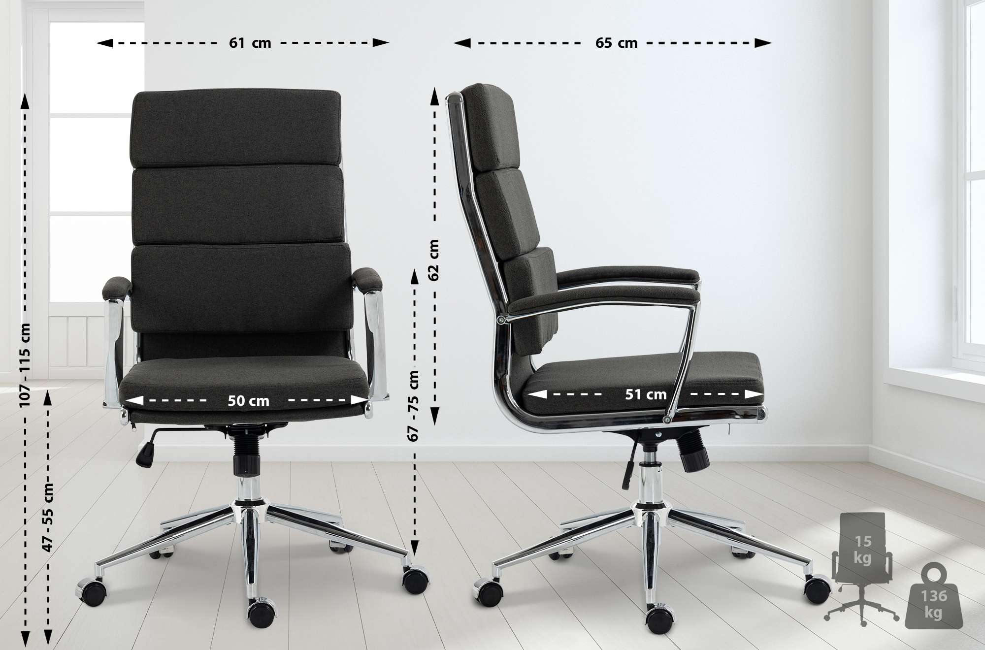 Der Bürostuhl Cleveland vereint ergonomisches Design mit individuellem Komfort und stilvoller Optik. Er ist die perfekte Ergänzung für jedes Büro, in dem Gesundheit und Wohlbefinden am Arbeitsplatz großgeschrieben werden. Die dreifach gepolsterte Rückenlehne und die ergonomische Form unterstützen Ihre natürliche Sitzhaltung. Mit der höhenverstellbaren Sitzfläche, der einstellbaren Wippfunktion und den 360° drehbaren Leichtlaufrollen passt sich der Stuhl flexibel Ihren Bedürfnissen an. Die Auswahl zwischen Echtleder, Kunstleder oder Stoffbezug ermöglicht eine individuelle Gestaltung nach Ihrem persönlichen Geschmack. Das Chromgestell bietet Stabilität und eine lange Lebensdauer. Mit seiner breiten Sitzfläche bietet der Cleveland auch an langen Arbeitstagen optimalen Sitzkomfort.