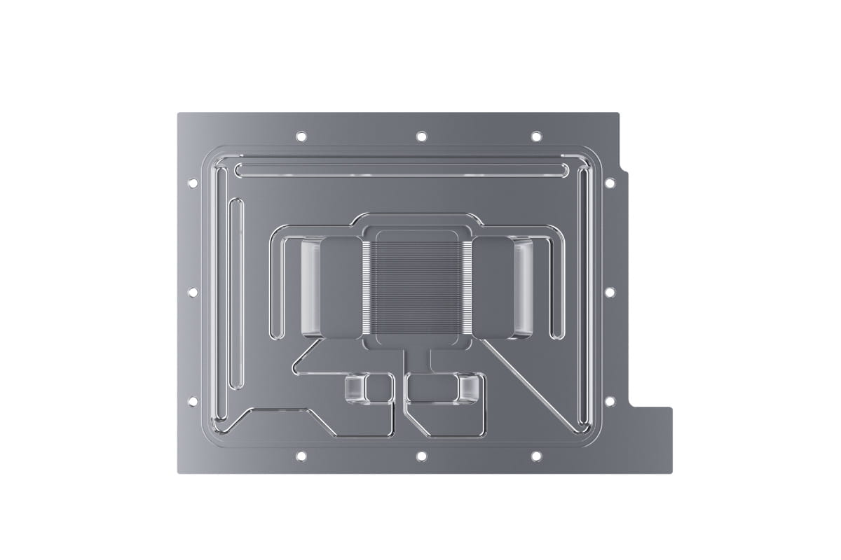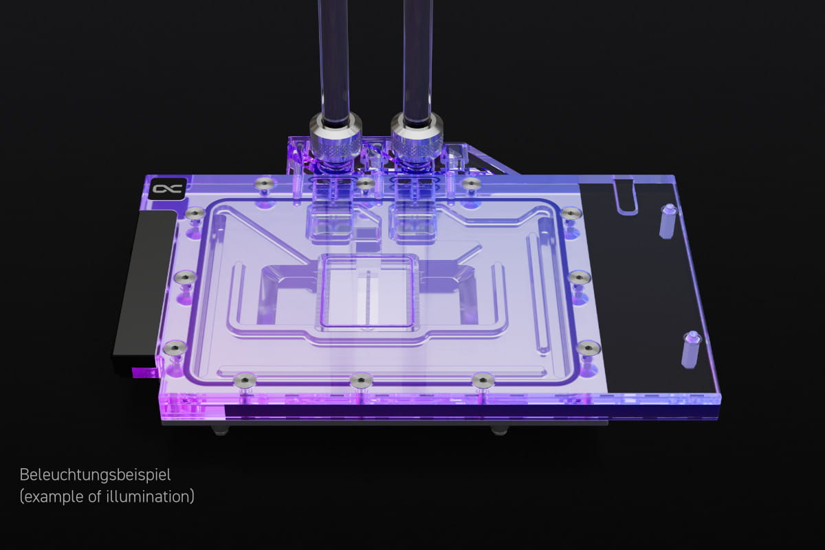 Die nächste Generation – der Eisblock Aurora Wasserkühler für Geforce RTX 4XXX Grafikkarten. Um die enorme Abwärme dieser Grafikkartengeneration bestmöglich abzuführen, wurden am Wasserkühler zahlreiche Optimierungen im Vergleich zum Vorgängermodell durchgeführt. Die Finnenstruktur wurde angepasst und ermöglicht einen sehr guten Wasserdurchfluss bei gleichzeitiger Vergrößerung der Kühlfläche. Die modifizierte Düsenplatte mit verbesserter Zufluss-Engine sorgt für eine optimale Verteilung des Wassers auf den Kühlfinnen. Technische Highlights Die Finnenstruktur dieser Eisblock Kühlergeneration wurde gemeinsam mit Nvidia-Boardpartnern entwickelt. Die Finnendicke beträgt 0.4 mm, der Abstand der Kühlfinnen zueinander 0,4 mm. Das gewährleistet einen sehr guten Wasserdurchfluss bei gleichzeitiger Erhöhung der möglichen Kühlfläche. Die Düsenplatte verfügt über ein überarbeitetes Inlay, dass den Wasserdruck besser auf die Finnen verteilt und die Wärmeaufnahme optimiert. Der angepasste Wasserzufluss verhilft dem Wasser zu einem besseren Einströmwinkel. Verchromtes Kupfer Der Kühler besteht vollständig aus verchromtem Kupfer. Eine Verchromung ist wesentlich härter als eine Vernickelung und dadurch unempfindlicher gegen Säuren, Kratzer und Schäden. Die Gefahr von abplatzenden Vernickelungen ist dadurch vollständig beseitigt. Zusätzlich sieht die Verchromung wesentlich homogener aus und bietet einen Glanz, der durch eine Vernicklung nicht erreicht werden kann. Verchromte Kühler kamen bisher nur im Industriesektor zum Einsatz in Bereichen, in denen extreme Einflüsse auf die Kühler wirken. Design Das Aurora Design der Geforce RTX 4XXX Eisblock Generation ist optisch ruhiger und schlichter. Nur ein O-Ring umläuft den gesamten Kühler. Die Konstruktion rund um die Kühlfinnen und der Jetplate sorgt für eine klarere Optik. Die Beleuchtung der digital adressierbaren RGB-LEDs wird dank der Verchromung noch besser im Kühler verteilt. Das Terminal entspricht in seiner Formgebung dem klassischen Aurora Design. Wärmeleitpaste & Wärmeleitpads Die im Lieferumfang enthaltene Wärmeleitpaste ist s Subzero. Mit einer Wärmeleitfähigkeit von 16 W/mK gehört sie zu den leistungsstärksten Wärmeleitpasten am Markt. Das elektrisch nicht leitende Thermal Grease ist besonders gut geeignet für hohe Anpressdrücke, lässt sich aber aufgrund der Viskosität von 850.000 TF trotzdem perfekt verarbeiten. Auf den Spannungswandlern und dem Grafikspeicher werden Soft Pads mit 1mm Dicke verwendet. Die Wärmeleitfähigkeit der Pads liegt bei 7 W/mK. Die Pads für die Rückseite des PCB sind 3mm dick und verfügen über eine Wärmeleitfähigkeit von 3 W/mK. Kompatibilität: – Asus ROG Strix GeForce RTX 4080 OC, ROG-STRIX-RTX4080-O16G-GAMING, 16GB GDDR6X (90YV0IC0-M0NA00) – Asus ROG Strix GeForce RTX 4080, ROG-STRIX-RTX4080-16G-GAMING, 16GB GDDR6X (90YV0IC1-M0NA00) – Asus TUF Gaming GeForce RTX 4080 OC, TUF-RTX4080-O16G-GAMING, 16GB GDDR6X (90YV0IB0-M0NA00) – Asus TUF Gaming GeForce RTX 4080, TUF-RTX4080-16G-GAMING, 16GB GDDR6X (90YV0IB1-M0NA00) – Asus ROG Strix GeForce RTX 4080 SUPER 16GB GDDR6X – Asus ROG Strix GeForce RTX 4080 SUPER 16GB GDDR6X OC Edition – Asus ROG Strix GeForce RTX 4080 SUPER 16GB GDDR6X White Edition – Asus ROG Strix GeForce RTX 4080 SUPER 16GB GDDR6X White OC Edition – Asus TUF Gaming GeForce RTX 4080 SUPER 16GB GDDR6X – Asus TUF Gaming GeForce RTX 4080 SUPER 16GB GDDR6X OC Edition Technische Daten Kühler Abmessungen (L x B x H) 220,90 x 157 x 34,10mm Material Kühlerboden verchromtes Kupfer Material Kühleroberseite Acryl Maximale Arbeitstemperatur 60°C Druckgetestet 0,8 bar Anschlüsse 4 x G1/4" Dicke Kühlfinnen 0,4mm Abstand Kühlfinnen 0,4mm Beleuchtung 11x digitale aRGB LEDs Stromanschluss digital aRGB LEDs 3-Pin JST Spannung digital aRGB LEDs 5V Farbe transparent Technische Daten Backplate Abmessungen (L x B x H) 220,90 x 132,50 x 6mm Material Aluminium Farbe schwarz