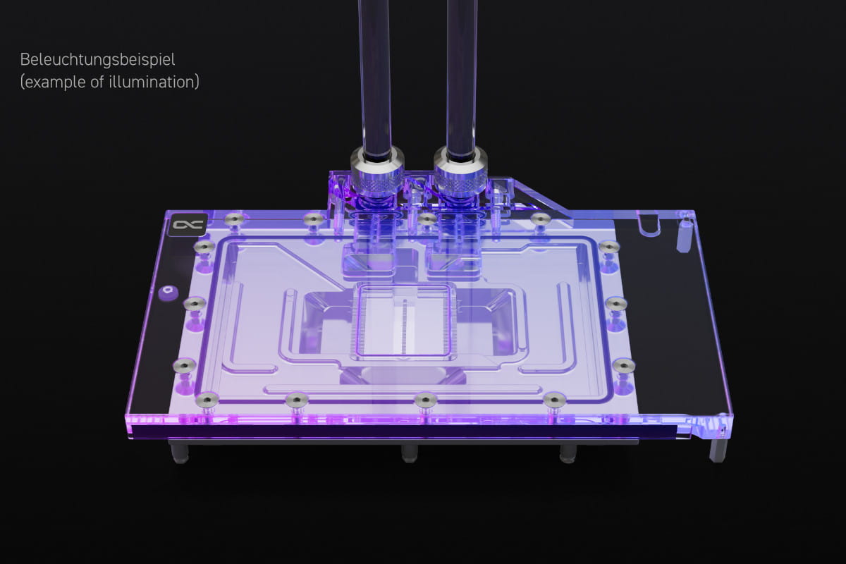 Die nächste Generation – der Eisblock Aurora Wasserkühler für Geforce RTX 40XX Grafikkarten. Um die enorme Abwärme dieser Grafikkartengeneration bestmöglich abzuführen, wurden am Wasserkühler zahlreiche Optimierungen im Vergleich zum Vorgängermodell durchgeführt. Die Finnenstruktur wurde angepasst und ermöglicht einen sehr guten Wasserdurchfluss bei gleichzeitiger Vergrößerung der Kühlfläche. Die modifizierte Düsenplatte mit verbesserter Zufluss-Engine sorgt für eine optimale Verteilung des Wassers auf den Kühlfinnen. Technische Highlights Die Finnenstruktur dieser Eisblock Kühlergeneration wurde gemeinsam mit Nvidia-Boardpartnern entwickelt. Die Finnendicke beträgt 0.4 mm, der Abstand der Kühlfinnen zueinander 0,4 mm. Das gewährleistet einen sehr guten Wasserdurchfluss bei gleichzeitiger Erhöhung der möglichen Kühlfläche. Die Düsenplatte verfügt über ein überarbeitetes Inlay, dass den Wasserdruck besser auf die Finnen verteilt und die Wärmeaufnahme optimiert. Der angepasste Wasserzufluss verhilft dem Wasser zu einem besseren Einströmwinkel. Verchromtes Kupfer Der Kühler besteht vollständig aus verchromtem Kupfer. Eine Verchromung ist wesentlich härter als eine Vernickelung und dadurch unempfindlicher gegen Säuren, Kratzer und Schäden. Die Gefahr von abplatzenden Vernickelungen ist dadurch vollständig beseitigt. Zusätzlich sieht die Verchromung wesentlich homogener aus und bietet einen Glanz, der durch eine Vernicklung nicht erreicht werden kann. Verchromte Kühler kamen bisher nur im Industriesektor zum Einsatz in Bereichen, in denen extreme Einflüsse auf die Kühler wirken. Design Das Aurora Design der Geforce RTX 40XX Eisblock Generation ist optisch ruhiger und schlichter. Nur ein O-Ring umläuft den gesamten Kühler. Die Konstruktion rund um die Kühlfinnen und der Jetplate sorgt für eine klarere Optik. Die Beleuchtung der digital adressierbaren RGB-LEDs wird dank der Verchromung noch besser im Kühler verteilt. Das Terminal entspricht in seiner Formgebung dem klassischen Aurora Design. Wärmeleitpaste & Wärmeleitpads Die im Lieferumfang enthaltene Wärmeleitpaste ist s Subzero. Mit einer Wärmeleitfähigkeit von 16 W/mK gehört sie zu den leistungsstärksten Wärmeleitpasten am Markt. Das elektrisch nicht leitende Thermal Grease ist besonders gut geeignet für hohe Anpressdrücke, lässt sich aber aufgrund der Viskosität von 850.000 TF trotzdem perfekt verarbeiten. Auf den Spannungswandlern und dem Grafikspeicher werden Soft Pads mit 1mm Dicke verwendet. Die Wärmeleitfähigkeit der Pads liegt bei 7 W/mK. Die Pads für die Rückseite des PCB sind 3mm dick und verfügen über eine Wärmeleitfähigkeit von 3 W/mK. Kompatibilität: – Gainward GeForce RTX 4080 Phantom GS, 16GB GDDR6X (3499) – Gainward GeForce RTX 4080 Phantom, 16GB GDDR6X (3505) – Palit GeForce RTX 4080 GameRock OC, 16GB GDDR6X (NED4080S19T2-1030G) – Palit GeForce RTX 4080 GameRock OmniBlack, 16GB GDDR6X (NED4080019T2-1030Q) – Palit GeForce RTX 4080 GameRock, 16GB GDDR6X (NED4080019T2-1030G) Technische Daten Kühler L x B x H 215,50 x 145,90 x 34,17mm Material Kühlerboden verchromtes Kupfer Material Kühleroberseite Acryl Druckgetestet 0,8 bar Maximale Arbeitstemperatur 60°C Anschlüsse 4 x G1/4" Dicke Kühlfinnen 0,4mm Abstand Kühlfinnen 0,4mm Beleuchtung digital aRGB LEDs Stromanschluss digital aRGB LEDs 3-Pin JST Spannung digital aRGB LEDs 5V Anzahl digital aRGB LEDs 12 Technische Daten Backplate L x B x H 215,50 x 121,40 x 6mm Material Aluminium Farbe schwarz