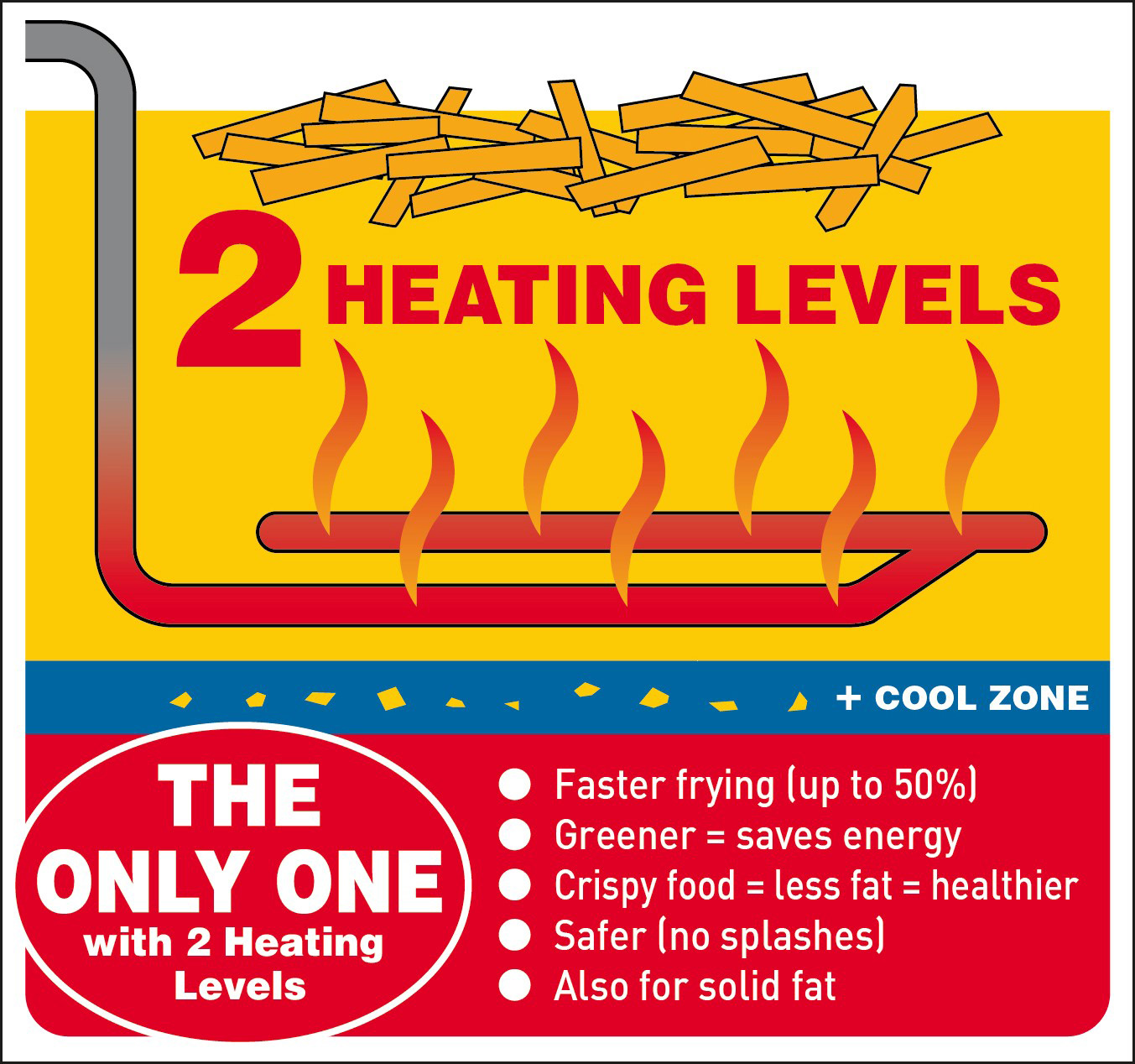Gehäuse, Deckel und Schaltkastenblende aus Edelstahl n- 2-Level-Heizkörper: Schnelles Frittieren, Energieersparnisse, knusprigere Ergebnisse n- Ölbehälter mit wichtigem Kaltzonenbereich: herunterfallende Krümel verbrennen nicht am Boden und setzen so keine gesundheitlich bedenklichen oder geschmacksverändernden Stoffe frei. So kann das Öl auch länger benutzt werden n- Schaltkasten und Griffe aus Kunststoff n- Sicherheitsthermostat n- Überhitzungsschutz n- ohne Fettablauf n- Korbgröße 180x255x105 mm