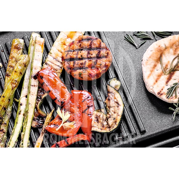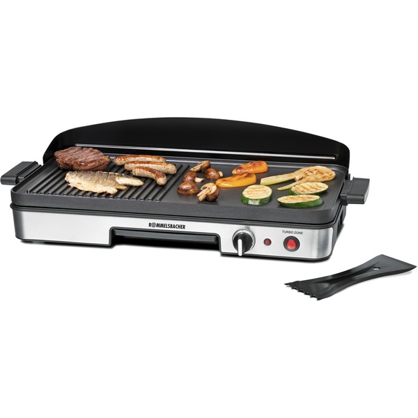 ProduktbeschreibungDer Tischgrill BBQ 2003 mit hochwertiger Edelstahl-Front kann im Freien, auf Balkon und Terrasse oder im Innenbereich, bei Tisch und in der Küche eingesetzt werden. Er sorgt für ein sicheres und komfortables Grillvergnügen, ganz ohne Rauch und Feuer. Grillen mit Strom bedeutet schnelles Aufheizen bei präziser Temperaturregelung. Das lästige Entsorgen von Asche- oder Kohleresten entfällt. Die Grillplatte aus stabilem Alu-Druckguss mit sehr robuster Antihaftbeschichtung ist in zwei Zonen aufgeteilt. Auf der geriffelten Fläche erhalten Fleisch und Gemüse das typische Grillmuster, auf der glatten Teppanyaki Fläche lassen sich Fisch, Gemüse, aber auch Pfannkuchen und Süßspeisen zubereiten. Die Heizelemente sind direkt in die Grillplatten eingearbeitet, dadurch wird eine optimale Temperaturverteilung erreicht. Die Regelung der Temperatur ist stufenlos über den Drehregler möglich. Zusätzlich hat der Tischgrill BBQ 2003 eine zuschaltbare Turbo-Grillzone für schnelles, scharfes Anbraten. Der integrierte Fettablauf, die entnehmbare Auffangschale, die wärmeisolierten Handgriffe, der abnehmbare Spritz- / Windschutz und die superleichte Reinigung sorgen für den sehr guten Bedienkomfort des BBQ 2003.