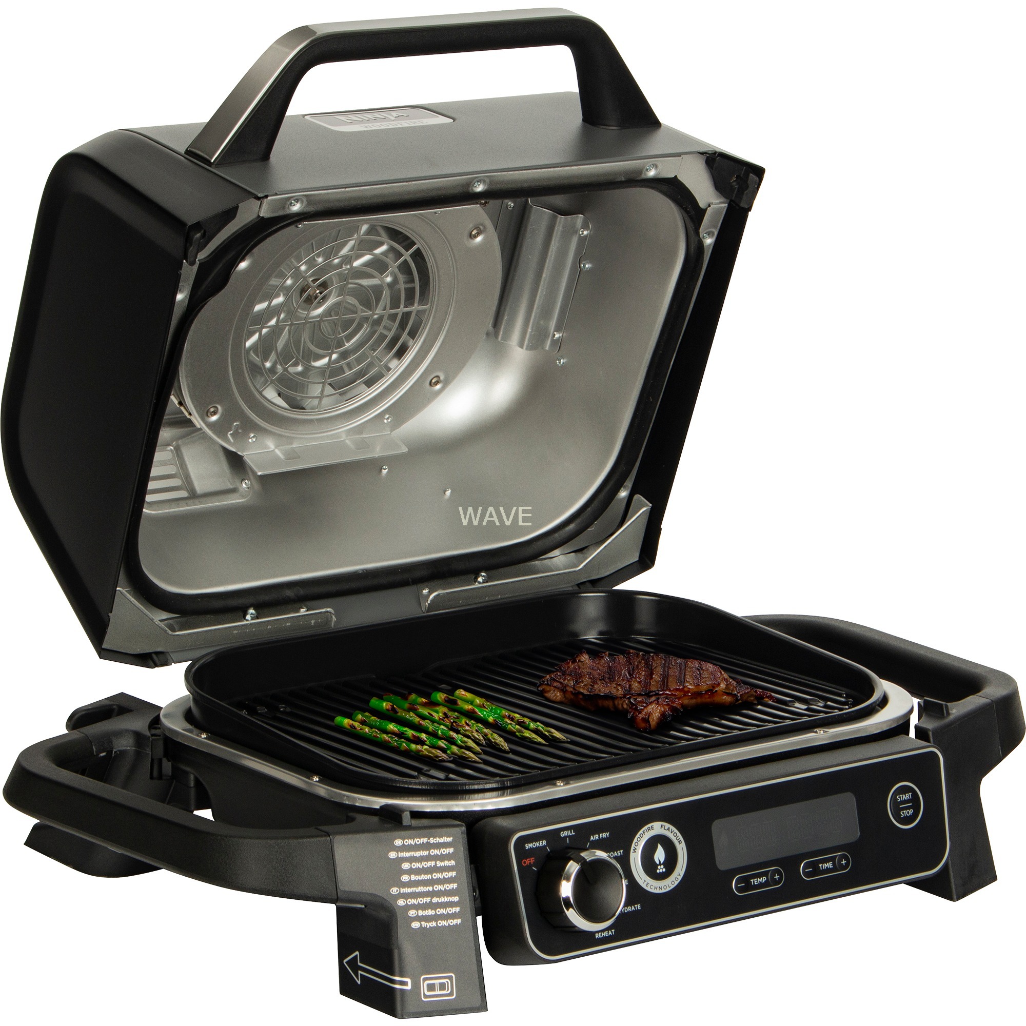 ProduktbeschreibungDer Ninja Woodfire Elektrogrill & Smoker Woodfire OG701EU ist mehr als ein Outdoor-Grill, er kann BBQ-Grillen und -Smoken, Heißluft-Frittieren, Braten, Backen und sogar Dörren, wahlweise mit natürlichem Holzaroma. Der vielseitige Grill und Smoker erreicht 260°C, wird mit Strom betrieben und ist so immer einsatzbereit. Einfach einstecken und los geht’s, mit perfekten Grillergebnisse mit vollem Raucharoma, ohne Holzkohle oder Propan-Flammen. Mit dem BBQ-Grill erhält man das authentische Grillergebnis eines traditionellen Grills, ohne dass man sich darum kümmern muss. Der Woodfire OG701EU schafft alles, von Grill-Klassikern wie Burgern, Würstchen und Halloumi-Spießen bis hin zu zartem Rinderbrustfilet, saftigen Steaks, Thunfischsteaks, gegrilltem Gemüse und vielem mehr. Man kann mit offenem Deckel grillen, für ein authentisches Grillerlebnis, oder man lässt den Ninja die ganze Arbeit machen, indem man den Deckel einfach schließt. Das ist optimal, um größere Fleischstücke oder gefrorene Lebensmittel perfekt zu garen. Die integrierte selbstzündende Smoker-Box verbrennt natürliche Holzpellets und sorgt so für authentischen Grillgeschmack. Eine Konvektionsgebläse bewirkt eine schnelle Zirkulation der Luft und des Holzfeuerrauchs für schnelles, gleichmäßiges Garen und optimale Aromaaufnahme. Das langsame Räuchern eignet sich perfekt für große Fleischstücke und verleiht den Speisen bei allen Funktionen ein unvergleichliches Raucharoma. Als Heißluftfritteuse eingesetzt, sorgen hohe Temperaturen und ein Hochgeschwindigkeitsgebläse für ein knuspriges Ergebnis und bis zu 75% weniger Fett als beim Frittieren. Insgesamt bietet der Ninja Woodfire sieben Kochfunktionen, darunter Heißluft-Frittieren, Braten, Backen, Aufwärmen und Dörren. Zusätzlich kann man den Zutaten einen Hauch von rauchigem Holzaroma verleihen. Die integrierte, entnehmbare Smoker-Box ermöglicht es, jede Kochfunktion mit reichhaltigen Holzfeueraromen zu versehen. Die exklusiven Ninja Woodfire Pellets bestehen zu 100% aus hochwertigem Hartholz und dienen als Geschmacksgeber, nicht als Brennstoff. Die charakteristischen Mischungen verleihen allen Gerichten im Pelletgrill ein rauchiges Aroma. Der Woodfire enthält ein Holzpellet-Starterpaket mit zwei Geschmacksrichtungen und eine Schaufel in perfekter Größe. Ein 900g-Beutel reicht für bis zu 20 Räuchervorgänge. Auf die 28cm x 38cm große Grillplatte passen 8 Burger, 16 Würstchen, 2 Rippchen oder eine 2 kg schwere Schweineschulter. Im Frittierkorb können bis zu 1 kg Hähnchenflügel oder Wedges gegart werden. Ohne Gas und ohne Flammen kann der Grill sicher in Gärten, auf Terrassen, Campingplätzen, Balkonen und anderen kleinen Außenbereichen verwendet werden. Oberes und unteres Heizelement mit Konvektionsgebläse sorgen für gleichmäßiges Garen, es ist kein Wenden nötig. Die antihaftbeschichtete Grillplatte und die herausnehmbare Fettauffangschale machen die Reinigung einfach. Mit dem in der Verpackung enthaltenen Rezeptbuch kann man sofort loslegen. Die hochwertigen Materialien von Ninja halten dem ganzjährigen Kochen und Lagern im Freien stand. Der Grill ist wasserdicht nach IPX4, und rutschfeste Füße sorgen für einen guten Halt.