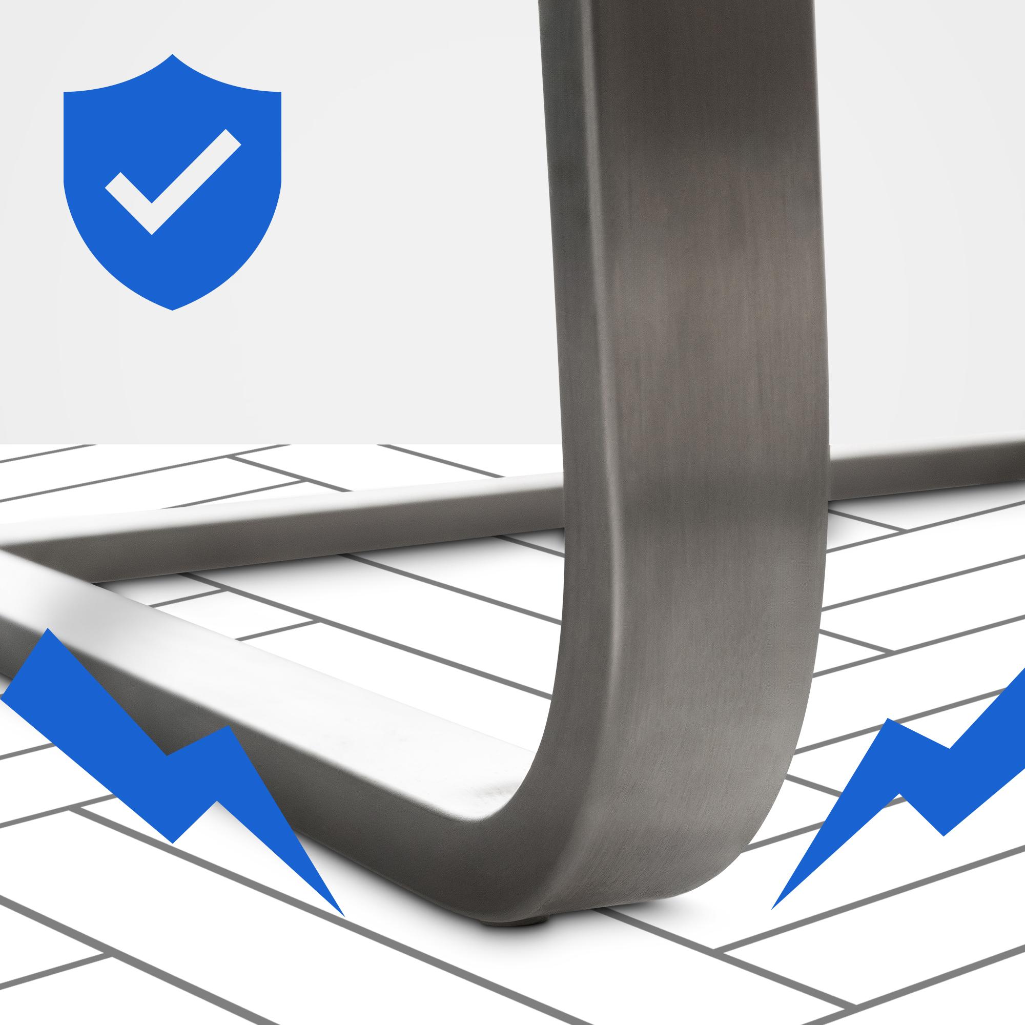 Das Gestell besteht aus robustem, matt gebürstetem Edelstahl, das für eine lange Haltbarkeit und Stabilität sorgt. Die Sitzfläche und die Rückenlehne sind mit einem langlebigen Kunstleder bezogen und verfügen über eine dicke Polsterung, die für hohen Sitzkomfort sorgt. Die ergonomisch geformte Rückenlehne unterstützt die natürliche Körperhaltung und reduziert den Druck auf die Taille, was besonders bei längerem Sitzen von Vorteil ist.