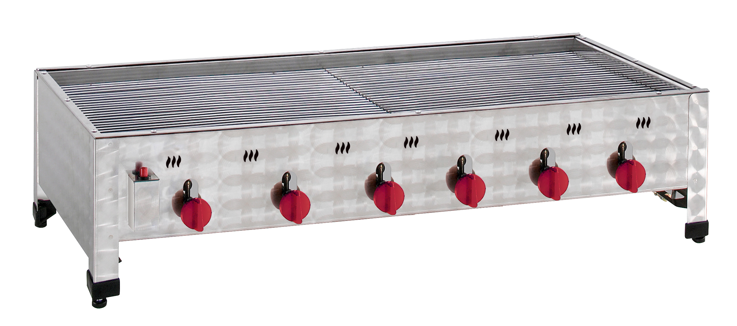 Komplett inkl. Rost und Schwarzblechpfanne mit Fixierung n- Gehäuse doppelwandiger Edelstahl n- Mit Flammabdeckung und Fettwanne n- Piezo-Zündsystem n- Inkl. Schlauch und Standard-Druckminderer (nicht für den gewerblichen Einsatz zugelassen) n- Für Propan-/Butangas n- Einzeln regulierbare 3-Wege-Rohrbrennersysteme verteilen die Hitze gleichmäßig n- 2 halbe Roste à 550×485 mm n- Pfanne 1090x490x57 mm n- Verbrauch 1,89 kg/h