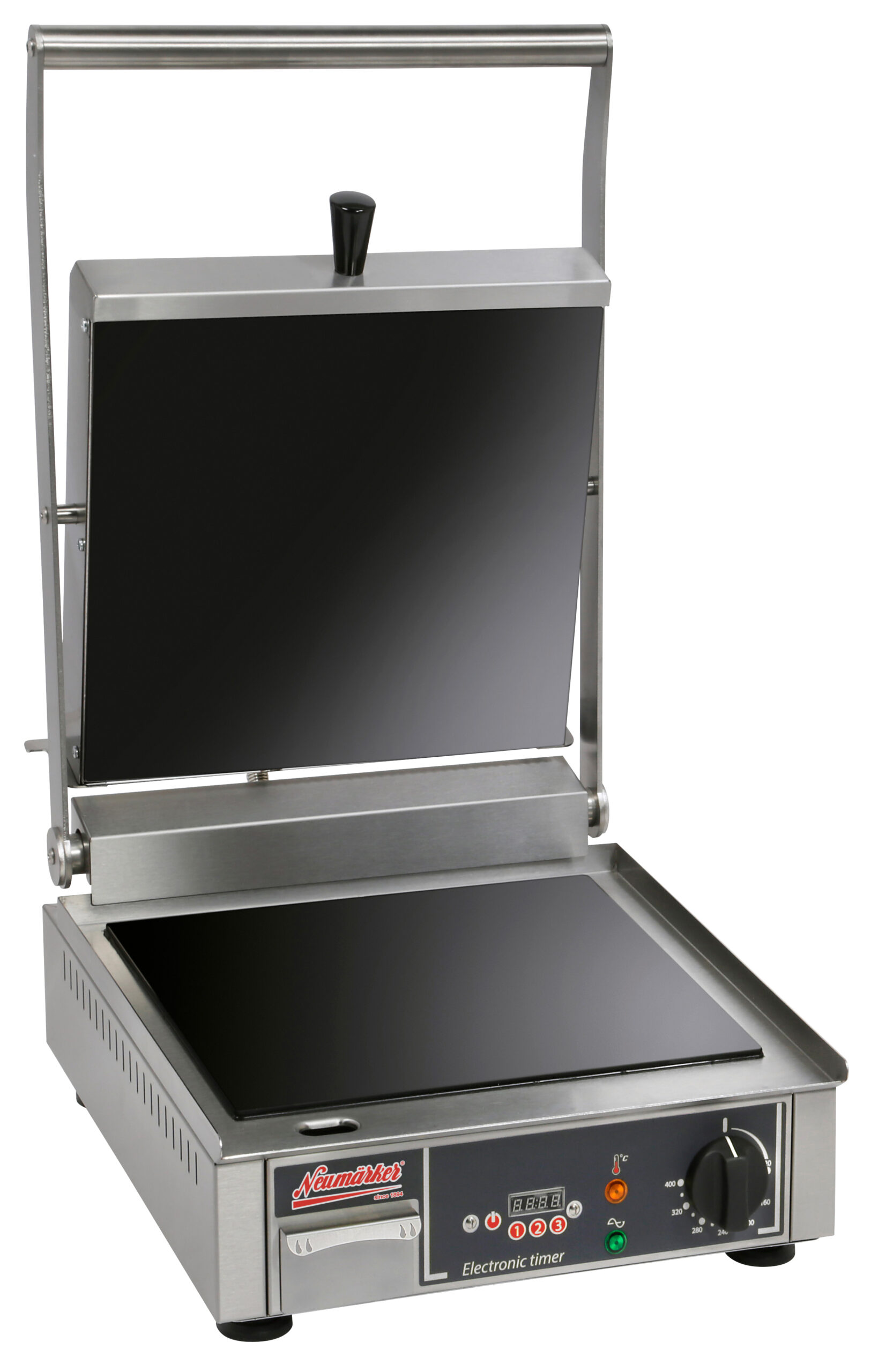 Kontaktgrill mit Grillplatten aus Glaskeramik: Besonders schnelle Zubereitung und einfache Reinigung n- Ideal für Paninis, Tacos, Sandwiches, Foccacia, Baguettes… n- Direkt einsatzbereit durch kurze Aufheizzeit: In nur etwa 2 Minuten auf 200°C n- Effektvolle Kombination von Kontakthitze und Infrarotstrahlung, die bis in den Kern des Grillgutes vordringt: In kürzester Zeit außen knusprig und heiß im Inneren n- Die Zubereitung von 3 Paninis gleichzeitig bei einer Grillzeit von 1 Minute 45 Sek. ergibt mehr als 90 Paninis pro Stunde! n- Ofen-Effekt: Der zwischen die Grillplatten einsetzbare Abstandshalter verwandelt Ihren Kontaktgrill in einen Speed-Ofen n- Einfache Reinigung der glatten Oberflächen aus Glas n- Das geschlossene, porenfreie Material verhindert die Geschmacksübertragung bei wechselnden Grillgut n- Fettablauf mit herausnehmbarer Sammelwanne n- Gehäuse, Hebel und Griff aus Edelstahl n- Temperaturbereich 0-350°C n- Digitaltimer mit Speicher für 3 individuell einstellbare Zubereitungszeiten n- Der sekundengenaue Digitaltimer gewährleistet eine beständige Produktqualität und eine Zubereitung auf den Punkt, auch bei wechselndem Personal