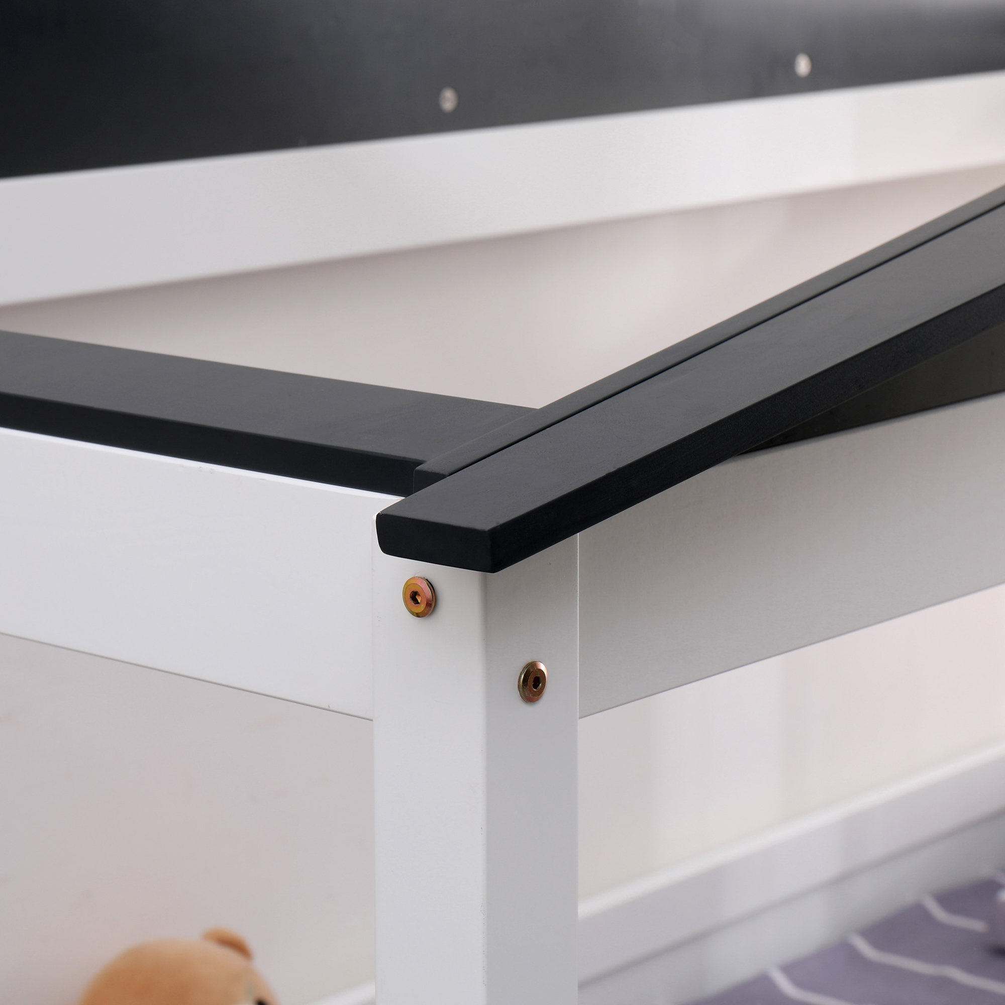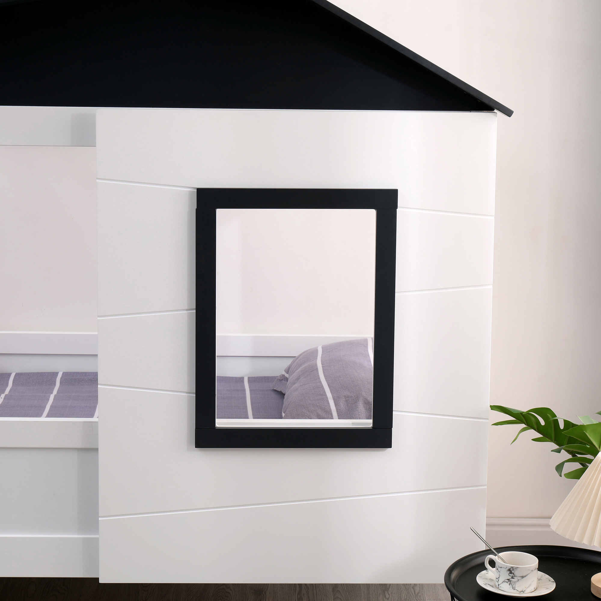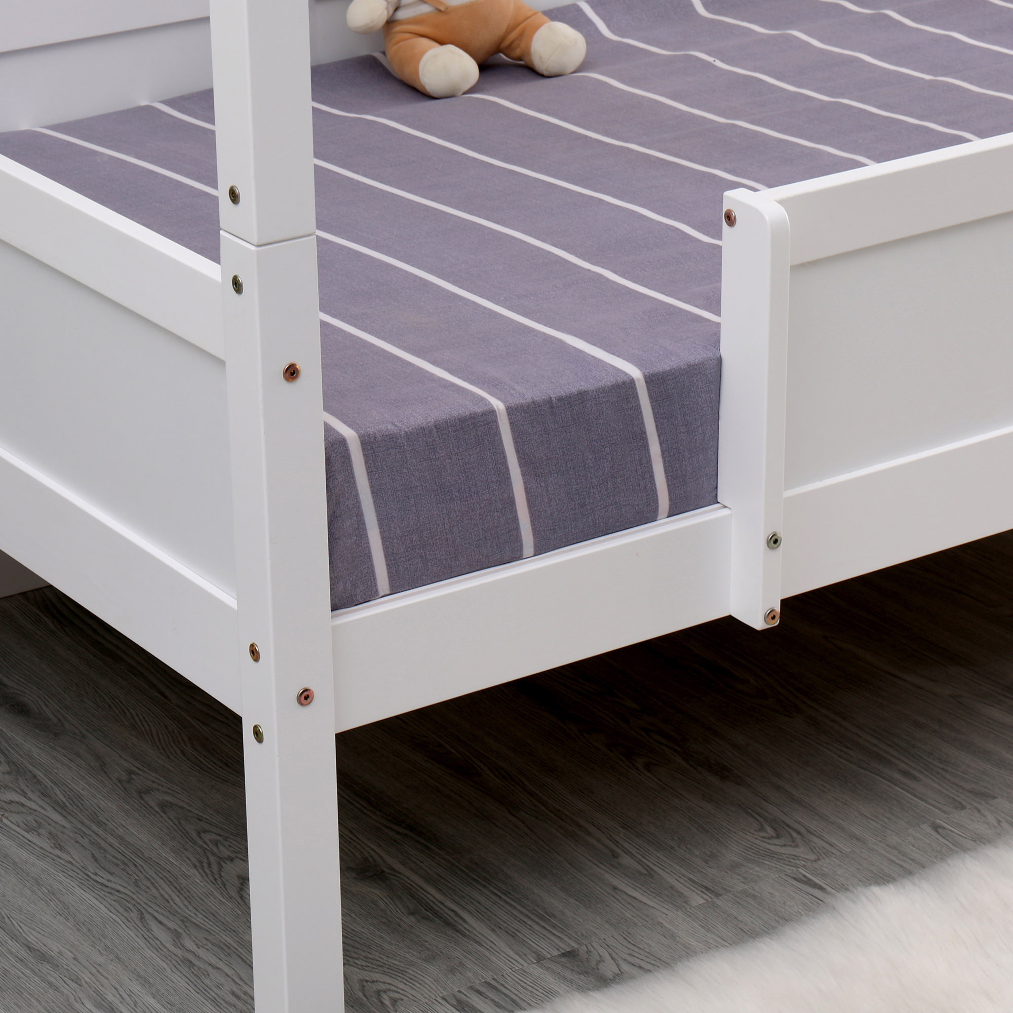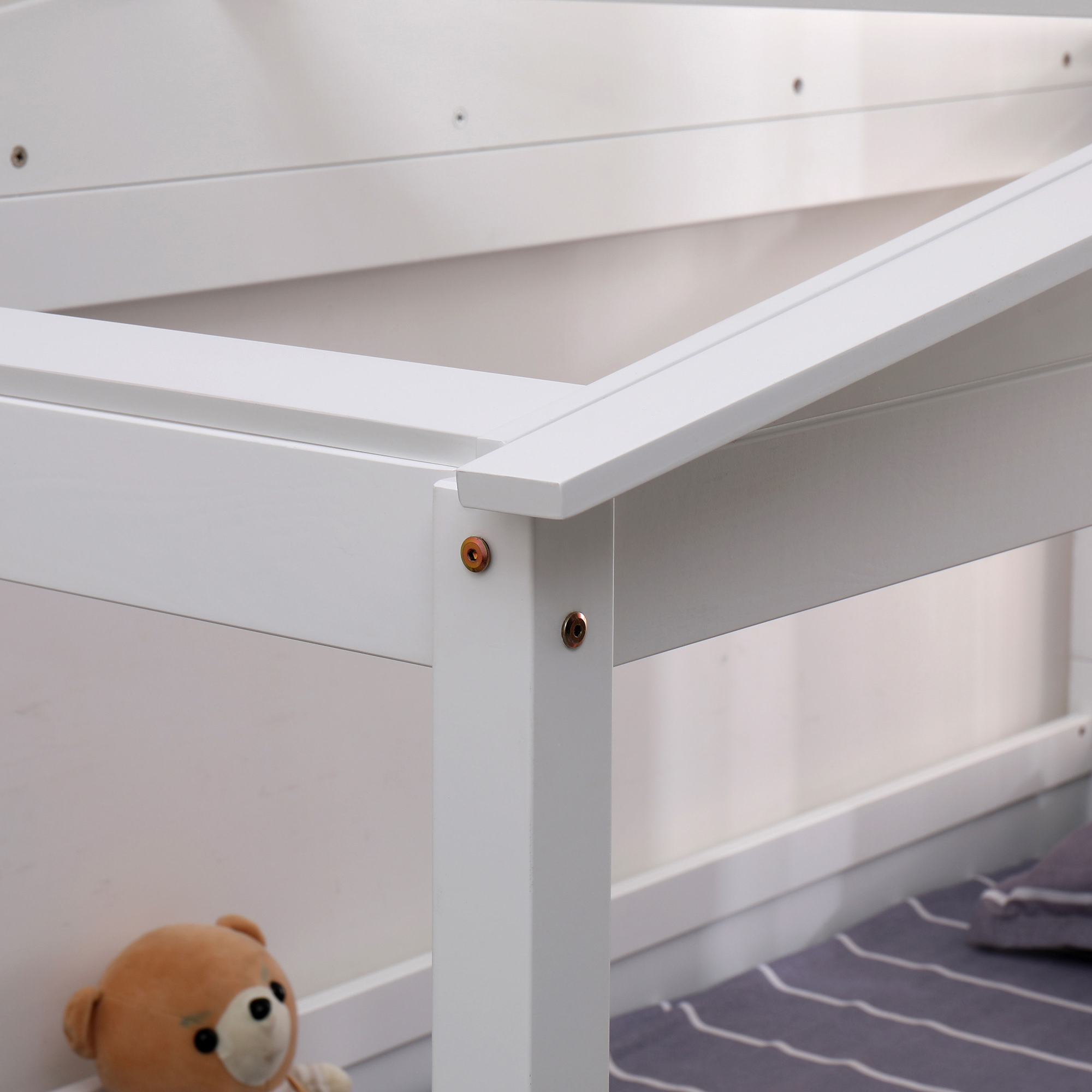 Dieses verspielte Kinderbett ist einem kleinen Häuschen nachempfunden und ein toller Platz zum Schlafen und Spielen. Das Gerüst aus massivem Kiefernholz ist leicht zu montieren und bietet eine hohe Stabilität. Das Bett ist ausgestattet mit einem offenen Schrägdach welches auf verschiedene Weise dekoriert werden kann und einem kleinen Fenster samt Rahmen. Der umlaufende Rausfallschutz sorgt für einen sicheren Schlaf und die Öffnung ermöglicht es alleine aus dem Bett zu steigen. Im Lieferumfang ist ebenfalls ein passender Rollrost enthalten.