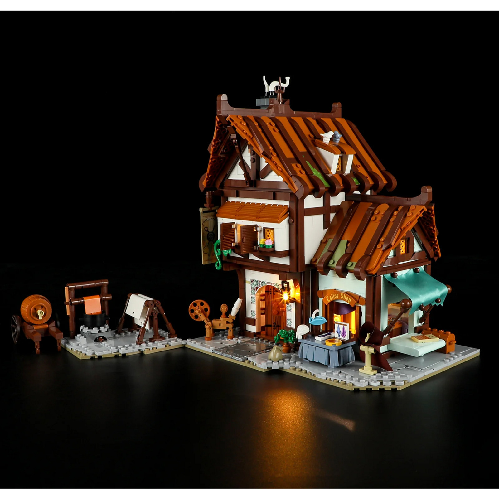 ProduktbeschreibungLumibricks – das ist Klemmbaustein-Bauspaß mit tollen Details und effektvoller Beleuchtung! Jedes Set bietet neben authentischer Gestaltung und passgenauen Teilen auch Beleuchtungszubehör, was das fertige Set im Dunkeln zu einem beeindruckenden Hingucker macht. Das gilt auch für die Sets der Mittelalter-Serie: Die mittelalterliche Schneiderei ist das Modelle eines Gebäudes aus dem 14. Jahrhundert. Die drei Stockwerke enthalten einen Verkaufsbereich, einen Raum zur Herstellung von Kleidung und einen Lagerbereich. Böden und Dächer lassen sich leicht lösen, es gibt drei drehbare Wände – für einfachen Zugang zu den Innenräumen. Es sind fünf Minifiguren enthalten und das Set kann mit den beiliegenden Leuchtelementen an 9 Leuchtpositionen beleuchtet werden.