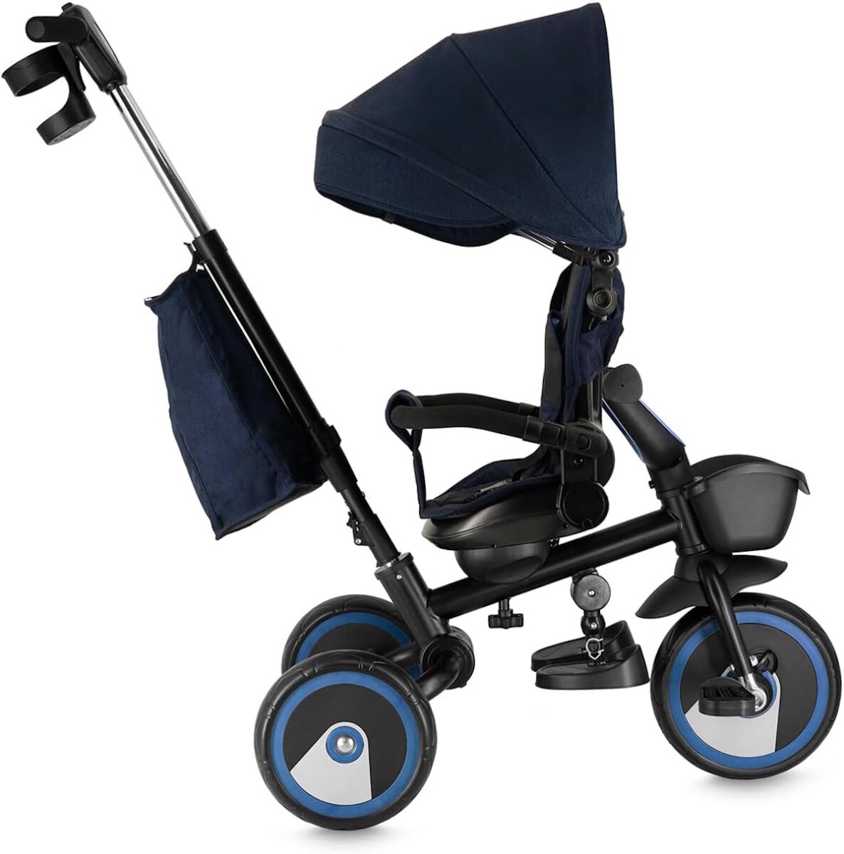 Wandelbares 3-in-1 Kinderdreirad in Blau mit 360° Sitz, 3-Punkt-Sicherheitsgurt, höhenverstellbarer Schiebestange und Sonnendach. Für Kinder ab 9 Monaten, max. 25 kg. Einfach montierbar.