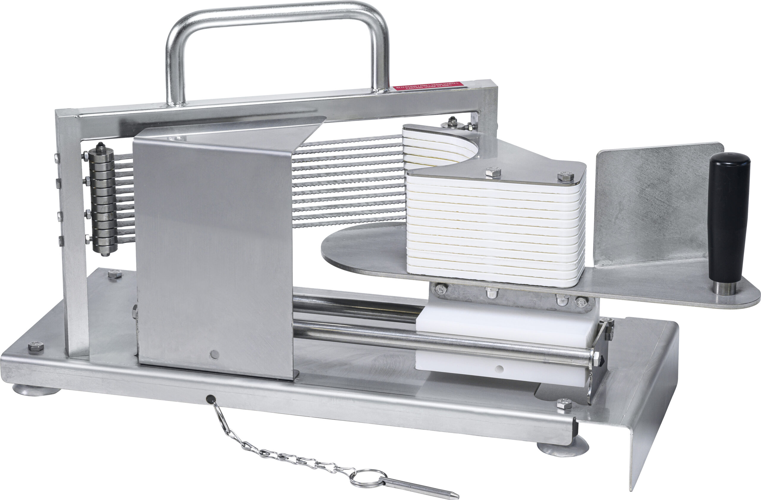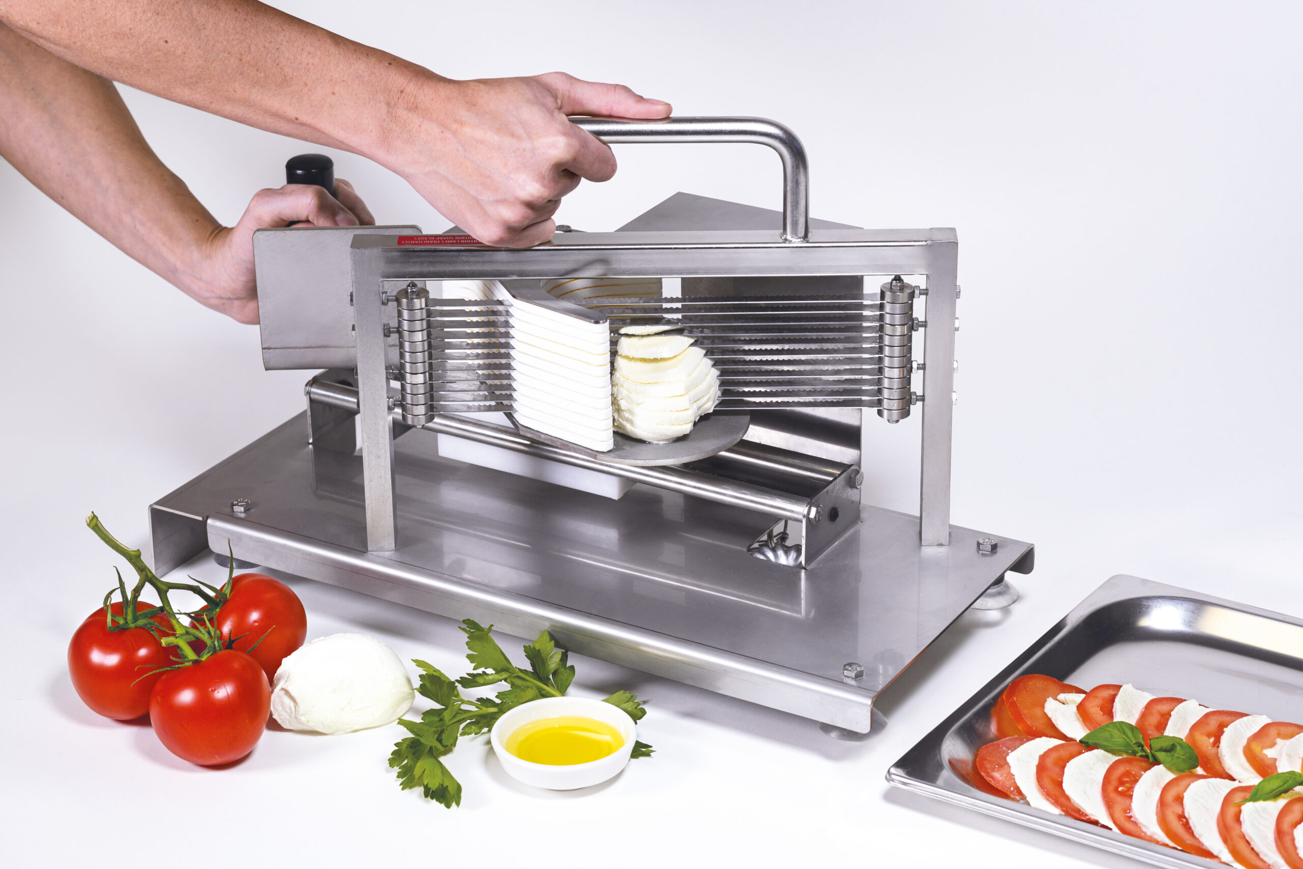 Für das Schneiden von Mozzarella und Tomaten in gleichmäßig dicke Scheiben n- Das ideale Werkzeug für die regelmäßige Zubereitung von Caprese n- Edelstahl n- Stabile Konstruktion von Rahmen und Führungsschienen n- Spezialmesser mit besonders scharfem Zahnschliff und Drücker optimiert für das Schneiden von Tomaten und Mozzarella n- Messersatz auswechselbar n- Schnittdicke 5,5 mm n- Erhöhter Auswurf: Tomaten können direkt in einen 65 mm tiefen GN-Behälter ausgeworfen werden n- Für die Reinigung im Geschirrspüler geeignet