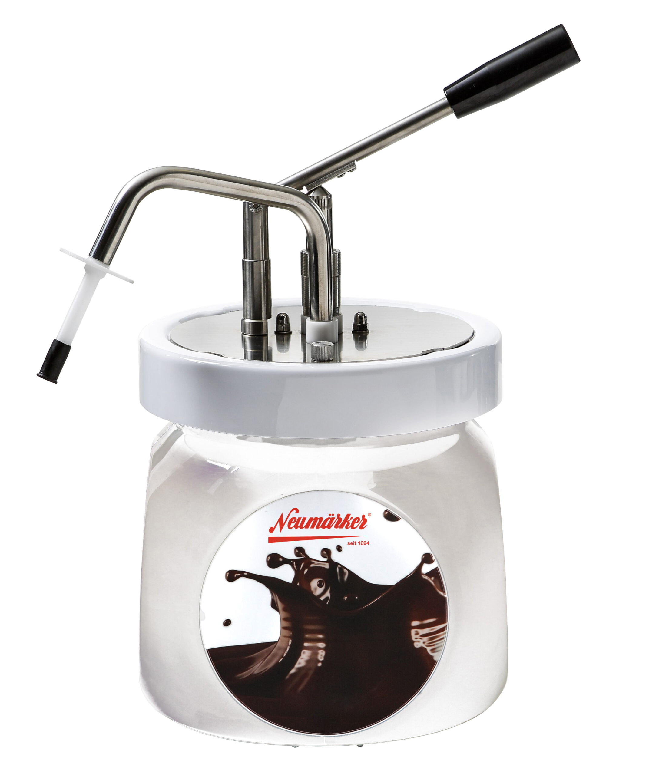 Praktische Pumpe zum Warmhalten und Portionieren von Nuss-Nougat-Creme. Besonders einfach: Die original 3-Liter-Eimer Nuss-Nougat-Creme können komplett in den Spender gestellt werden. Der Hahn hat die ideale Höhe, um Nuss-Nougat-Creme direkt auf den auf der Crêpesplatte liegenden Crêpes zu geben.