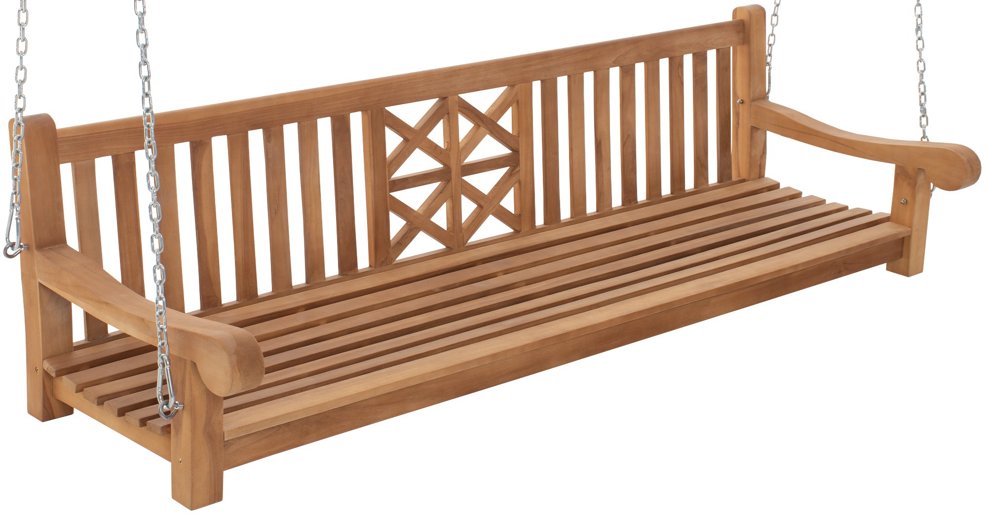 Die Gartenschaukel sieht mit dem schlichten Äußeren und der goldbraunen Farbe des Teakholzes schick aus und kann mit einer Vielzahl unterschiedlicher Einrichtungsstile kombiniert werden. Die Bank eignet sich ideal zum Entspannen. Sitzbereich und Rückenlehne sind leicht gewölbt, sodass die Sitzbank auch ohne Polster bequem ist. An den Seiten ist die Teakbank außerdem mit Armlehnen ausgestattet.