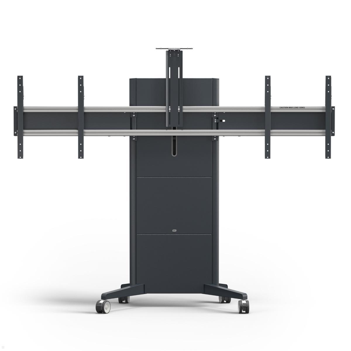 Der TV Ständer SMS Presence Mobile Motor VC 120 (K05-103-22) ist elektrisch höhenverstellbar und trägt 2 Displays mit jeweils bis zu 75 Zoll. Dank der leichtgängigen Rollen lassen sich Bildschirminhalte besonders flexibel präsentieren. Die maximale Tragkraft des Dual Monitorständers liegt bei 120 kg.