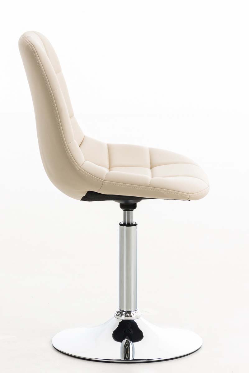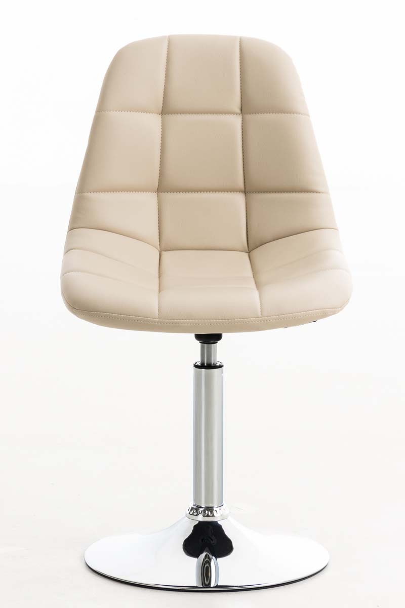 Stuhl Emil Der Drehstuhl Emil besticht durch seine komfortable Polsterung und einen schlanken, rundlichen Look. Rechteckige Ziernähte und klare Farbvarianten machen ihn zum optischen Highlight. Der filigrane Sitz ist mit einem Kunstlederbezug überzogen der auch ein ergonomisches Sitzen garantiert. Dabei steht er standsicher auf einem Trompetenfuß aus Metall in Chromoptik und ist um 360° drehbar.