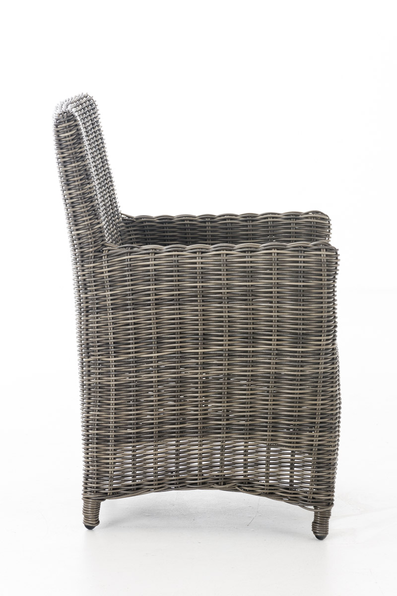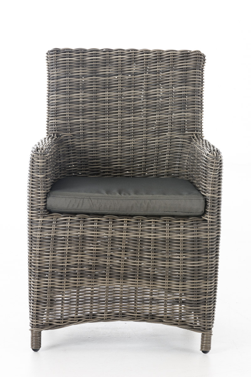 Das besonders gut für die Verwendung im Außenbereich geeignete UV-beständige Material Polyrattan sieht aus wie herkömmliches Rattangeflecht, ist aber viel robuster. Die hochwertig verarbeiteten Polyrattanfasern sind wasserfest, angenehm pflegeleicht und UV-beständig, sodass sie auch bei häufiger und langjähriger Nutzung unverändert ihre Farbtiefe behalten. Dieser edle Farbton sorgt in Kombination mit einer leichten Struktur für das absolut natürliche Erscheinungsbild dieser Sitzgruppe. Das bequeme Sitzkissen ist mit einem Bezug aus 100 % Polyester versehen. Dieser ist wasser- sowie schmutzabweisend und durch seine hohe Strapazierfähigkeit sehr lange haltbar. Der Rahmen bzw. das Untergestell der Garnitur ist jeweils aus stabilem, pulverbeschichtetem Aluminium gefertigt – garantiert stabil und dauerhaft rostfrei.