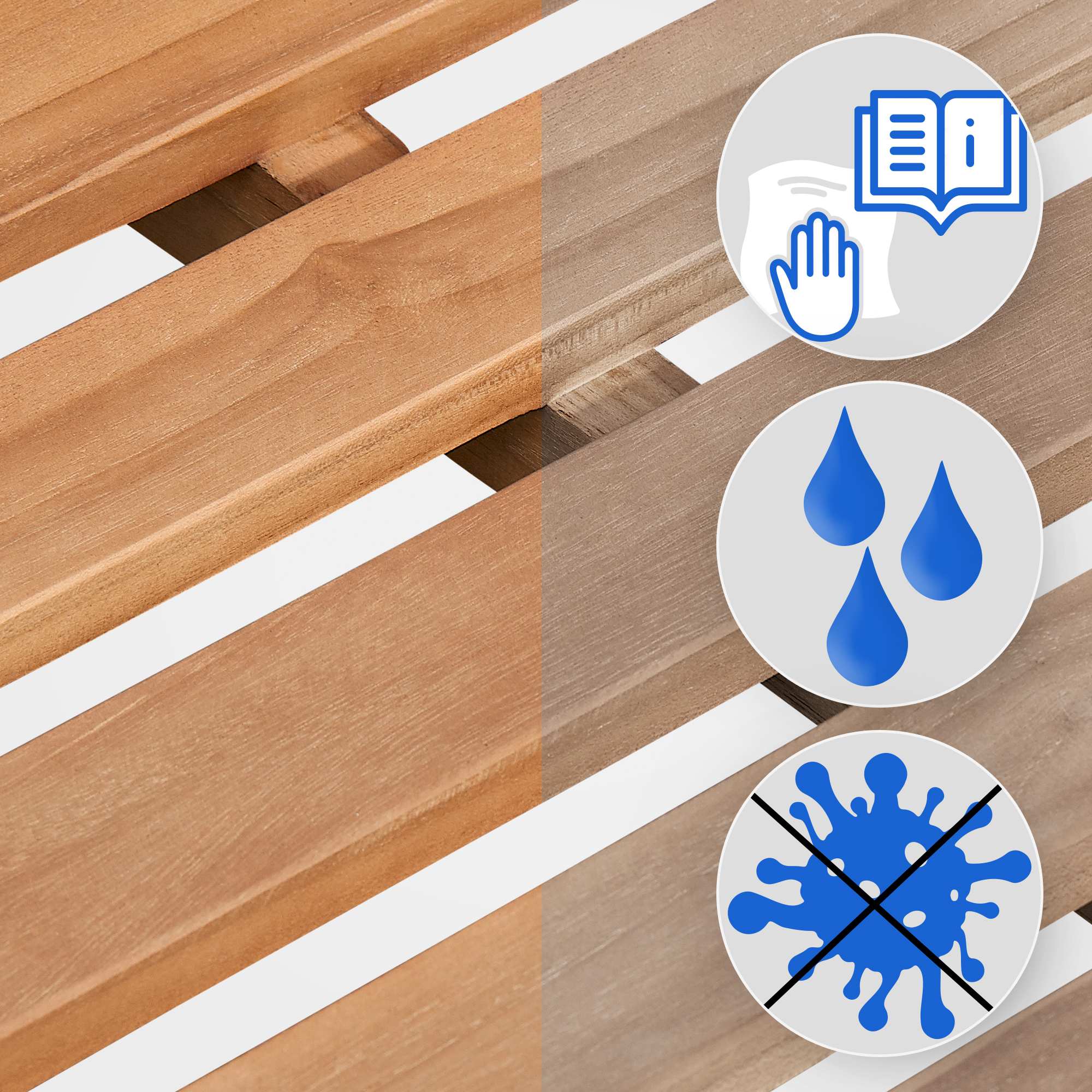 Das verwendete Teakholz ist absolut wetterfest, sodass die Bank ganzjährig der Witterung ausgesetzt werden kann. Auch Frost und Schnee schadet dem Holz nicht, während das massive Holz verhindert, dass sich Schimmel oder Fäule bilden. Wenn kein Teak-Öl angewendet wird, wird das Holz lediglich eine graue Patina erhalten, was der Langlebigkeit und Stabilität keinen Abbruch tut.