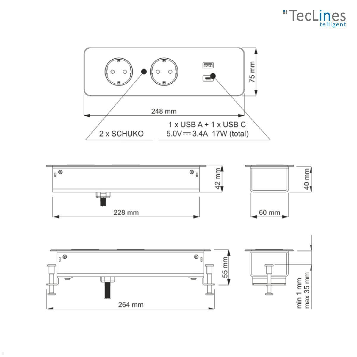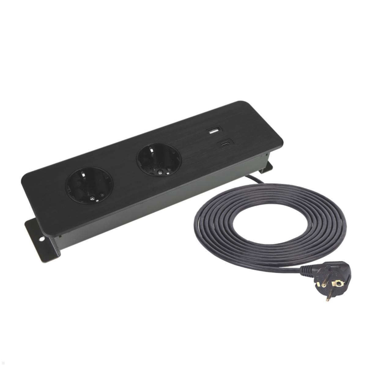 Home » Shop »TecLines TES017B 2-fach Einbausteckdose mit USB A/C Charger, 1,5 m Kabel, schwarz